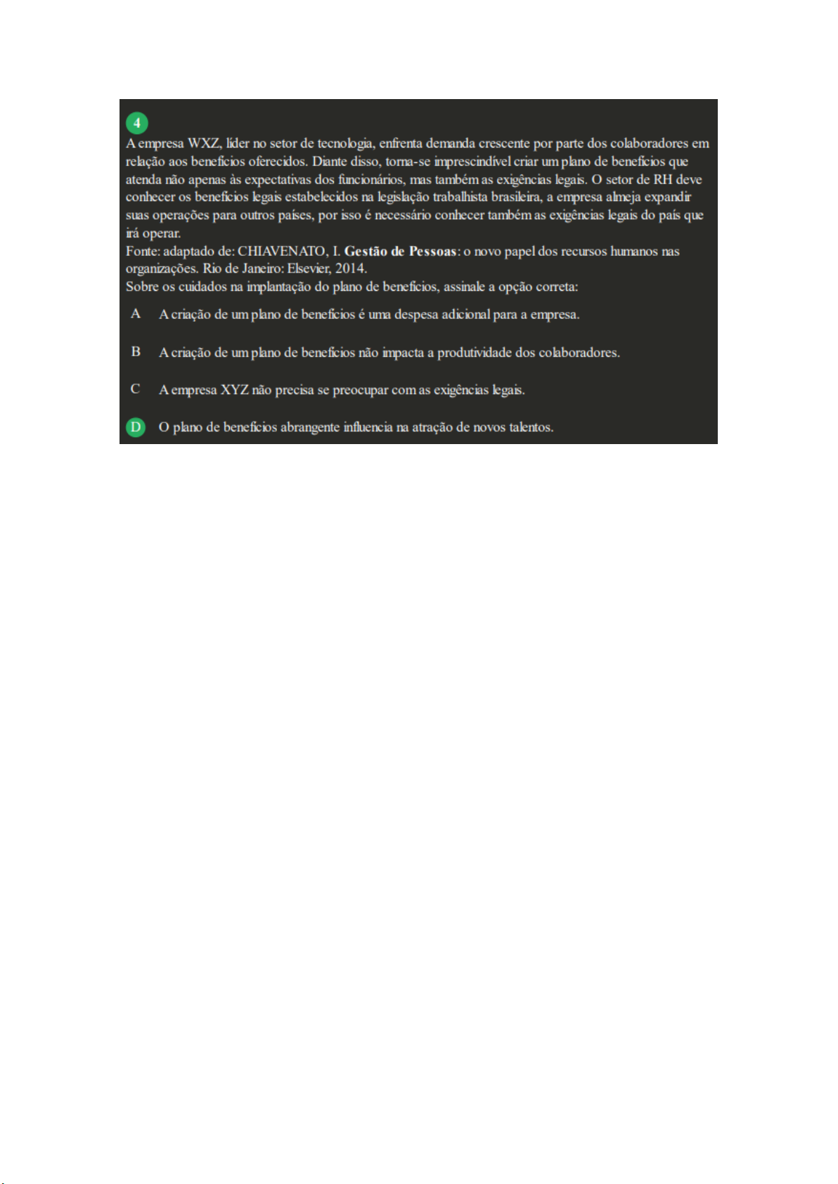 4 A empresa WXZ, líder no setor de tecnologia, enfrenta demanda crescente por parte dos colaboradores em relação aos beneficios oferecidos. Diante disso, torna-se imprescindível criar um plano de beneficios que atenda não apenas às expectativas dos funcionários, mas também as exigências legais. setor de RH deve conhecer os legais estabelecidos na legislação trabalhista brasileira, a empresa almeja expandir suas operações para outros países, por isso é necessário conhecer também as exigências legais do país que irá operar. Fonte: adaptado de: CHIAVENATO, I. Gestão de Pessoas: novo papel dos recursos humanos nas organizações. Rio de Janeiro: Elsevier, 2014. Sobre os cuidados na implantação do plano de beneficios, assinale a opção correta: A A criação de um plano de é uma despesa adicional para a empresa. A criação de um plano de não impacta a produtividade dos colaboradores. C A empresa XYZ não precisa se preocupar com as exigências legais. D 0 plano de beneficios abrangente influencia na atração de novos talentos.