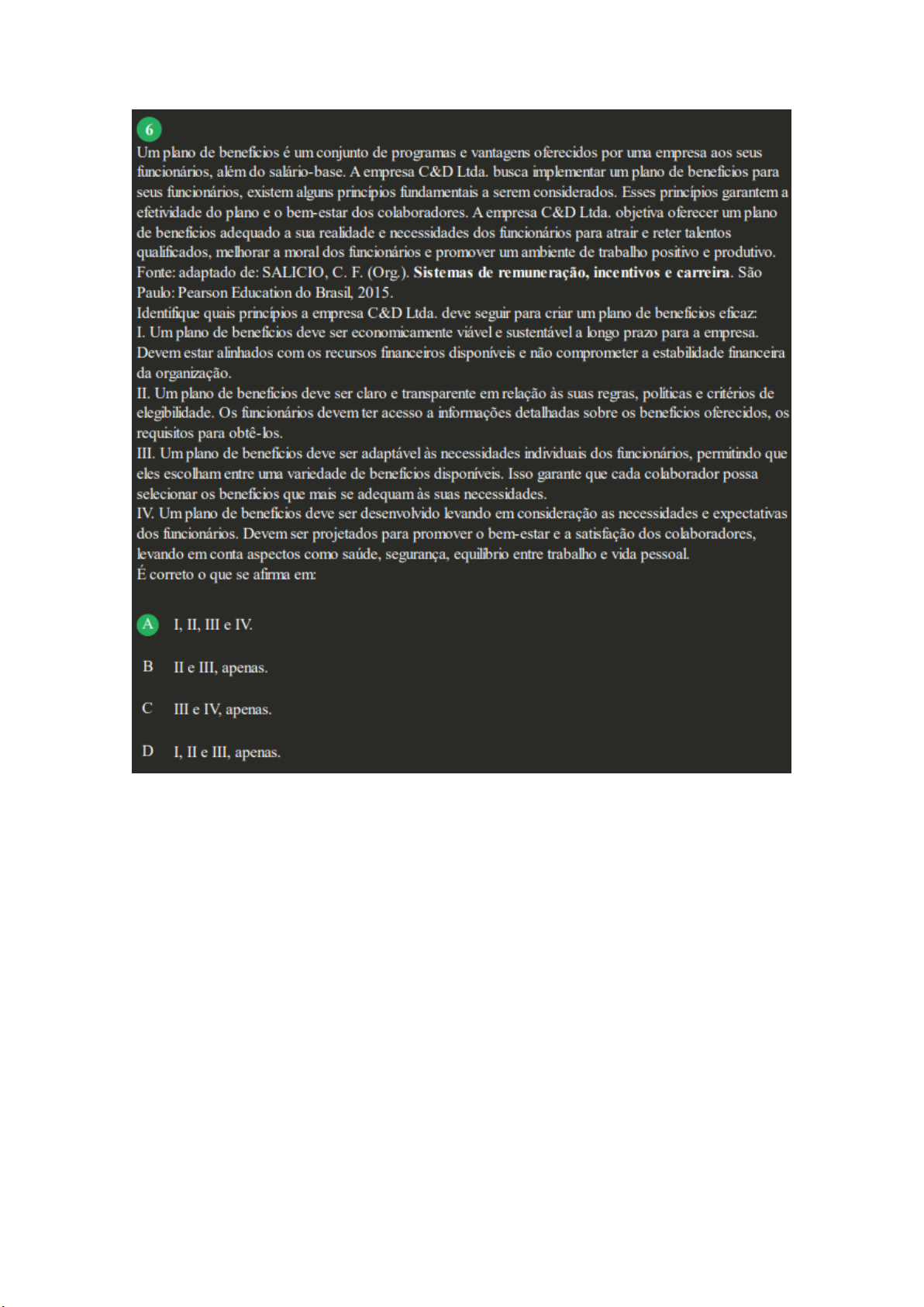 6 Um plano de beneficios é um conjunto de programas e vantagens oferecidos por uma empresa aos seus funcionários, além do salário-base. A empresa C&D Ltda. busca implementar um plano de beneficios para seus funcionários, existem alguns princípios fundamentais a serem considerados. Esses princípios garantem a efetividade do plano e bem-estar dos colaboradores. A empresa C&D Ltda. objetiva oferecer um plano de beneficios adequado a sua realidade e necessidades dos funcionários para atrair e reter talentos qualificados, melhorar a moral dos funcionários e promover um ambiente de trabalho positivo e produtivo. Fonte: adaptado de: SALICIO, C.F. (Org.). Sistemas de remuneração, incentivos e carreira. São Paulo: Pearson Education do Brasil, 2015. Identifique quais princípios a empresa C&D Ltda. deve seguir para criar um plano de beneficios eficaz: I. Um plano de benefícios deve ser economicamente viável e sustentável a longo prazo para a empresa. Devem estar alinhados com os recursos financeiros disponíveis e não comprometer a estabilidade financeira da organização. II. Um plano de deve ser claro e transparente em relação às suas regras, políticas e critérios de elegibilidade. Os funcionários devem ter acesso a informações detalhadas sobre os beneficios oferecidos, os requisitos para obtê-los. III. Um plano de beneficios deve ser adaptável às necessidades individuais dos funcionários, permitindo que eles escolham entre uma variedade de beneficios disponíveis. Isso garante que cada colaborador possa selecionar os beneficios que mais se adequam às suas necessidades. IV. Um plano de beneficios deve ser desenvolvido levando em consideração as necessidades e expectativas dos funcionários. Devem ser projetados para promover bem-estar e a satisfação dos colaboradores, levando em conta aspectos como saúde, segurança, equilibrio entre trabalho e vida pessoal. É correto que se afirma em: A I, II, III e IV. II e III, apenas. C III e IV, apenas. D I, II e III, apenas.