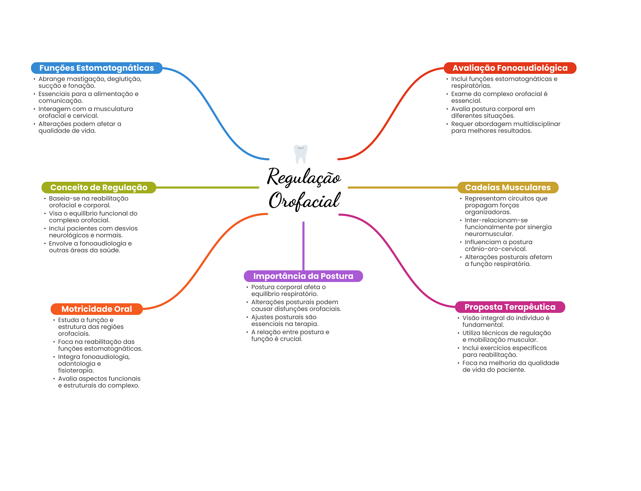 Funções Estomatognáticas Avaliação Fonoaudiológica Abrange mastigação, deglutição, Inclui funções estomatognáticas e sucção e fonação. respiratórias. Essenciais para a alimentação e Exame do complexo orofacial é comunicação. essencial. Interagem com a musculatura Avalia postura corporal em orofacial e cervical. diferentes situações. Alterações podem afetar a Requer abordagem multidisciplinar qualidade de vida. para melhores resultados. Regulação Conceito de Regulação Cadeias Musculares Baseia-se na reabilitação Orofacial Representam circuitos que orofacial e corporal. propagam forças Visa O equilíbrio funcional do organizadoras. complexo orofacial. Inter-relacionam-se Inclui pacientes com desvios funcionalmente por sinergia neurológicos e normais. neuromuscular. Envolve a fonoaudiologia e Influenciam a postura outras áreas da saúde. Alterações posturais afetam a função respiratória. Importância da Postura Postura corporal afeta equilíbrio respiratório. Alterações posturais podem Motricidade Oral causar disfunções orofaciais. Proposta Terapêutica Estuda a função e Ajustes posturais são Visão integral do indivíduo é estrutura das regiões essenciais na terapia. fundamental. orofaciais. A relação entre postura e Utiliza técnicas de regulação Foca na reabilitação das função é crucial. e mobilização muscular. funções estomatognáticas. Inclui exercícios específicos Integra fonoaudiologia, para reabilitação. odontologia e Foca na melhoria da qualidade fisioterapia. de vida do paciente. Avalia aspectos funcionais e estruturais do complexo.