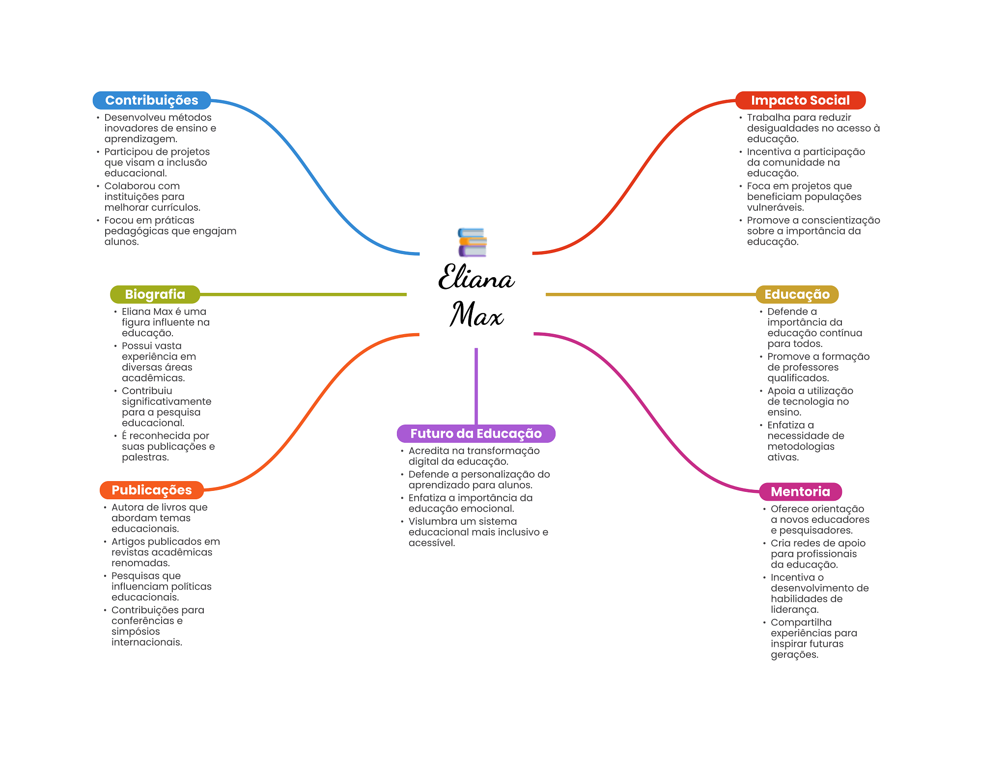 Contribuições Impacto Social Desenvolveu métodos Trabalha para reduzir inovadores de ensino e desigualdades no acesso à aprendizagem. educação. Participou de projetos Incentiva a participação que visam a inclusão da comunidade na educacional. educação. Colaborou com Foca em projetos que instituições para beneficiam populações melhorar currículos. vulneráveis. Focou em práticas Promove a conscientização pedagógicas que engajam sobre a importância da alunos. educação. Eliana Biografia Educação Eliana Max é uma figura influente na Max Defende a importância da educação. educação contínua Possui vasta para todos. experiência em Promove a formação diversas áreas de professores acadêmicas. qualificados. Contribuiu Apoia a utilização significativamente de tecnologia no para a pesquisa ensino. educacional. Enfatiza a É reconhecida por Futuro da Educação necessidade de suas publicações e Acredita na transformação metodologias palestras. digital da educação. ativas. Defende a personalização do Publicações aprendizado para alunos. Mentoria Enfatiza a importância da Autora de livros que educação emocional. Oferece orientação abordam temas Vislumbra um sistema a novos educadores educacionais. educacional mais inclusivo e e pesquisadores. Artigos publicados em acessível. Cria redes de apoio revistas acadêmicas para profissionais renomadas. da educação. Pesquisas que Incentiva influenciam políticas desenvolvimento de educacionais. habilidades de Contribuições para liderança. conferências e Compartilha simpósios experiências para internacionais. inspirar futuras gerações.