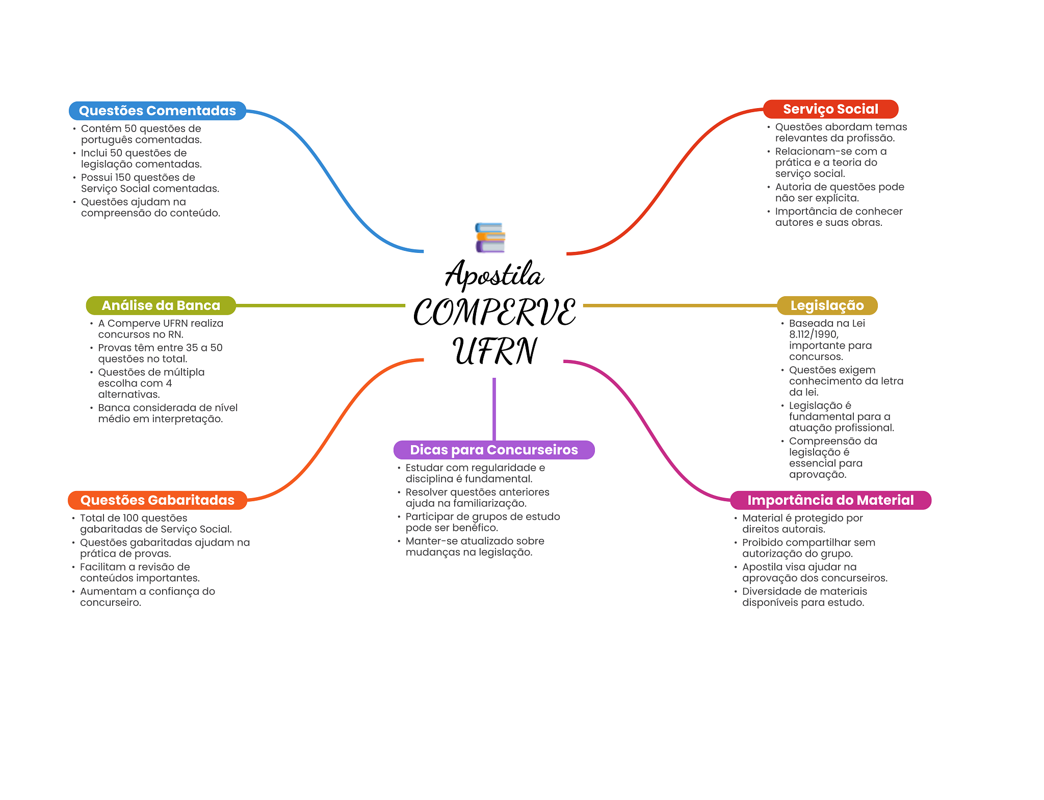 Questões Comentadas Serviço Social Contém 50 questões de Questões abordam temas português comentadas. relevantes da profissão. Inclui 50 questões de Relacionam-se com a legislação comentadas. prática e a teoria do Possui 150 questões de serviço social. Serviço Social comentadas. Autoria de questões pode Questões ajudam na não ser explícita. compreensão do conteúdo. Importância de conhecer autores e suas obras. Apostila Análise da Banca COMPERVE Legislação A Comperve UFRN realiza Baseada na Lei concursos no RN. 8.112/1990, Provas têm entre 35 a 50 UFRN importante para questões no total. concursos. Questões de múltipla Questões exigem escolha com 4 conhecimento da letra alternativas. da lei. Banca considerada de nível Legislação é médio em interpretação. fundamental para a atuação profissional. Compreensão da Dicas para Concurseiros legislação é Estudar com regularidade e essencial para disciplina é fundamental. aprovação. Resolver questões anteriores Questões Gabaritadas ajuda na familiarização. Importância do Material Total de 100 questões Participar de grupos de estudo Material é protegido por gabaritadas de Serviço Social. pode ser benéfico. direitos autorais. Questões gabaritadas ajudam na Manter-se atualizado sobre Proibido compartilhar sem prática de provas. mudanças na legislação. autorização do grupo. Facilitam a revisão de Apostila visa ajudar na conteúdos importantes. aprovação dos concurseiros. Aumentam a confiança do Diversidade de materiais concurseiro. disponíveis para estudo.