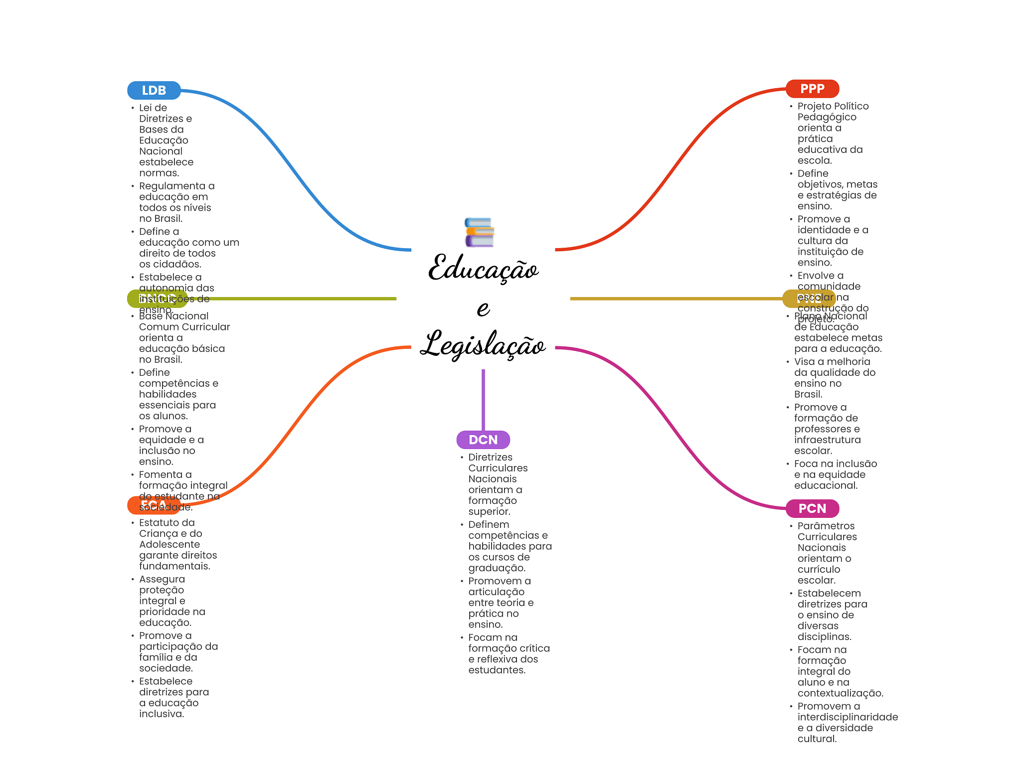 LDB PPP Lei de Projeto Político Diretrizes e Pedagógico Bases da orienta a Educação prática Nacional educativa da estabelece escola. normas. Define Regulamenta a objetivos, metas educação em e estratégias de todos níveis ensino. no Brasil. Promove a Define a identidade e a educação como um cultura da direito de todos instituição de OS cidadãos. Educação ensino. Estabelece a Envolve a autonomia das comunidade ões de escolar na ensing e construção do Base Nacional Comum Curricular de Educação orienta a Legislação estabelece metas educação básica para a educação. no Brasil. Visa a melhoria Define da qualidade do competências e ensino no habilidades Brasil. essenciais para Promove a alunos. formação de Promove a professores e equidade e a DCN infraestrutura inclusão no escolar. Diretrizes ensino. Curriculares Foca na inclusão Fomenta a Nacionais e na equidade formação integral educacional. orientam a do estudante na formação superior. PCN Estatuto da Definem Parâmetros Criança e do competências e Curriculares Adolescente habilidades para Nacionais garante direitos cursos de orientam o fundamentais. graduação. currículo Assegura Promovem a escolar. proteção articulação Estabelecem integral e entre teoria e diretrizes para prioridade na prática no ensino de educação. ensino. diversas Promove a Focam na disciplinas. participação da formação crítica Focam na família e da e reflexiva dos formação sociedade. estudantes. integral do Estabelece aluno e na diretrizes para contextualização. a educação Promovem a inclusiva. interdisciplinaridade e a diversidade cultural.