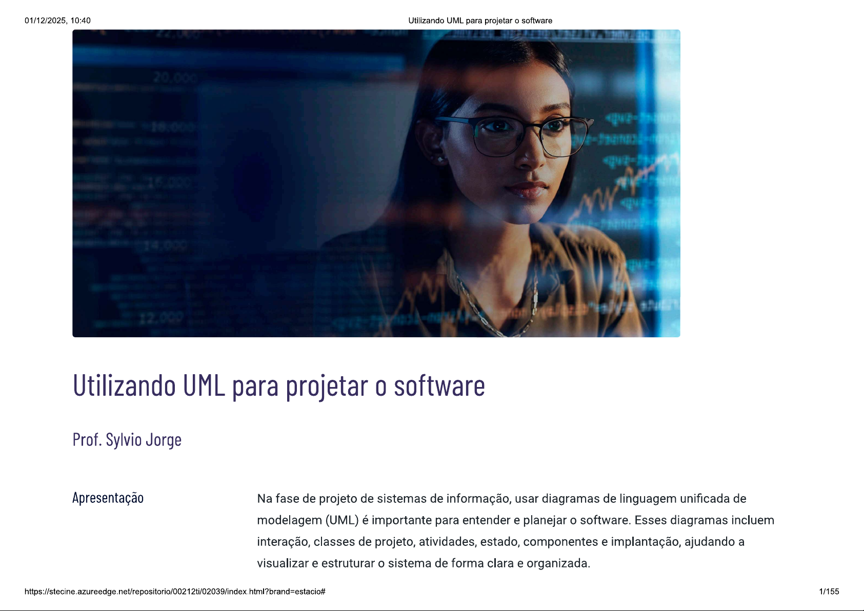 01/12/2025, 10:40 Utilizando UML para projetar software 20,000 Utilizando UML para projetar software Prof. Sylvio Jorge Apresentação Na fase de projeto de sistemas de informação, usar diagramas de linguagem unificada de modelagem (UML) é importante para entender e planejar software. Esses diagramas incluem interação, classes de projeto, atividades, estado, componentes e implantação, ajudando a visualizar e estruturar sistema de forma clara e organizada. https://stecine.azureedge.net/repositorio/00212ti/02039/index.html?brand=estacio 1/15501/12/2025, 10:40 Utilizando UML para projetar software Propósito Preparação Antes de iniciar conteúdo, é indicado que seja instalado em seu computador um programa que lhe permita elaborar modelos, sob a forma de diagramas da UML (linguagem unificada de modelagem). Nossa sugestão inicial é Astah Free Student License e será necessário usar seu e- mail institucional para ativar a licença. Preencha os dados do formulário no site do software, envie e aguarde a liberação de sua licença em seu e-mail. Ao recebê-la, siga as instruções e instale produto em seu computador. Sugestões de links adicionais de programas livres para modelagem de sistemas em UML (UML Tools) podem ser encontradas em buscas na internet. Objetivos Módulo 1 Módulo 2 Diagramas de interação no projeto de Diagrama de classes da análise no sistema projeto de sistema 2/15501/12/2025, 10:40 Utilizando UML para projetar software Empregar os diagramas de interação no projeto de sistema. Revisar diagrama de classes da análise no projeto de sistema. Módulo 3 Módulo 4 Diagramas de estado e de atividades no Diagramas de componentes e de projeto de sistema implantação Empregar os diagramas de estado e de atividades no projeto Empregar os diagramas de componentes e de implantação. de sistema. Introdução A modelagem de um software pode, de fato, determinar a quantidade de problemas que terão que ser tratados durante desenvolvimento. Softwares de 3/15501/12/2025, 10:40 Utilizando UML para projetar software sucesso, que têm sua implantação quase sem nenhum tipo de erro, certamente contaram com um bom processo de modelagem durante seu desenvolvimento. Ou seja, um bom produto de software é sempre concebido por um bom processo de desenvolvimento, iniciado com a modelagem do sistema. processo de desenvolvimento conta com diversos métodos e técnicas para que produto tenha a melhor qualidade possível, sendo a modelagem uma das técnicas utilizadas. Modelar algo é construir uma representação abstrata de um artefato do mundo real. A modelagem conta com diversas regras e diretrizes que têm que ser respeitadas para se construir um modelo de qualidade para software. Todas as funcionalidades implementadas pelo software, assim como todos os elementos de dados que utilize e as regras que devem ser seguidas, precisam ser pensadas, discutidas e estruturadas antes do início de sua construção, de modo que haja um completo entendimento de todo esse universo, não só por parte dos usuários, mas também dos desenvolvedores. Saber identificar cada característica do software durante seu projeto é importante para que venha de fato atender às necessidades dos usuários e cumprir com todas as regras a serem executadas por ele. Vamos entender como construir os diagramas ao longo da etapa de projeto (ou design) de software. Nesta parte do desenvolvimento, alguns outros diagramas já terão sido construídos e precisam ser respeitadas suas regras e definições. Para isso, vamos ver as técnicas de concepção e de modelagem desses diagramas, 4/15501/12/2025, 10:40 Utilizando UML para projetar o software assim como seus atributos e modelos. Por fim, vamos apresentar e discutir como aplicá-los. vídeo Introdução, a seguir, vai apresentar como utilizar UML para projetar software, com destaque para emprego dos diagramas de interação, classes, estado, atividades, componentes e de implantação na etapa de projeto. Para assistir a um vídeo sobre assunto, acesse a versão online deste conteúdo. -0 Material para download Clique no botão abaixo para fazer download do conteúdo completo em formato PDF. Download material 5/15501/12/2025, 10:40 Utilizando UML para projetar software AI 1 - Diagramas de interação no projeto de sistema Ao final deste módulo, você será capaz de empregar diagramas de interação no projeto de sistema. 6/15501/12/2025, 10:40 Utilizando UML para projetar o software Diagramas de comunicação e de sequência na UML Em sistemas computacionais orientados a objetos, as funcionalidades são realizadas por meio da colaboração. Os objetos interagem, executando, assim, os casos de uso. Na UML, essas interações são representadas por diagramas de interação, que mostram comportamento dinâmico do sistema ao descrever fluxo de mensagens entre objetos. Existem dois tipos principais: diagramas de interação de comunicação e de sequência. Eles ajudam a detalhar e refinar outros modelos, fornecendo aos programadores uma visão clara dos objetos e mensagens envolvidos nos casos de uso do sistema. Observe exemplos desses diagramas, a seguir: Neste vídeo, conheça as atividades típicas de um processo de desenvolvimento de software e os cenários possíveis de aplicação dos diagramas de interação. 7/15501/12/2025, 10:40 Utilizando UML para projetar software Para assistir a um vídeo sobre assunto, acesse a versão online deste conteúdo. Atividades do desenvolvimento de software Independentemente do processo adotado, as atividades típicas de um processo de desenvolvimento de software, geralmente, compreendem as seguintes etapas: 1. Levantamento de requisitos 2. Análise 3. Projeto (design) 4. Implementação 5. Testes 6. Implantação Essas atividades são realizadas por etapas ou fases, em que uma etapa depende dos artefatos resultantes das anteriores. Neste conteúdo, focaremos na etapa de projeto 8/15501/12/2025, 10:40 Utilizando UML para proje