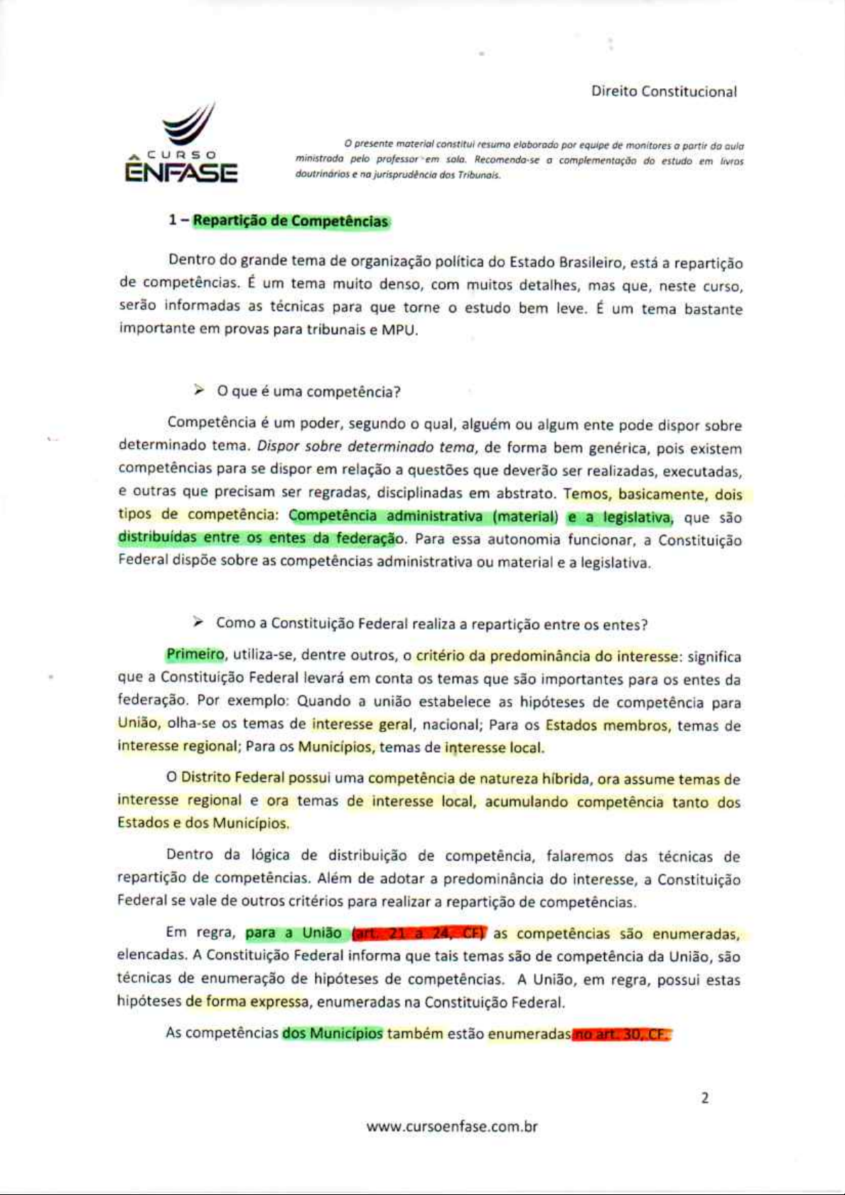 Direito Constitucional presente material constitui resumo elaborado por equipe de monitores a partir do CURSO ministrada pelo professor em Recomenda-se complementação do estudo em livros ENFASE doutrinários e jurisprudência dos 1 Repartição de Competências Dentro do grande tema de organização política do Estado Brasileiro, está a repartição de competências. É um tema muito denso, com muitos detalhes, mas que, neste curso, serão informadas as técnicas para que torne o estudo bem leve. É um tema bastante importante em provas para tribunais e MPU. 0 que é uma competência? Competência é um poder, segundo o qual, alguém ou algum ente pode dispor sobre determinado tema. Dispor sobre determinado tema, de forma bem genérica, pois existem competências para se dispor em relação a questões que deverão ser realizadas, executadas, e outras que precisam ser regradas, disciplinadas em abstrato. Temos, basicamente, dois tipos de competência: Competência administrativa (material) e a legislativa, que são distribuídas entre os entes da federação. Para essa autonomia funcionar, a Constituição Federal dispõe sobre as competências administrativa ou material e a legislativa. Como a Constituição Federal realiza a repartição entre os entes? Primeiro, utiliza-se, dentre outros, o critério da predominância do interesse: significa que a Constituição Federal levará em conta os temas que são importantes para os entes da federação. Por exemplo: Quando a união estabelece as hipóteses de competência para União, olha-se os temas de interesse geral, nacional; Para os Estados membros, temas de interesse regional; Para os Municípios, temas de interesse local. 0 Distrito Federal possui uma competência de natureza híbrida, ora assume temas de interesse regional e ora temas de interesse local, acumulando competência tanto dos Estados e dos Dentro da lógica de distribuição de competência, falaremos das técnicas de repartição de competências. Além de adotar a predominância do interesse, a Constituição Federal se vale de outros critérios para realizar a repartição de competências. Em regra, para a União 21 a 24, CF) as competências são enumeradas, elencadas. A Constituição Federal informa que tais temas são de competência da União, são técnicas de enumeração de hipóteses de competências. A União, em regra, possui estas hipóteses de forma expressa, enumeradas na Constituição Federal. As competências dos Municípios também estão enumeradas 30, 2Direito Constitucional presente material constitui resumo elaborado por equipe de monitores a partir CURSO ministrada pelo professor em sala. complementação do estudo em livros ENFASE doutrinários e no dos Para os Estados-membros a regra muda, a competência é residual, reservada, é que sobra 25 CF). Existem exceções, que são casos específicos onde as competências dos Estados estão enumeradas, fugindo a regra geral, que são: a) Competência em relação a gás canalizado 25 b) Competência em relação às regiões metropolitanas (art. 25, CF). Para DF, é a situação hibrida, uma mescla de competências entre a dos Estados e dos 326 CF). Existem alguns assuntos que, embora de interesse do DF, são tuteladas parcialmente pela União, assim, existem assuntos que possuem interesse diretamente no DF, que são regulados, administrados pela União 21, XIV e 22, CF) Essa é a estrutura geral de repartição de competência. Para fins de prova, a predominância de interesse é fundamental de ser analisada. As competências da União estão relacionadas em aproximadamente oitenta e dois incisos, e o professor dará dicas de como fazer para reduzir e facilitar a forma de acerto em provas, muitas delas pelo bom senso na análise de questões. 1.1 Competência dos Municípios Previsão legal: art. 30, CF. Art. 30. Compete aos Municípios: / legislar sobre assuntos de interesse local; Essa é a regra, porém se 0 assunto estiver expressamente atribuído a outro ente da federação, não se valerá desta prerrogativa da legislação sobre assuntos de interesse local. SUM 645, STF É competente o município para fixar o horário de funcionamento de estabelecimento comercial. suplementar a legislação federal e a estadual no que couber; instituir e arrecadar os tributos de sua competência, bem como aplicar suas rendas, sem prejuízo da obrigatoriedade de prestor contas e publicar balancetes nos prazos fixados em lei; Exemplo: instituição e arrecadação do imposto sobre propriedade territorial urbana IPTU 3 www.cursoenfase.com.brDireito Constitucional presente material constitui resumo por equipe de monitores portir do CURSO ministrada pelo professor em Recomenda-se complementação do estudo em livros ENFASE doutrinários e no jurisprudência dos IV criar, organizar e suprimir distritos, observada legislação estadual; É muito comum que alguns municípios tenham divisões administrativas, criação de distritos, para uma melhor organização administrativa. Em todas as aulas de competências serão analisados todos os dispositivos sobre competências, pode ser cansativo, mas é fundamental a leitura dos dispositivos constitucionais que tratam do tema. Necessário voltar à leitura destes dispositivos várias vezes. Não desanimem! V organizar e prestar, diretamente ou sob regime de concessão ou permissão, os serviços públicos de interesse local, incluído de transporte coletivo, que tem caráter essencial; VI manter, com a cooperação técnica e financeira da União e do Estado, programas de educação infantil e de ensino fundamental; Dica para Prova CUIDADO! Legislar sobre diretrizes e bases da educação nacional é competência privativa da União CF), não é a mesma da competência dos (programa de educação infantil e de ensino fundamental). Art. 22. Compete privativamente à União legislar sobre: (...) XXIV diretrizes e bases da educação nacional; Legislar sobre educação, 