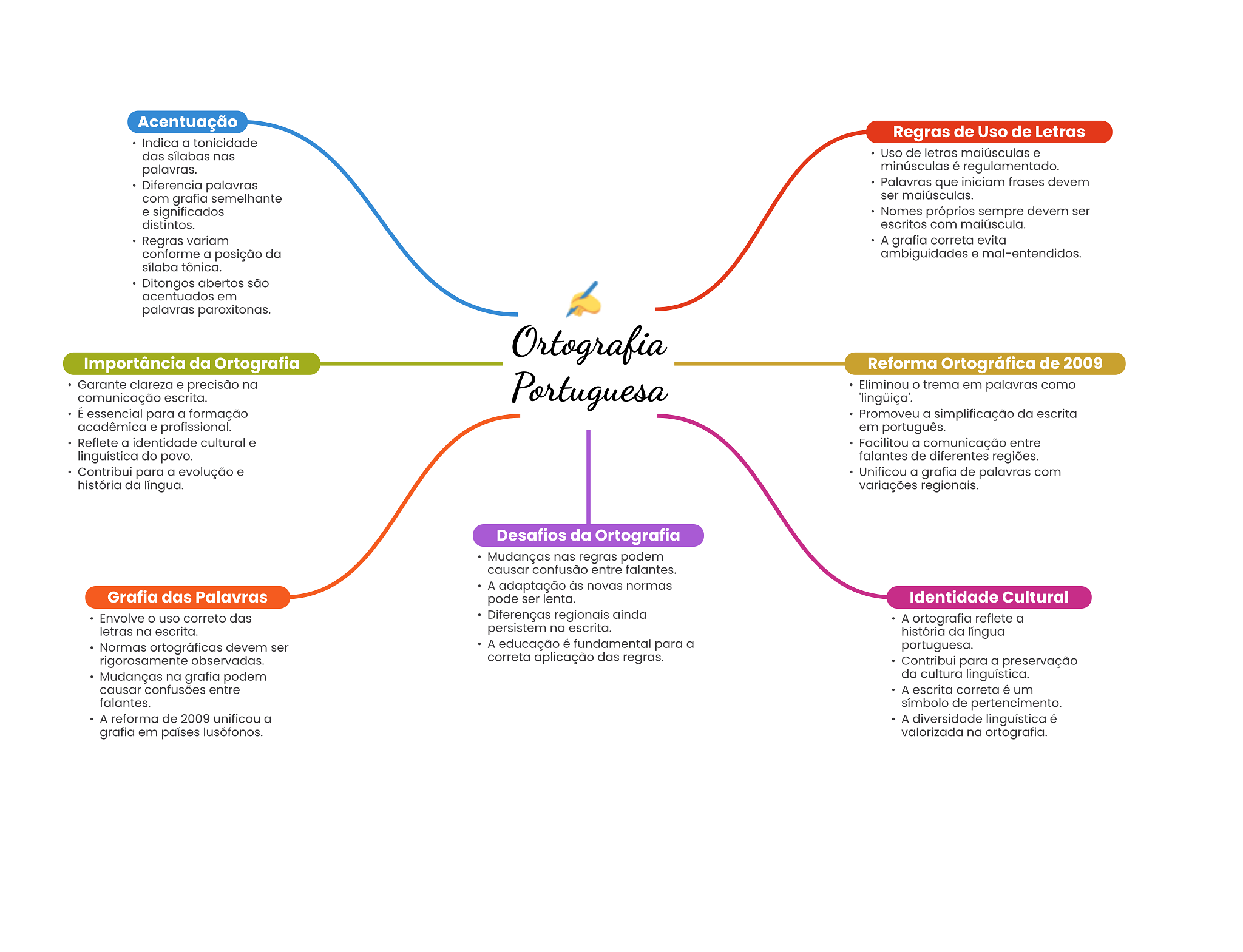Acentuação Regras de Uso de Letras Indica a tonicidade das sílabas nas Uso de letras maiúsculas e palavras. minúsculas é regulamentado. Diferencia palavras Palavras que iniciam frases devem com grafia semelhante ser maiúsculas. e significados Nomes próprios sempre devem ser distintos. escritos com maiúscula. Regras variam A grafia correta evita conforme a posição da ambiguidades e mal-entendidos. sílaba tônica. Ditongos abertos são acentuados em palavras paroxítonas. Ortografia Importância da Ortografia Reforma Ortográfica de 2009 Garante clareza e precisão na comunicação escrita. Portuguesa Eliminou O trema em palavras como É essencial para a formação Promoveu a simplificação da escrita acadêmica e profissional. em português. Reflete a identidade cultural e Facilitou a comunicação entre linguística do povo. falantes de diferentes regiões. Contribui para a evolução e Unificou a grafia de palavras com história da língua. variações regionais. Desafios da Ortografia Mudanças nas regras podem causar confusão entre falantes. A adaptação às novas normas Grafia das Palavras pode ser lenta. Identidade Cultural Envolve uso correto das Diferenças regionais ainda A ortografia reflete a letras na escrita. persistem na escrita. história da língua Normas ortográficas devem ser A educação é fundamental para a portuguesa. rigorosamente observadas. correta aplicação das regras. Contribui para a preservação Mudanças na grafia podem da cultura linguística. causar confusões entre A escrita correta é um falantes. símbolo de pertencimento. A reforma de 2009 unificou a A diversidade linguística é grafia em países lusófonos. valorizada na ortografia.