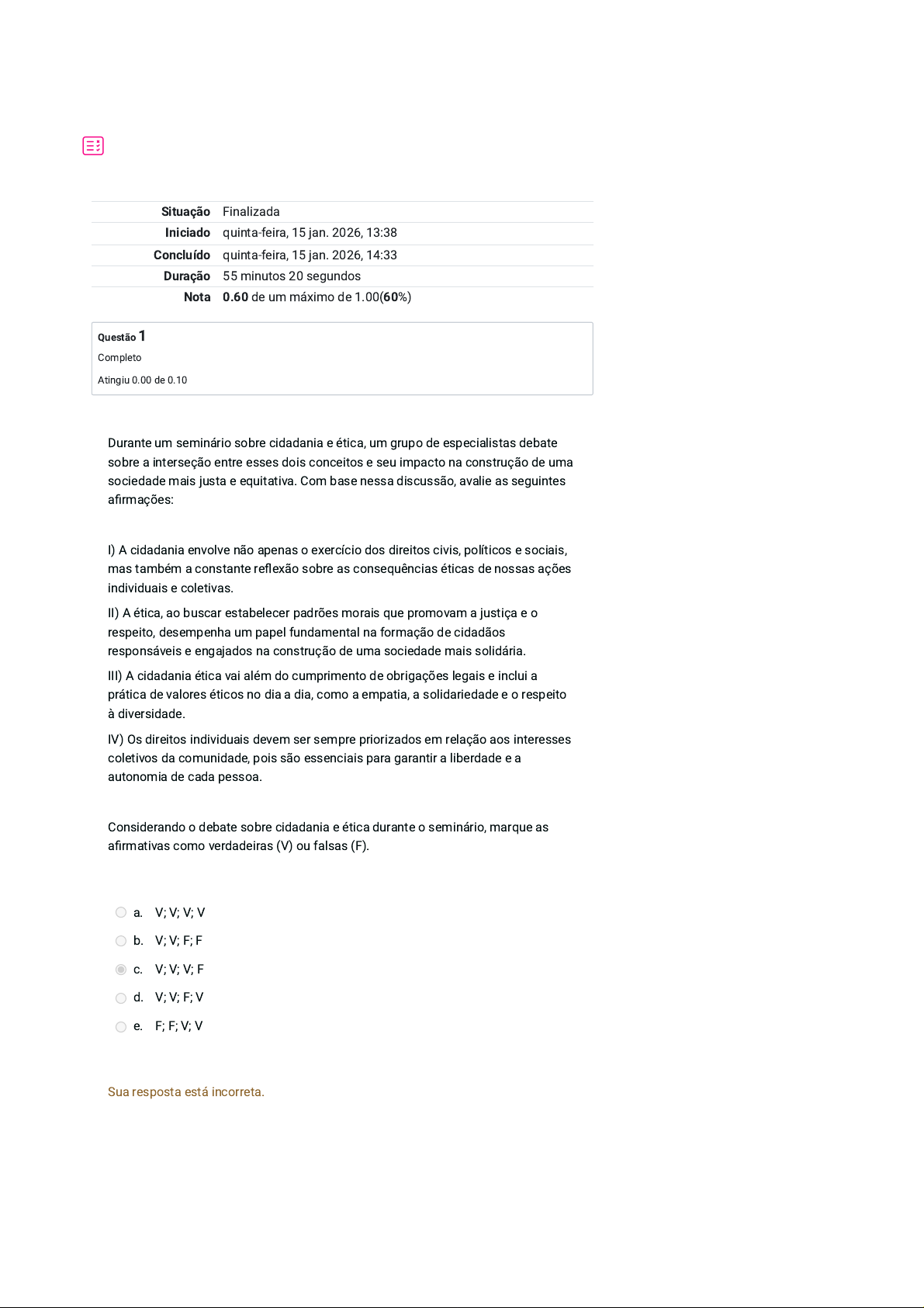 Situação Finalizada Iniciado quinta-feira, 15 jan. 2026, 13:38 Concluído quinta-feira, 15 jan. 2026, 14:33 Duração 55 minutos 20 segundos Nota 0.60 de um máximo de 1.00(60%) Questão 1 Completo Atingiu 0.00 de 0.10 Durante um seminário sobre cidadania e ética, um grupo de especialistas debate sobre a interseção entre esses dois conceitos e seu impacto na construção de uma sociedade mais justa e equitativa. Com base nessa discussão, avalie as seguintes a�rmações: I) A cidadania envolve não apenas o exercício dos direitos civis, políticos e sociais, mas também a constante re�exão sobre as consequências éticas de nossas ações individuais e coletivas. II) A ética, ao buscar estabelecer padrões morais que promovam a justiça e o respeito, desempenha um papel fundamental na formação de cidadãos responsáveis e engajados na construção de uma sociedade mais solidária. III) A cidadania ética vai além do cumprimento de obrigações legais e inclui a prática de valores éticos no dia a dia, como a empatia, a solidariedade e o respeito à diversidade. IV) Os direitos individuais devem ser sempre priorizados em relação aos interesses coletivos da comunidade, pois são essenciais para garantir a liberdade e a autonomia de cada pessoa. Considerando o debate sobre cidadania e ética durante o seminário, marque as a�rmativas como verdadeiras (V) ou falsas (F). a. V; V; V; V b. V; V; F; F c. V; V; V; F d. V; V; F; V e. F; F; V; V Sua resposta está incorreta. Questão 2 Completo Atingiu 0.10 de 0.10 Durante uma mesa-redonda sobre arquitetura sustentável em uma conferência acadêmica, vários arquitetos renomados discutem os desa�os éticos enfrentados pelos pro�ssionais da área. Em meio a essa discussão, surge o seguinte questionamento: "Qual é o papel da ética na tomada de decisões dos arquitetos em projetos de grande escala?". Analise as alternativas abaixo e selecione a que apresenta corretamente uma resposta para esta discussão: a. A ética pode ser ignorada em projetos de grande escala, desde que haja consentimento dos clientes e das autoridades locais. b. A ética é importante apenas para projetos menores, onde os impactos sociais e ambientais são menos signi�cativos. c. A ética é crucial para garantir que os projetos de grande escala atendam às necessidades sociais e ambientais das comunidades afetadas. d. A ética não tem impacto signi�cativo nas decisões de projeto, desde que atendam aos requisitos técnicos e legais. e. A ética é importante apenas para arquitetos que se especializam em sustentabilidade ecológica. Sua resposta está correta. Questão 3 Completo Atingiu 0.00 de 0.10 Um grupo de estudantes está aprendendo sobre as diversas atividades que um arquiteto e urbanista pode exercer no Brasil. O professor destaca a importância de compreender as responsabilidades pro�ssionais e as áreas de atuação previstas pela legislação. Após uma explicação detalhada sobre as atribuições da pro�ssão, o professor propõe uma atividade para veri�car o entendimento dos alunos sobre o tema. Considerando as atividades e áreas de atuação do arquiteto e urbanista, conforme estabelecido pela Lei Federal n.º 12.378/2010 e pela Resolução n.º 21 do Conselho de Arquitetura e Urbanismo (CAU/BR), analise e assinale a alternativa correta: a. O registro pro�ssional no CAU habilita o arquiteto e urbanista a atuar somente em sua região de origem, não sendo válido em outros estados brasileiros. b. O arquiteto e urbanista não precisa manter-se atualizado sobre as leis e normas que regem sua pro�ssão, pois seu conhecimento técnico é su�ciente para garantir a qualidade de seus projetos. c. O registro pro�ssional no CAU habilita o arquiteto e urbanista a atuar em todo o território nacional. d. A Resolução n.º 21 do CAU/BR de�ne todas as atividades que um arquiteto e urbanista pode realizar, não sendo necessário consultar outras fontes de informação. e. Para exercer todas as atividades previstas para o arquiteto e urbanista, é necessário realizar o registro pro�ssional no CAU do Estado ou do Distrito Federal, atendendo aos requisitos de capacidade civil e diploma de graduação em arquitetura e urbanismo. Sua resposta está incorreta. Questão 4 Completo Atingiu 0.00 de 0.10 Durante uma mesa-redonda sobre urbanismo participativo em uma conferência internacional, especialistas e pro�ssionais da área estão discutindo sobre a importância do envolvimento da comunidade nos processos de planejamento urbano. O debate gira em torno da in�uência do engajamento cívico na criação de cidades mais inclusivas e resilientes. Para enriquecer o diálogo, um dos participantes propõe uma discussão, garantindo que: I. O engajamento ativo dos cidadãos nos processos de planejamento urbano contribui para a construção de cidades mais justas, equitativas e resilientes. PORQUE II. A cidadania no planejamento urbano implica apenas nos direitos legais dos urbanistas concedidos pelo Estado. Analise as seguintes a�rmações e marque a alternativa correta: a. A a�rmação é verdadeira, mas a razão é uma explicação incorreta da a�rmação. b. A a�rmação é verdadeira, mas não há uma razão clara para explicar a a�rmação. c. A a�rmação é falsa e a razão é uma explicação correta da a�rmação. d. A a�rmação é falsa e a razão é uma explicação incorreta da a�rmação. e. A a�rmação é verdadeira e a razão é uma explicação correta da a�rmação. Sua resposta está incorreta. Questão 5 Completo Atingiu 0.10 de 0.10 Durante uma palestra sobre ética e cidadania no ambiente pro�ssional, um especialista destaca a relação entre as pro�ssões e sua in�uência na sociedade. Em seguida, propõe uma atividade em que os participantes devem analisar as seguintes a�rmativas: I) As pro�ssões, independentemente do segmento, estão intrinsecamente relacionadas à cidadania 