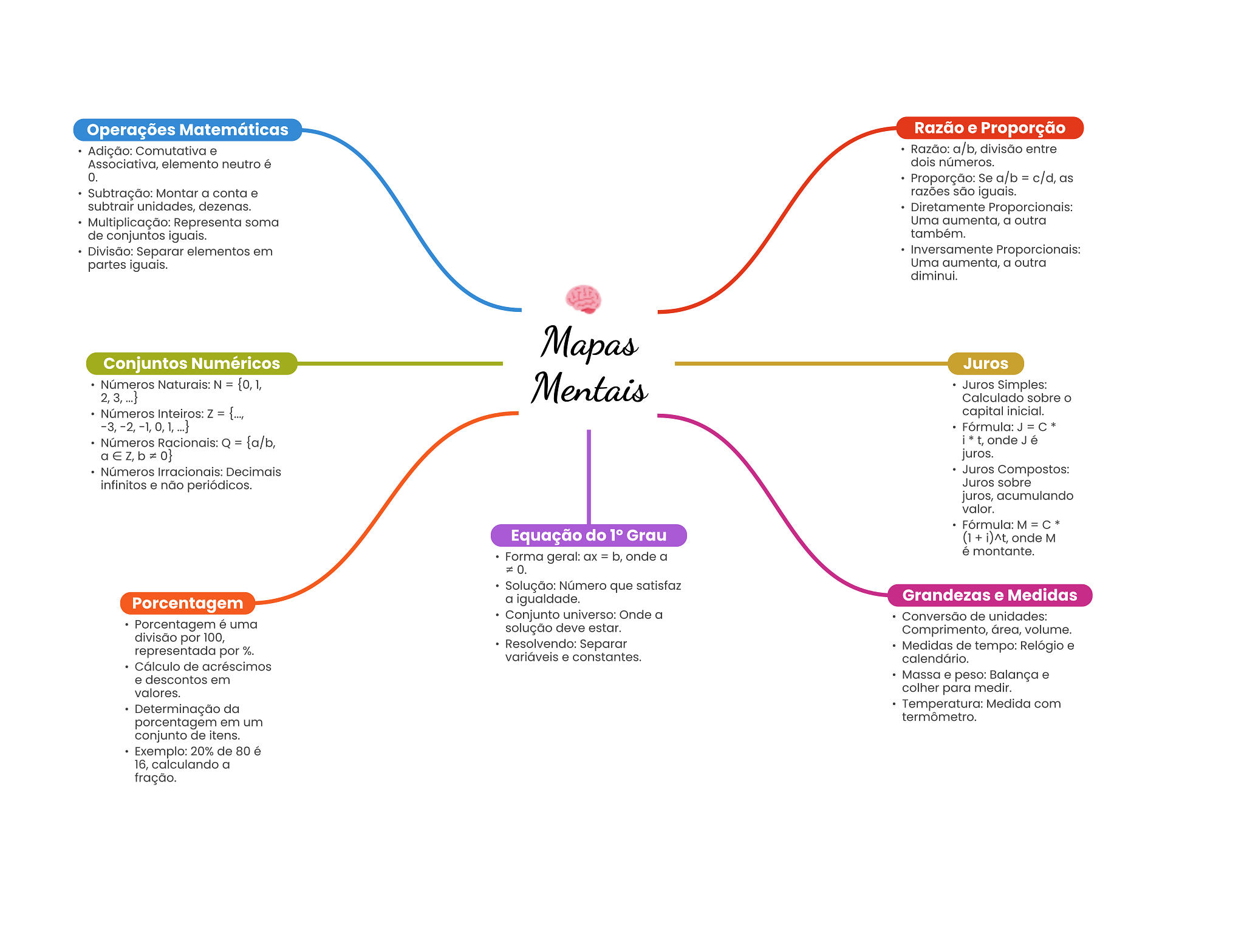Operações Matemáticas Razão e Proporção Adição: Comutativa e Razão: a/b, divisão entre Associativa, elemento neutro é dois números. 0. Proporção: Se a/b = c/d, as Subtração: Montar a conta e razões são iguais. subtrair unidades, dezenas. Diretamente Proporcionais: Multiplicação: Representa soma Uma aumenta, a outra de conjuntos iguais. também. Divisão: Separar elementos em Inversamente Proporcionais: partes iguais. Uma aumenta, a outra diminui. Mapas Conjuntos Numéricos Juros Números Naturais: N = {0,1, Mentais Juros Simples: Calculado sobre O Números Inteiros: Z = {..., capital inicial. Fórmula: J = C* Números Racionais: Q = {a/b, t, onde Jé juros. Números Irracionais: Decimais Juros Compostos: infinitos e não periódicos. Juros sobre juros, acumulando valor. Fórmula: M = Equação do 1° Grau + i)^t, onde M é montante. Forma geral: = b, onde a = 0. Solução: Número que satisfaz a igualdade. Grandezas e Medidas Porcentagem Conjunto universo: Onde a Conversão de unidades: Porcentagem é uma solução deve estar. Comprimento, área, volume. divisão por 100, Resolvendo: Separar representada por %. Medidas de tempo: Relógio e variáveis e constantes. calendário. Cálculo de acréscimos e descontos em Massa e peso: Balança e valores. colher para medir. Determinação da Temperatura: Medida com termômetro. porcentagem em um conjunto de itens. Exemplo: 20% de 80 é 16, calculando a fração.