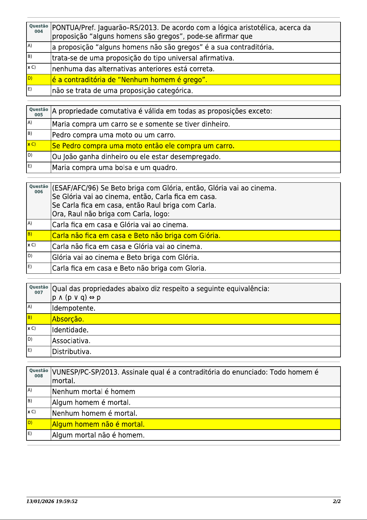 Questão PONTUA/Pref. Jaguarão-RS/2013. De acordo com a lógica aristotélica, acerca da 004 proposição "alguns homens são gregos", pode-se afirmar que A) a proposição "alguns homens não são gregos" é a sua contraditória. B) trata-se de uma proposição do tipo universal afirmativa. X C) nenhuma das alternativas anteriores está correta. D) é a contraditória de "Nenhum homem é grego". E) não se trata de uma proposição categórica. Questão 005 A propriedade comutativa é válida em todas as proposições exceto: A) Maria compra um carro se e somente se tiver dinheiro. B) Pedro compra uma moto ou um carro. C) Se Pedro compra uma moto então ele compra um carro. D) Ou João ganha dinheiro ou ele estar desempregado. E) Maria compra uma bolsa e um quadro. Questão (ESAF/AFC/96) Se Beto briga com Glória, então, Glória vai ao cinema. 006 Se Glória vai ao cinema, então, Carla fica em casa. Se Carla fica em casa, então Raul briga com Carla. Ora, Raul não briga com Carla, logo: A) Carla fica em casa e Glória vai ao cinema. B) Carla não fica em casa e Beto não briga com Glória. X C) Carla não fica em casa e Glória vai ao cinema. D) Glória vai ao cinema e Beto briga com Glória. E) Carla fica em casa e Beto não briga com Gloria. Questão Qual das propriedades abaixo diz respeito a seguinte equivalência: 007 p (p V q) A) Idempotente. B) Absorção. X C) Identidade. D) Associativa. E) Distributiva. Questão VUNESP/PC-SP/2013. Assinale qual é a contraditória do enunciado: Todo homem é 008 mortal. A) Nenhum mortal é homem B) Algum homem é mortal. X C) Nenhum homem é mortal. D) Algum homem não é mortal. E) Algum mortal não é homem. 13/01/2026 19:59:52 2/2