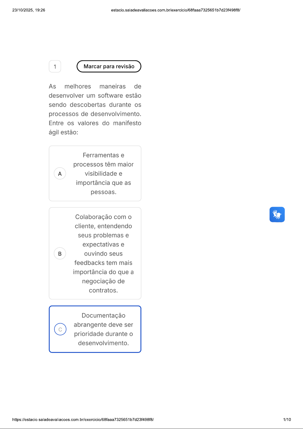 23/10/2025, 19:26 1 Marcar para revisão As melhores maneiras de desenvolver um software estão sendo descobertas durante os processos de desenvolvimento. Entre os valores do manifesto ágil estão: Ferramentas e processos têm maior A visibilidade e importância que as pessoas. Colaboração com cliente, entendendo seus problemas e expectativas e ouvindo seus feedbacks tem mais importância do que a negociação de contratos. Documentação abrangente deve ser c prioridade durante desenvolvimento. https://estacio.saladeavaliacoes.com.br/exercicio/68faaa7325651b7d23f498f8/ 1/1023/10/2025, 19:26 Quando elaborado um projeto ele deve ser seguido até final, D sem alterações; por isso, é importante realizar um briefing bem detalhado. Um plano de desenvolvimento é importante, porém ele E deve acompanhar as mudanças e feedback do cliente. 2 Marcar para revisão Das opções abaixo, assinale qual representa um evento Scrum que possui propósito de inspecionar o incremento do produto ao fim da sprint: Reunião de A Planejamento Reunião de Revisão c Reunião de Projeto https://estacio.saladeavaliacoes.com.br/exercicio/68faaa7325651b7d23f498f8/ 2/1023/10/2025, 19:26 estacio.saladeavaliacoes.com.br/exercicio/68faaa7325651b7d23f498f8/ D Reunião Diária Reunião de E Retrospectiva Lista de exercícios Sair e finalizar depois Qual item abaixo NÃO é um valor do Scrum? Questão 5 de 10 A Abertura 1 2 3 4 5 6 7 8 9 10 Respeito Respondidas (4) Em branco (6) c Foco Finalizar exercícios D Adaptação E Coragem 4 Marcar para revisão SCRUM considera que o conhecimento vem através da experiência, este método de gestão possui valores e pilares. São pilares do SCRUM: https://estacio.saladeavaliacoes.com.br/exercicio/68faaa7325651b7d23f498f8/ 3/1023/10/2025, 19:26 estacio.saladeavaliacoes.com.br/exercicio/68faaa7325651b7d23f498f8/ Agilidade, A Transparência e Foco. Adaptação, Transparência e Inspeção. Adaptação, c Comprometimento e Coragem. Inspeção, D Transparência e Foco. Inspeção, Adaptação E e Respeito. 5 Marcar para revisão Método Extreme Programming (XP) é uma metodologia ágil que se destaca por sua abordagem estruturada e colaborativa no desenvolvimento de software. Nesse contexto, a alocação de papéis predefinidos dentro da equipe é fundamental para garantir a eficácia do processo. Um desses papéis cruciais é do Coach, cuja presença e atuação são fundamentais para sucesso do projeto. Dentro dos papéis predefinidos e distribuídos pela equipe, na https://estacio.saladeavaliacoes.com.br/exercicio/68faaa7325651b7d23f498f8/ 4/1023/10/2025, 19:26 estacio.saladeavaliacoes.com.br/exercicio/68faaa7325651b7d23f498f8/ utilização do método os objetivos do Coach são: coach está ligado diretamente ao desenvolvimento do A software, sendo a linha de frente no processo. coach define os requisitos do sistema que está em desenvolvimento. coach tem conhecimento técnico e do software que está sendo desenvolvido, deve c ser capaz de ajudar a equipe, facilitar reuniões e ser guardião dos valores do método coach fornece feedback à equipe D mantendo equilíbrio entre que foi e precisa ser realizado. coach realiza medições para avaliar E processo de desenvolvimento. https://estacio.saladeavaliacoes.com.br/exercicio/68faaa7325651b7d23f498f8/ 5/1023/10/2025, 19:26 6 Marcar para revisão Kent Beck, Ward Cunningham e Ron Jeffries participaram do desenvolvimento do Manifesto Ágil, eles já possuíam experiência no desenvolvimento de métodos, pois criaram método Extream Programming (XP). Sobre Método XP: Não pode ser caracterizado como A processo ágil, porque possui práticas e valores próprios. Deixou de ser utilizado após a assinatura do Manifesto Ágil por ser equivalente. Sua utilização cria ambientes de c desenvolvimento onde os membros apenas seguem ao plano. https://estacio.saladeavaliacoes.com.br/exercicio/68faaa7325651b7d23f498f8/ 6/1023/10/2025, 19:26 Adere inteiramente ao Manifesto Ágil e suas práticas e valores D completam método e visam um melhor desenvolvimento de softwares. Respeito e comunicação não E fazem parte de suas práticas, é um método focado em resultados. 7 Marcar para revisão Os princípios servem de base para algo, no caso do Manifesto Ágil, seus princípios são conceitos básicos para a condução de práticas. Conhecendo os princípios do Manifesto Ágil é correto afirmar que: Não há necessidade de levar ambiente da A criação do projeto em consideração. Pessoas de negócios e desenvolvedores devem trabalhar de forma independente, encontrando-se reuniões esporádicas. https://estacio.saladeavaliacoes.com.br/exercicio/68faaa7325651b7d23f498f8/ 7/1023/10/2025, 19:26 A maneira mais eficaz de transmitir informações e ideias c entre a equipe é em uma conversa pessoalmente. Processos Ágeis consomem muitas D horas de trabalho dos desenvolvedores. Os melhores projetos ágeis são os mais E sofisticados, ou seja, os que apresentam soluções complexas. 8 Marcar para revisão Diferentemente do método modelo SCRUM possui apenas três papéis para seu time. Dessa forma visa otimizar a criatividade, produtividade e flexibilidade, tornando-os multifuncionais e auto- organizáveis. Analise as afirmativas a seguir: I time de desenvolvimento, DEV team, deve possuir de 3 a 9 componentes. Dono do produto, Product Owner, define e transmite que se espera do produto. III - Líder SCRUM, SCRUM Master, deve apoiar sua equipe https://estacio.saladeavaliacoes.com.br/exercicio/68faaa7325651b7d23f498f8/ 8/1023/10/2025, 19:26 de transmitir entendimento do SCRUM. É correto que se afirma em: A I, apenas. II, apenas. c e III, apenas. D e III, apenas. E I, e III. 9 Marcar para revisão No método Extreme Programming (XP), a responsabilidade por executar melhorias contínuas no código- fonte, como refatoração, testes automatizados e aplicação de boas práticas de programação, é atribuída ao papel de: A Cliente Tracker c Coach https://
