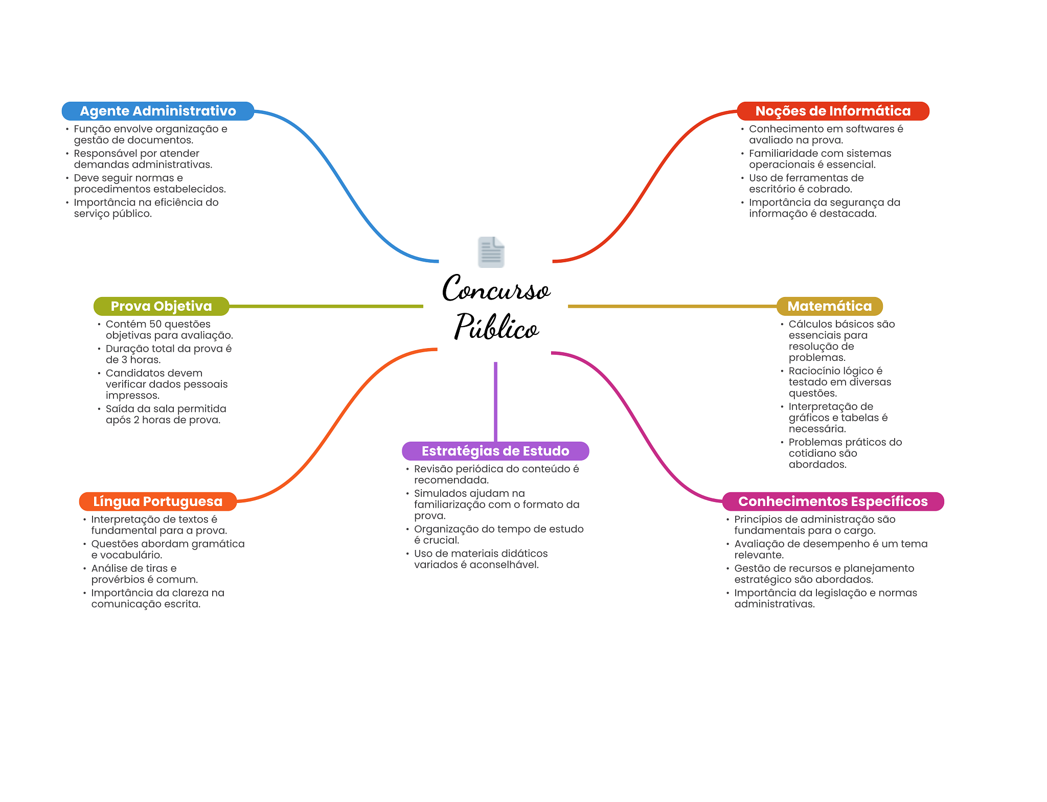 Agente Administrativo Noções de Informática Função envolve organização e Conhecimento em softwares é gestão de documentos. avaliado na prova. Responsável por atender Familiaridade com sistemas demandas administrativas. operacionais é essencial. Deve seguir normas e Uso de ferramentas de procedimentos estabelecidos. escritório é cobrado. Importância na eficiência do Importância da segurança da serviço público. informação é destacada. Concurso Prova Objetiva Matemática Contém 50 questões objetivas para avaliação. Público Cálculos básicos são essenciais para Duração total da prova é resolução de de 3 horas. problemas. Candidatos devem Raciocínio lógico é verificar dados pessoais testado em diversas impressos. questões. Saída da sala permitida Interpretação de após 2 horas de prova. gráficos e tabelas é necessária. Problemas práticos do Estratégias de Estudo cotidiano são Revisão periódica do conteúdo é abordados. recomendada. Simulados ajudam na Língua Portuguesa familiarização com formato da Conhecimentos Específicos Interpretação de textos é prova. Princípios de administração são fundamental para a prova. Organização do tempo de estudo fundamentais para cargo. Questões abordam gramática é crucial. Avaliação de desempenho é um tema e vocabulário. Uso de materiais didáticos relevante. Análise de tiras e variados é aconselhável. Gestão de recursos e planejamento provérbios é comum. estratégico são abordados. Importância da clareza na Importância da legislação e normas comunicação escrita. administrativas.