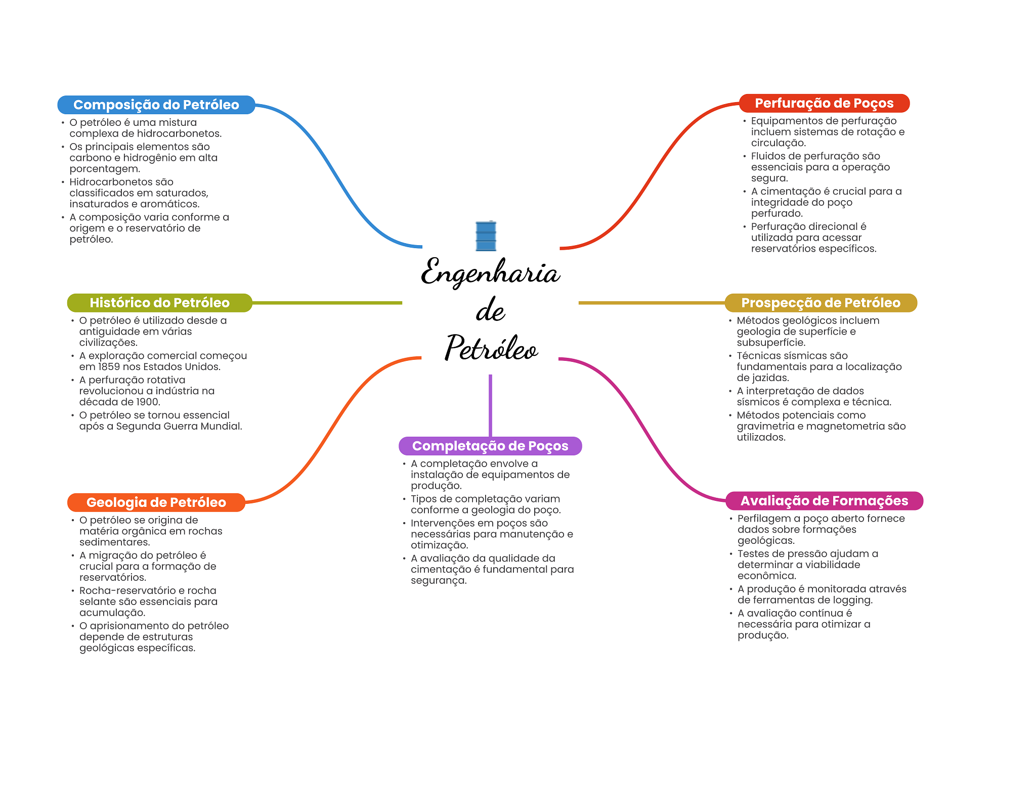 Composição do Petróleo Perfuração de Poços petróleo é uma mistura Equipamentos de perfuração complexa de hidrocarbonetos. incluem sistemas de rotação e Os principais elementos são circulação. carbono e hidrogênio em alta Fluidos de perfuração são porcentagem. essenciais para a operação Hidrocarbonetos são segura. classificados em saturados, A cimentação é crucial para a insaturados e aromáticos. integridade do poço A composição varia conforme a perfurado. origem e reservatório de Perfuração direcional é petróleo. utilizada para acessar reservatórios específicos. Engenharia Histórico do Petróleo de Prospecção de Petróleo petróleo é utilizado desde a Métodos geológicos incluem antiguidade em várias geologia de superfície e civilizações. Petróleo subsuperficie. A exploração comercial começou Técnicas sísmicas são em 1859 nos Estados Unidos. fundamentais para a localização A perfuração rotativa de jazidas. revolucionou a indústria na A interpretação de dados década de 1900. sísmicos é complexa e técnica. petróleo se tornou essencial Métodos potenciais como após a Segunda Guerra Mundial. gravimetria e magnetometria são utilizados. Completação de Poços A completação envolve a instalação de equipamentos de produção. Geologia de Petróleo Tipos de completação variam Avaliação de Formações conforme a geologia do poço. petróleo se origina de Intervenções em poços são Perfilagem a poço aberto fornece matéria orgânica em rochas necessárias para manutenção e dados sobre formações sedimentares. otimização. geológicas. A migração do petróleo é A avaliação da qualidade da Testes de pressão ajudam a crucial para a formação de determinar a viabilidade cimentação é fundamental para reservatórios. econômica. segurança. Rocha-reservatório e rocha A produção é monitorada através selante são essenciais para de ferramentas de logging. acumulação. A avaliação contínua é aprisionamento do petróleo necessária para otimizar a depende de estruturas produção. geológicas específicas.