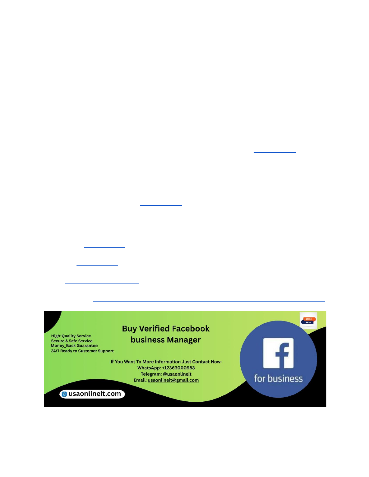 Introduction to Facebook Business Manager and Why It Matters Facebook Business Manager (FBM) is an essential platform for businesses that want to manage Facebook pages, ad accounts, pixels, and team access in one secure place. For advertisers in the USA, having a properly verified Business Manager improves ad trust, spending limits, and long-term account stability. Many marketers search for fast solutions to obtain verified FBM accounts, especially when scaling advertising operations. However, not all sources are safe or reliable. This is where trusted service providers like USAOnlineIT play a critical role by guiding businesses toward secure, compliant solutions. A verified FBM allows companies to protect assets, control permissions, and reduce the risk of ad account suspension. With increasing competition in the US digital advertising market, speed and security have become equally important. Businesses must understand how verified Business Managers work, what risks exist, and which sources offer legitimate support. This guide explains secure options, best practices, and how USAOnlineIT helps clients navigate the process responsibly while maintaining compliance with Meta policies. If You Want To More Information Just Contact Now: WhatsApp: +12363000983 Telegram: @usaonlineit Email: usaonlineit@gmail.com websites Link : https://usaonlineit.com/product/buy-verified-facebook-business-manager/ Understanding Verified Facebook Business Manager Accounts https://usaonlineit.com/product/buy-verified-facebook-business-manager/ https://usaonlineit.com/product/buy-verified-facebook-business-manager/ https://usaonlineit.com/product/buy-verified-facebook-business-manager/ https://usaonlineit.com/product/buy-verified-facebook-business-manager/ https://usaonlineit.com/product/buy-verified-facebook-business-manager/ A verified Facebook Business Manager account means Meta has confirmed the legitimacy of a business through documentation such as business registration, domain verification, and contact authentication. Verification increases credibility and unlocks higher ad spend limits, advanced tools, and faster support. Many advertisers mistakenly believe verification is automatic, but it requires proper setup and accurate information. In the USA market, verified FBMs are especially valuable because Meta applies stricter compliance standards. USAOnlineIT helps businesses understand the verification process step by step, ensuring no policy violations occur. Instead of risky shortcuts, proper verification ensures long-term account health. A verified FBM also reduces the likelihood of sudden ad restrictions and improves trust scores. Businesses that rely on paid ads for growth should prioritize verified Business Managers as a core digital asset. Understanding what “verified” truly means helps avoid scams and unsafe sellers promising instant results. Why Businesses Look for Fast FBM Solutions in the USA Speed is a major factor for US-based advertisers. Launching campaigns quickly can determine success, especially in competitive niches like e-commerce, real estate, and lead generation. Many businesses seek fast FBM solutions because delays in verification or setup can cost revenue. However, speed should never compromise security. USAOnlineIT focuses on efficient yet compliant methods to help clients get operational quickly without risking account shutdowns. Fast solutions should still follow Meta’s rules, use real business information, and maintain ownership transparency. Businesses must understand that “fast” does not mean “unsafe.” When handled correctly, FBM setup and verification can be streamlined while remaining secure. Choosing the right service partner makes the difference between sustainable growth and repeated account loss. Risks of Buying Unverified or Unsafe FBM Accounts Purchasing unverified or black-market FBM accounts carries serious risks. These accounts often use fake identities, recycled profiles, or stolen business information. Meta’s automated systems can detect such irregularities, leading to permanent bans and loss of ad funds. Many businesses in the USA lose thousands of dollars by trusting unreliable sellers. USAOnlineIT strongly advises avoiding sources that promise “instant verified accounts” without documentation. Unsafe accounts may work temporarily but fail when scaling. Long-term advertising success requires stability, not shortcuts. Understanding these risks helps businesses make informed decisions and protect their marketing investments. What Makes a Site Secure for FBM Services A secure FBM service provider prioritizes transparency, compliance, and customer support. Key indicators include clear service descriptions, real business credentials, secure payment methods, and responsive support teams. USAOnlineIT follows these principles by offering structured FBM setup assistance rather than selling risky pre-made accounts. Secure sites never ask for unnecessary personal data and always explain the process clearly. In the USA https://usaonlineit.com/product/buy-verified-facebook-business-manager/ market, regulatory compliance and data protection are essential. Choosing a secure provider reduces risks and ensures long-term usability of your Business Manager. Top Secure Option: Professional FBM Setup Services Professional FBM setup services are one of the safest alternatives to account purchasing. These services help businesses create and verify their own Business Manager using legitimate information. USAOnlineIT specializes in this approach, ensuring clients retain full ownership and control. This method aligns with Meta’s policies and significantly reduces suspension risks. Businesses benefit from expert guidance, faster approvals, and proper configuration. Professional services focus on sustainability rather than quick, unsafe gains. Trusted Digital Marketing Agencies in the USA Reputable digital marketing agencies often provide FBM setup and verification supp