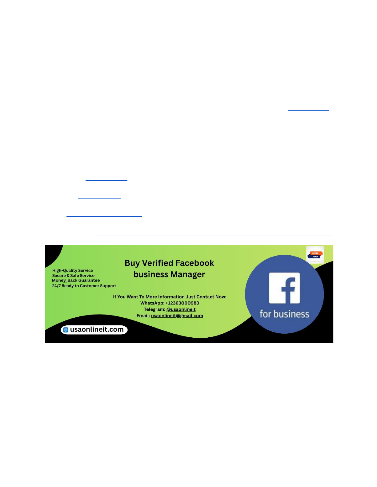 Best Websites for Buying Verified Facebook BM In the rapidly evolving world of digital marketing, businesses increasingly rely on Facebook Business Manager (BM) to manage ads, Pages, and assets. Many marketers mistakenly search for ways to “buy verified Facebook BM accounts in bulk,” but this practice often violates Facebook’s Terms of Service. Instead, the goal of this guide — brought to you by USAOnlineIT — is to help you understand safe, compliant alternatives that deliver similar operational capabilities without risking account bans, legal issues, or loss of assets. This complete guide covers strategies, tools, and trusted services that help organizations scale their Facebook presence responsibly. If You Want To More Information Just Contact Now: WhatsApp: +12363000983 Telegram: @usaonlineit Email: usaonlineit@gmail.com websites Link : https://usaonlineit.com/product/buy-verified-facebook-business-manager/ Why You Should Avoid Buying Facebook BM Accounts in Bulk Buying Facebook Business Manager accounts in bulk may seem attractive for quick scaling, but it is fraught with risk. Facebook’s policies prohibit buying, selling, or trading accounts. Doing so can lead to immediate account suspension, loss of ad spend, and permanent restrictions on your IP or business assets. Organizations that take shortcuts may appear productive in the short term but ultimately undermine their long-term digital marketing strategy. USAOnlineIT https://usaonlineit.com/product/buy-verified-facebook-business-manager/ https://usaonlineit.com/product/buy-verified-facebook-business-manager/ https://usaonlineit.com/product/buy-verified-facebook-business-manager/ https://usaonlineit.com/product/buy-verified-facebook-business-manager/ always recommends compliance and ethical practices. Legitimate growth comes from proper account creation and management workflows, not shortcuts that put your business and clients at risk. The Importance of Facebook Business Manager for Agencies and Brands Facebook Business Manager centralizes control over Pages, ad accounts, assets, and teams. Whether you are a freelance marketer or a multinational brand, proper BM setup ensures clean access control, streamlined billing, advanced collaboration features, and audit trails. Efficiently managing multiple assets is a core capability for agencies and enterprises. Large companies often need to manage dozens of Pages and campaigns. That’s why it’s essential to focus on scaling processes, not questionable account sources. At USAOnlineIT, we help clients structure their BM ecosystem to optimize performance and security without breaching any platform rules. Compliant Alternatives to Buying BM Accounts in Bulk There are many legitimate ways to scale your Facebook operations without buying accounts. Instead of purchasing pre-verified BM accounts, consider: ● Using Facebook’s Business Verification processes ● Creating multiple ad accounts under one verified BM ● Assigning asset access via partners and agencies ● Leveraging account teams and role permissions These methods keep you within Facebook’s ecosystem safely. USAOnlineIT assists businesses in navigating verification, creating scalable business structures, and ensuring compliance with Meta policies. We also recommend using collaboration tools like Shared Asset Groups to avoid needing extra BM accounts unnecessarily. How to Properly Create a Facebook Business Manager Account The safest and most supported way to get a Business Manager account is to create one yourself through Facebook. Go to business.facebook.com, enter your business details, and complete necessary verification steps. Ensure you use corporate email addresses, accurate business information, and two-factor authentication for security. Creating your accounts internally gives you full ownership and reduces risk. USAOnlineIT can guide you step-by-step https://usaonlineit.com/product/buy-verified-facebook-business-manager/ through setup, verification, and ongoing management so your BM structure remains compliant and efficient. A well-set BM can support many ad accounts and Pages without any need for purchased assets. Understanding Facebook Verification and Its Importance Verified Facebook Business Manager accounts are essential for higher spending limits, access to advanced features, and being trusted by partners. Verification requires submission of official documents like business registration, tax ID, and proof of domain ownership. While this process takes time, it’s far safer and more sustainable than acquiring pre-verified accounts from third parties. USAOnlineIT helps companies through the verification process, ensuring that all documentation meets Meta’s requirements and avoiding common mistakes that lead to rejection. Best Tools to Manage Multiple Facebook Ad Accounts Many marketers believe they need multiple BM accounts to run ads for different clients or projects. In reality, you can manage several ad accounts within one BM. Tools that help with this include Facebook’s native account teams, roles, and permissions, as well as third-party dashboards like Hootsuite, AdEspresso, and Sprout Social. These tools allow centralized management of campaigns and reporting without breaking rules. USAOnlineIT often integrates these solutions into client workflows to improve efficiency and scale campaigns ethically. Strategies for Scaling Facebook Ads Ethically Scaling Facebook advertising is not about multiplying BM accounts — it’s about refining strategy. Focus on audience segmentation, creative testing, budget allocation, and conversion tracking. Scaling responsibly also means keeping clear documentation of access rights and roles for team members or external partners. A strong process beats shortcuts. At USAOnlineIT, we coach brands on strategic scaling: optimizing creatives, budgets, and campaign structure to achieve results without risking policy violations. How to Onboard Clients Without New BM A