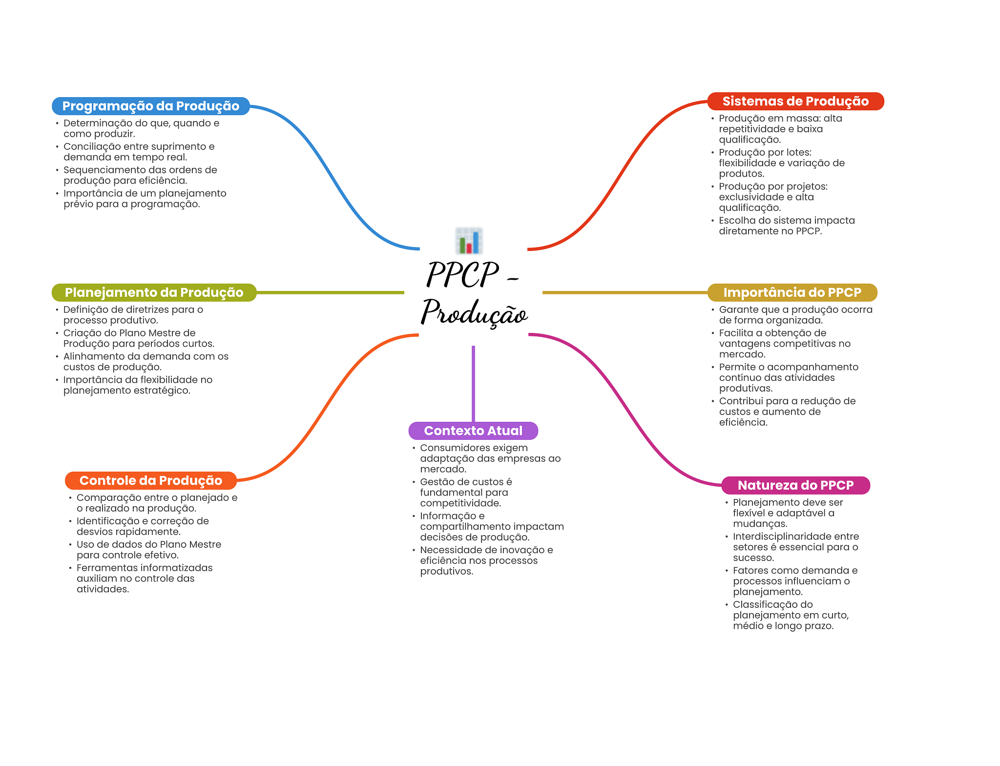Programação da Produção Sistemas de Produção Determinação do que, quando e Produção em massa: alta como produzir. repetitividade e baixa qualificação. Conciliação entre suprimento e demanda em tempo real. Produção por lotes: flexibilidade e variação de Sequenciamento das ordens de produtos. produção para eficiência. Produção por projetos: Importância de um planejamento exclusividade e alta prévio para a programação. qualificação. Escolha do sistema impacta diretamente no PPCP. PPCP Planejamento da Produção Importância do Definição de diretrizes para processo produtivo. Produção Garante que a produção ocorra de forma organizada. Criação do Plano Mestre de Facilita a obtenção de Produção para períodos curtos. vantagens competitivas no Alinhamento da demanda com OS mercado. custos de produção. Permite O acompanhamento Importância da flexibilidade no contínuo das atividades planejamento estratégico. produtivas. Contribui para a redução de custos e aumento de eficiência. Contexto Atual Consumidores exigem adaptação das empresas ao mercado. Controle da Produção Gestão de custos é Natureza do Comparação entre planejado e fundamental para realizado na produção. competitividade. Planejamento deve ser Identificação e correção de Informação e flexível e adaptável a desvios rapidamente. compartilhamento impactam mudanças. decisões de produção. Interdisciplinaridade entre Uso de dados do Plano Mestre Necessidade de inovação e setores é essencial para O para controle efetivo. eficiência nos processos sucesso. Ferramentas informatizadas produtivos. Fatores como demanda e auxiliam no controle das processos influenciam atividades. planejamento. Classificação do planejamento em curto, médio e longo prazo.