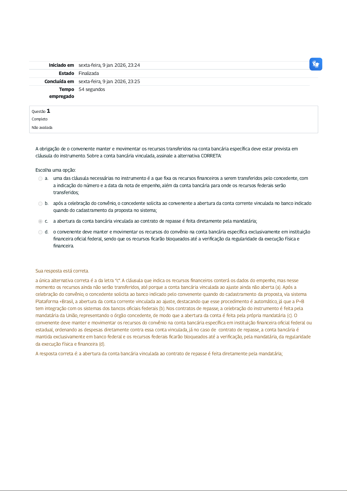 Iniciado em sexta-feira, 9 jan. 2026, 23:24 Estado Finalizada Concluída em sexta-feira, 9 jan. 2026, 23:25 Tempo empregado 54 segundos Questão 1 Completo Não avaliada A obrigação de o convenente manter e movimentar os recursos transferidos na conta bancária específica deve estar prevista em cláusula do instrumento. Sobre a conta bancária vinculada, assinale a alternativa CORRETA: Escolha uma opção: a. uma das cláusula necessárias no instrumento é a que fixa os recursos financeiros a serem transferidos pelo concedente, com a indicação do número e a data da nota de empenho, além da conta bancária para onde os recursos federais serão transferidos; b. após a celebração do convênio, o concedente solicita ao convenente a abertura da conta corrente vinculada no banco indicado quando do cadastramento da proposta no sistema; c. a abertura da conta bancária vinculada ao contrato de repasse é feita diretamente pela mandatária; d. o convenente deve manter e movimentar os recursos do convênio na conta bancária específica exclusivamente em instituição financeira oficial federal, sendo que os recursos ficarão bloqueados até a verificação da regularidade da execução física e financeira. Sua resposta está correta. a única alternativa correta é a da letra “c”. A cláusula que indica os recursos financeiros conterá os dados do empenho, mas nesse momento os recursos ainda não serão transferidos, até porque a conta bancária vinculada ao ajuste ainda não aberta (a). Após a celebração do convênio, o concedente solicita ao banco indicado pelo convenente quando do cadastramento da proposta, via sistema Plataforma +Brasil, a abertura da conta corrente vinculada ao ajuste, destacando que esse procedimento é automático, já que a P+B tem integração com os sistemas dos bancos oficiais federais (b). Nos contratos de repasse, a celebração do instrumento é feita pela mandatária da União, representando o órgão concedente, de modo que a abertura da conta é feita pela própria mandatária (c). O convenente deve manter e movimentar os recursos do convênio na conta bancária específica em instituição financeira oficial federal ou estadual, ordenando as despesas diretamente contra essa conta vinculada, já no caso de contrato de repasse, a conta bancária é mantida exclusivamente em banco federal e os recursos federais ficarão bloqueados até a verificação, pela mandatária, da regularidade da execução física e financeira (d). A resposta correta é: a abertura da conta bancária vinculada ao contrato de repasse é feita diretamente pela mandatária; Questão 2 Completo Não avaliada Marque a afirmativa verdadeira com “V” e a falsa com “F": (_) executar e fiscalizar a execução do objeto pactuado é obrigação do concedente; (_) publicar o extrato do convênio no Diário Oficial da União é condição para eficácia do ajuste; (_) acompanhar e avaliar a execução física e financeira e os resultados alcançados é obrigação do concedente; (_) não apresentar a Licença Prévia ambiental da obra proposta no plano de trabalho não suspende o ajuste. Escolha uma opção: a. F-V-V-F b. F-F-V-F c. V-F-V-F d. V-F-F-V Sua resposta está incorreta. a sequência correta é F-V-V-F. A execução do objeto avençado é obrigação do convenente, que também tem de fiscalizar a execução feita por terceiros contratados (a). A publicação do extrato do instrumento é condição de eficácia do ajuste, em observância ao princípio da publicidade (b). Acompanhar a execução física e financeira é obrigação tanto do concedente quanto do convenente, no entanto, a avaliação da execução e dos resultados alcançados é obrigação do concedente (c). A apresentação da licença prévia pode ser condição de suspensão do ajuste, nos casos em que não for exigida antes da celebração (d). A resposta correta é: F-V-V-F Questão 3 Completo Não avaliada A celebração do instrumento depende de pareceres técnico e jurídico favoráveis. Assinale a alternativa ERRADA em relação ao pareceres exigidos para a celebração: Escolha uma opção: a. o parecer técnico deve examinar o mérito da transferência voluntária enquanto o parecer jurídico o cumprimento das exigências legais e normativas, incluindo a adequação do próprio instrumento; b. o parecer jurídico é dispensável porque os instrumento são padronizados a partir de modelos previamente aprovados pela AGU; c. o concedente pode emitir vários pareceres técnicos ao longo da aprovação da TVU, avaliando desde a adequação do plano de trabalho aos objetivos do programa, o detalhamento do objeto em metas e etapas de execução, a viabilidade técnica do projeto, a adequação dos custos e prazos previstos, a capacidade técnica e operacional do convenente, até os documentos que visam a comprovar o cumprimento das condições para a celebração; d. compete à AGU emitir pareceres e orientações normativas para definir procedimentos comuns e propor modelos de editais de chamamento público e minutas de instrumentos de TVU a serem usados pelos concedentes. Sua resposta está correta. a única afirmativa ERRADA é a alternativa “b”, uma vez que o parecer jurídico é obrigatório, mas pode ser suprido por manifestação jurídica referencial, ou seja, um parecer que analisa todas as questões jurídicas que envolvam matérias idênticas e recorrentes, dispensando a análise individualizada de cada minuta, desde que o concedente justifique que está usando uma minuta padrão previamente aprovada(a). No fluxo da inserção dos dados na P+B o concedente pode emitir mais de um parecer técnico, como por exemplo na aprovação da proposta e do plano de trabalho, na avaliação do projeto básico e/ou do termo de referência e no cumprimento das exigências para a celebração (c). A AGU tem competência para disciplinar e padronizar procedimentos relativos à consultoria jurídica dos
