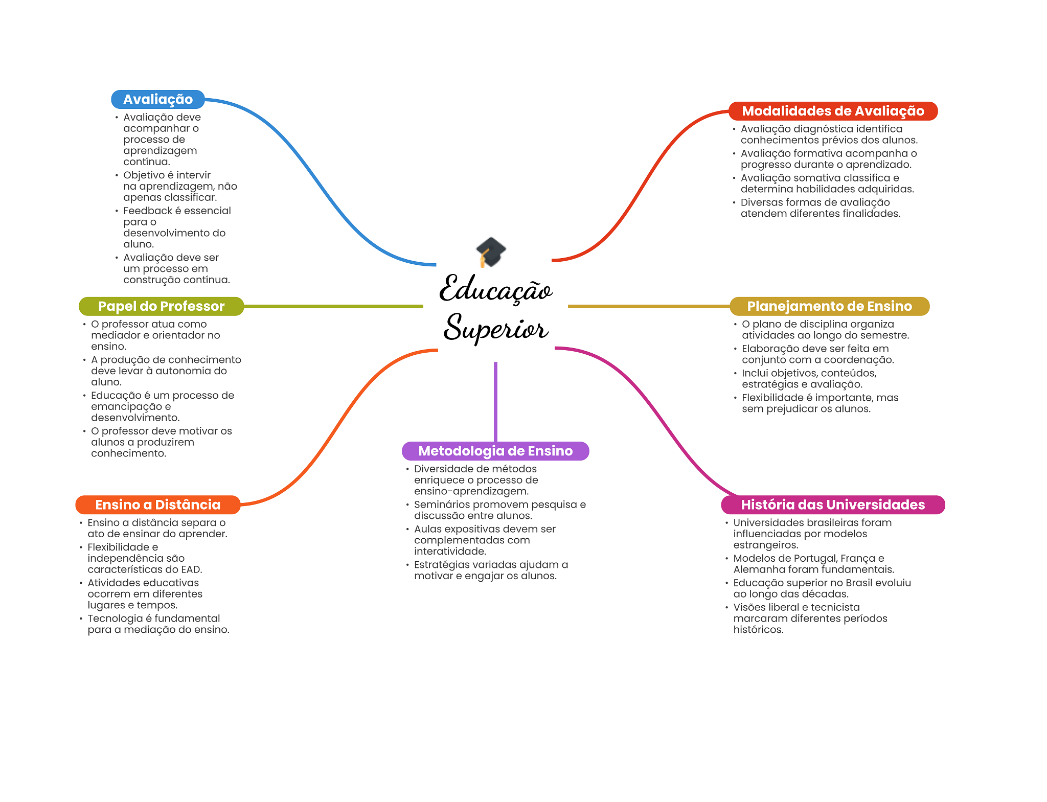 Avaliação Avaliação deve Modalidades de Avaliação acompanhar Avaliação diagnóstica identifica processo de conhecimentos prévios dos alunos. aprendizagem Avaliação formativa acompanha contínua. progresso durante aprendizado. Objetivo é intervir Avaliação somativa classifica e na aprendizagem, não determina habilidades adquiridas. apenas classificar. Diversas formas de avaliação Feedback é essencial atendem diferentes finalidades. para desenvolvimento do aluno. Avaliação deve ser um processo em construção contínua. Educação Papel do Professor Planejamento de Ensino professor atua como mediador e orientador no Superior O plano de disciplina organiza atividades ao longo do semestre. ensino. Elaboração deve ser feita em A produção de conhecimento conjunto com a coordenação. deve levar à autonomia do Inclui objetivos, conteúdos, aluno. estratégias e avaliação. Educação é um processo de Flexibilidade é importante, mas emancipação e sem prejudicar alunos. desenvolvimento. professor deve motivar OS alunos a produzirem conhecimento. Metodologia de Ensino Diversidade de métodos enriquece processo de ensino-aprendizagem. Ensino a Distância Seminários promovem pesquisa e História das Universidades discussão entre alunos. Ensino a distância separa Universidades brasileiras foram ato de ensinar do aprender. Aulas expositivas devem ser influenciadas por modelos complementadas com Flexibilidade e interatividade. estrangeiros. independência são características do EAD. Estratégias variadas ajudam a Modelos de Portugal, França e Alemanha foram fundamentais. motivar e engajar alunos. Atividades educativas Educação superior no Brasil evoluiu ocorrem em diferentes ao longo das décadas. lugares e tempos. Visões liberal e tecnicista Tecnologia é fundamental marcaram diferentes períodos para a mediação do ensino. históricos.