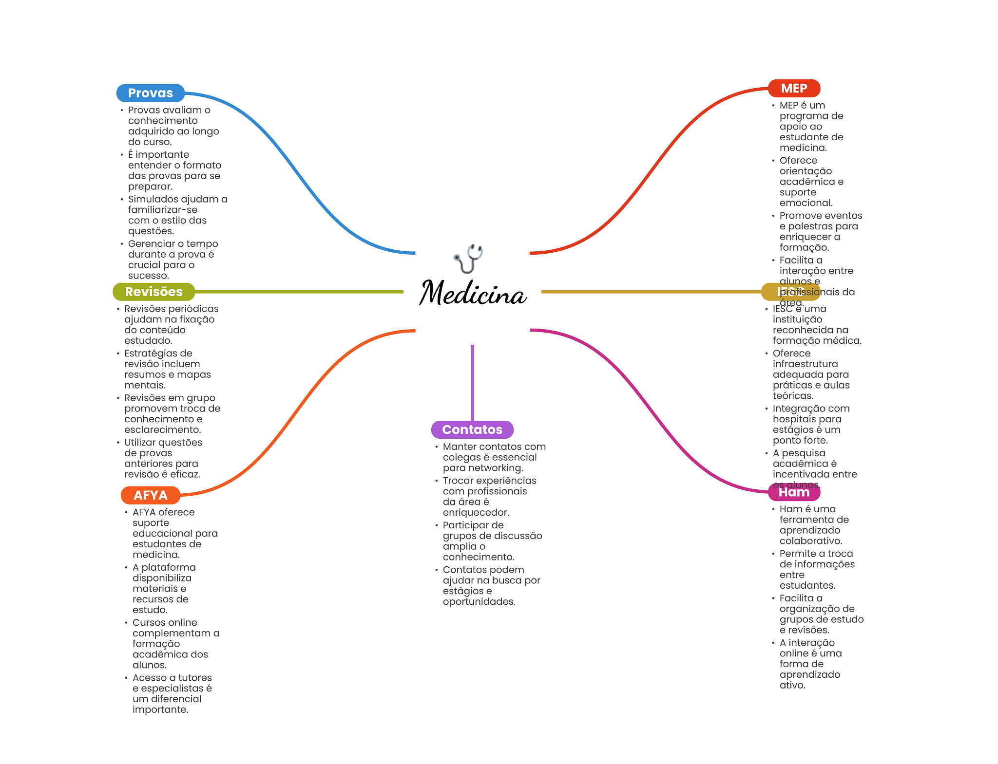 Provas MEP é um Provas avaliam conhecimento programa de adquirido ao longo apoio ao estudante de do curso. medicina. É importante Oferece entender O formato das provas para se orientação acadêmica e preparar. suporte Simulados ajudam a emocional. familiarizar-se Promove eventos com estilo das questões. e palestras para enriquecer a Gerenciar tempo formação. durante a prova é Facilita a crucial para interação entre sucesso. alunos e Revisões Medicina profissionais da Revisões periódicas IESC e uma ajudam na fixação instituição do conteúdo reconhecida na estudado. formação médica. Estratégias de Oferece revisão incluem infraestrutura resumos e mapas adequada para mentais. práticas e aulas Revisões em grupo teóricas. promovem troca de Integração com conhecimento e hospitais para esclarecimento. Contatos estágios é um Utilizar questões ponto forte. Manter contatos com de provas colegas é essencial A pesquisa anteriores para acadêmica é para networking. revisão é eficaz. incentivada entre Trocar experiências AFYA com profissionais Ham da área é AFYA oferece enriquecedor. Ham é uma ferramenta de suporte Participar de educacional para grupos de discussão aprendizado estudantes de colaborativo. amplia medicina. conhecimento. Permite a troca A plataforma Contatos podem de informações disponibiliza entre ajudar na busca por materiais e estudantes. estágios e recursos de oportunidades. Facilita a estudo. organização de Cursos online grupos de estudo complementam a e revisões. formação A interação acadêmica dos online é uma alunos. forma de Acesso a tutores aprendizado e especialistas é ativo. um diferencial importante.