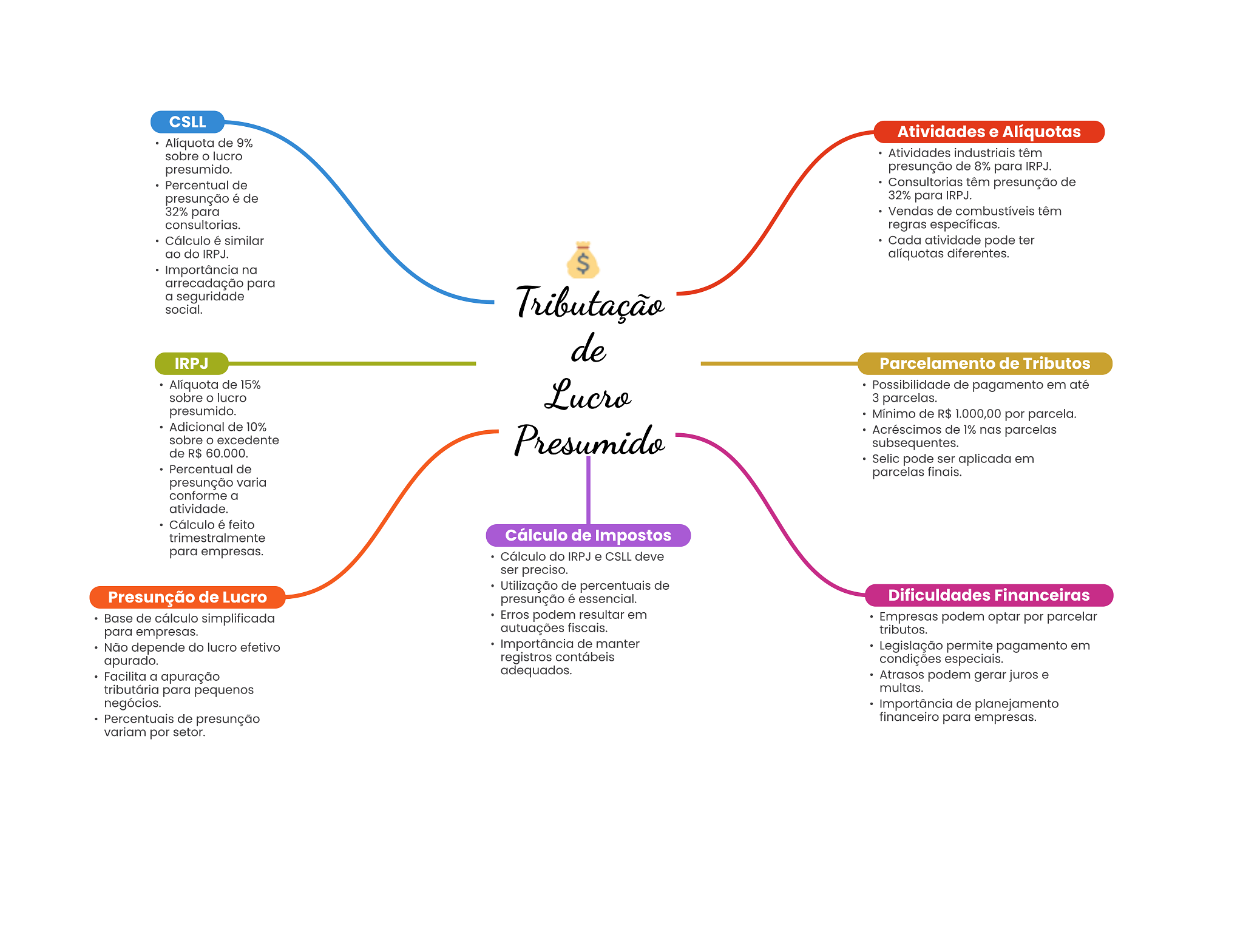 CSLL Atividades e Alíquotas Alíquota de 9% sobre lucro Atividades industriais têm presumido. presunção de 8% para IRPJ. Percentual de Consultorias têm presunção de presunção é de 32% para IRPJ. 32% para Vendas de combustíveis têm consultorias. regras específicas. Cálculo é similar Cada atividade pode ter ao do IRPJ. Importância na $ alíquotas diferentes. arrecadação para a seguridade social. Tributação de IRPJ Parcelamento de Tributos Alíquota de 15% sobre lucro Lucro Possibilidade de pagamento em até 3 parcelas. presumido. Mínimo de R$ 1.000,00 por parcela. Adicional de 10% sobre excedente Presumido Acréscimos de 1% nas parcelas subsequentes. de R$ 60.000. Selic pode ser aplicada em Percentual de parcelas finais. presunção varia conforme a atividade. Cálculo é feito trimestralmente Cálculo de Impostos para empresas. Cálculo do IRPJ e CSLL deve ser preciso. Utilização de percentuais de Presunção de Lucro presunção é essencial. Dificuldades Financeiras Base de cálculo simplificada Erros podem resultar em Empresas podem optar por parcelar para empresas. autuações fiscais. tributos. Não depende do lucro efetivo Importância de manter Legislação permite pagamento em apurado. registros contábeis condições especiais. Facilita a apuração adequados. Atrasos podem gerar juros e tributária para pequenos multas. negócios. Importância de planejamento Percentuais de presunção financeiro para empresas. variam por setor.