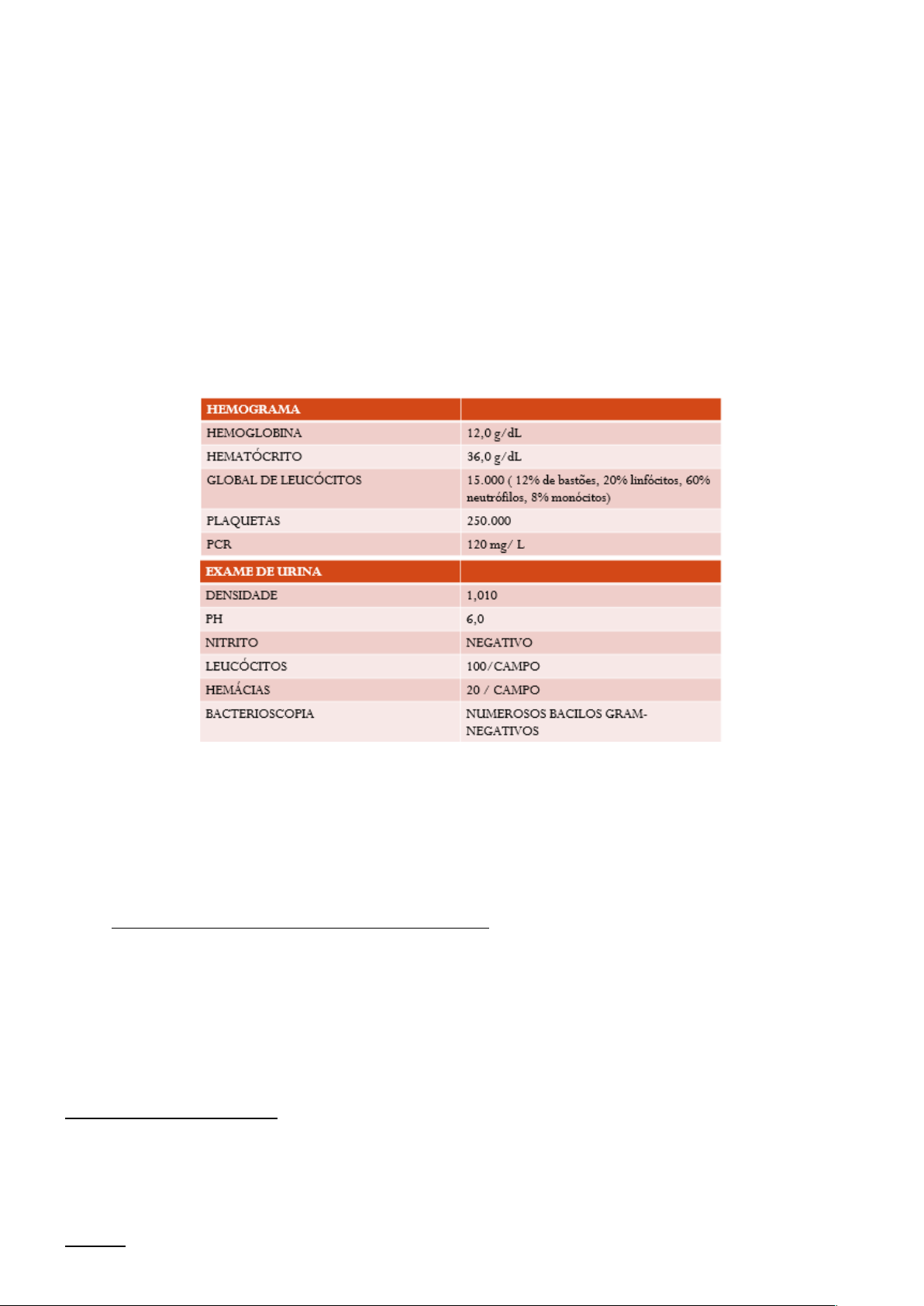 INFECÇÃO DO TRATO URINÁRIO NA INFÂNCIA CASO CLÍNICO HMA: Lactente, 6 meses, sexo masculino, branco, previamente hígido, chega ao pronto atendimento apresentando apenas febre e perda do apetite há mais de 72 horas (39 a 40 °C). Nega outras alterações. História pregressa: Nascido a termo, parto vaginal, com 38 semanas, PN: 3.400 g, sem intercorrências no período neonatal. Alimentação com leite materno exclusivo até 6 meses de idade, tendo iniciada dieta complementar a partir desse período. Esquema vacinal completo. Exame físico: · BEG, hidratado, febril (TAX: 39,1°C), pulsos. · ACV: RCR, 2T FC: 102 bpm. · AR: murmúrio vesicular simétrico, eupnéico, FR: 40 irpm. · Abdome: RHA presentes, sem visceromegalias. · Períneo: genitália masculina, testículos tópicos, fimose. Exames complementares: *Coleta por punção supra púbica. Hipótese diagnóstica? ITU – exame de urina sugestivo de ITU CONCEITO · Multiplicação bacteriana em qualquer segmento do aparelho urinário. IMPORTÂNCIA · Segunda infecção bacteriana mais comum em crianças (otite média aguda é a primeira). · Em lactente ITU é a infecção mais comum. · ITU representa 50% dos encaminhamentos à nefrologia infantil. · Se envolve o rim, pode causar cicatriz renal (decorrente do processo inflamatório) levando à hipertensão arterial secundária, insuficiência renal crônica e pré-eclâmpsia (se sexo feminino). · Diagnóstico correto é importante. · Lactentes maior risco. EPIDEMIOLOGIA - Mais comum no sexo feminino: · 3-4 até 20:1; · Maior proximidade da uretra com o ânus; · Menor comprimento da uretra; · Uso de roupas apertadas; · Ato de limpar-se de trás para a frente; - Meninos: · Fator de risco no sexo M Não circuncisados (crianças com fimose): 10-20:1; · Mais comum nos primeiros 6 meses de vida; · O primeiro surto geralmente ocorre antes dos 7 anos de idade; - Antes dos 6 meses de idade a prevalência de ITU será no sexo masculino, por causa de alteração anatômica. Após 6 meses passa a ser mais comum no sexo feminino. - Isso ocorre porque a ITU normalmente está relacionada com alteração anatômica e os meninos tem mais alteração anatômica do que as meninas ao nascimento. ETIOLOGI - Geralmente causadas por enterobactérias O principal agente etiológico é a E. coli. - Sexo feminino: · E. coli (80 a 90%) · Klebsiella (importantes em neonatos) · Proteus - No sexo masculino: · Os mesmos agentes · E. coli e Proteus são os mais comuns OBS: Infecções virais, particularmente adenovírus, também podem ocorrer, causando cistite. ETIOPATOGENIA - As infecções acontecem por via ascendente Fator de Ascenção · Bexiga é estéril. · 1/3 distal da uretra: colonizados por bactérias colônicas. · Meninos: prepúcio colonizado por bactérias. · Essas bactérias colonizadoras vão ascender, ou seja, subir pelo trato urinário até chegar no parênquima renal. · As fímbrias (pili), presentes na superfície das bactérias, se encarregam de fixá-las às células-alvo das vias urinárias. Principalmente na E. coli. · As bactérias podem alcançar os rins e causar pielonefrite. · A infecção renal também pode acontecer por disseminação hematogênica (menos comum) paciente tem infecção em outro local, cai na corrente sanguínea e vai para o rim. FATORES DE RISCO - Do hospedeiro: · ITU materna ao nascimento (a mãe estava com ITU no momento do nascimento, se a criança nascer com infecção diz que ele está com sepse neonatal. · Aleitamento artificial · Sexo feminino · Meninos não circuncisados · Refluxo vésico-ureteral (pielonefrite) alteração anatômica que a criança pode nascer com ela sendo mais comum em meninos. · Disfunção miccional · Uropatia obstrutiva · Higiene inadequada · Constipação · Uso prévio de antibioticoterapia com repercussão na flora intestinal normal DIAGNÓSTICO · Clínico e Laboratorial MANIFESTAÇÕES CLÍNICAS DA ITU EM CRIANÇAS · Crianças sem controle esfincteriano vai ter basicamente sintomas inespecíficos (Ex.: criança que chega com Febre sem sinais de localização - FSSL). · Em lactentes mesmo se sintomas inespecíficos está indicado realizar o tratamento. A clínica pode variar devido aos seguintes fatores: - Idade (controle esfincteriano); - Segmento acometido; · Cistite: sintomas mais leves · Pielonefrite: sintomas mais graves - Intensidade da resposta inflamatória. MANIFESTAÇÕES – LOCALIZAÇÃO - Uretrite/Cistite: · Aumento da frequência ao urinar (Polaciúria). · Disúria. · Incontinência urinária. · Dor suprapúbica. · Alteração na cor, volume e odor da urina. · Em crianças 10 a 20% dos casos na cistite pode ter febre, não conseguindo diferenciar se é cistite ou pielonefrite. - Pielonefrite: · Febre. · Dor lombar ou abdominal. · Mal-estar, náuseas, vômitos. · Sepse: taquicardia, taquipnéia, toxemia. Dessa forma, no primeiro ano de idade considera que toda criança com febre está apresentando pielonefrite. DIAGNÓSTICO DIFERENCIAL CISTITE · Vaginite. · Corpo estranho vaginal. · Corpo estranho uretral. · Oxiuríase. · Irritantes locais: sabonetes líquidos. · Abuso sexual. Na embriologia, o mesmo folheto embrionário que forma as falanges e orelhas forma também o aparelho renal. Assim toda vez que nasce criança com polidactilia, apêndice pre-auricular e forame auricular deve-se pedir UGS de vias urinárias em busca de má formação do sistema urinário. Avaliação da PA: em crianças o obrigatório é aferir a pressão a partir de 3 anos de idade, porém nas crianças que tiverem histórico de patologias renais deve-se aferir antes. DIAGNÓSTICO · Diagnóstico clínico laboratorial · Exame padrão ouro: urocultura. Crianças sem controle esfincteriano: · Coleta por punção supra púbica. · Coleta por cateterismo vesical principal método utilizado na prática Crianças com controle esfincteriano: · Jato médio; Saco coletor não deve ser utilizado pa