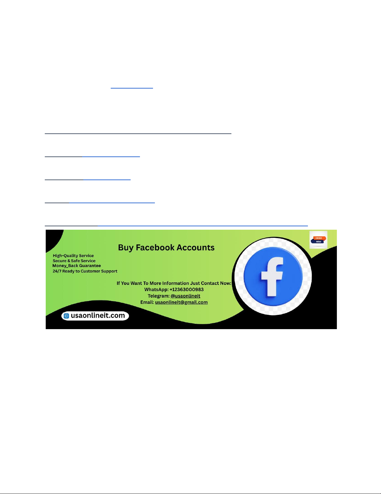 In the digital age, Facebook remains one of the most influential social media platforms worldwide, especially in the USA. For businesses, marketers, or individuals looking to boost their online presence, acquiring aged Facebook accounts can be a game-changer. However, finding reliable sources to purchase these accounts safely is crucial to avoid scams, account bans, or legal issues. USAOnlineIT has compiled a list of the top 10 trustworthy websites where you can purchase old Facebook accounts securely in the USA. This guide covers essential factors to consider, the benefits of buying aged accounts, and detailed insights into each platform's reliability. If You Want To More Information Just Contact Now: WhatsApp:+12363000983 Telegram: @usaonlineit Email: usaonlineit@gmail.com Websites Link :https://usaonlineit.com/product/buy-facebook-accounts/ Why Purchase Old Facebook Accounts? Buying old Facebook accounts offers numerous advantages for users aiming to establish credibility quickly. Older accounts often come with an established history, which adds authenticity to new profiles or marketing campaigns. Such accounts tend to have more friends, engagement, and activity history, making them more trustworthy in the eyes of Facebook’s algorithms. For businesses, using aged accounts can improve ad performance and reduce the risk of account bans. Additionally, aged accounts often have a preserved followers list, photos, and posts, providing a head start for marketing or networking efforts. However, authenticity and safety are paramount, which is why sourcing from reputable sellers is essential. Purchasing from reliable platforms ensures that accounts are genuine, have clean histories, and are less likely to be flagged or suspended. This approach minimizes risks and guarantees that your social media strategy remains uninterrupted. https://usaonlineit.com/product/buy-facebook-accounts/ https://usaonlineit.com/product/buy-facebook-accounts/ https://usaonlineit.com/product/buy-facebook-accounts/ https://usaonlineit.com/product/buy-facebook-accounts/ Factors to Consider When Buying Facebook Accounts Before purchasing an old Facebook account, several factors must be evaluated to ensure safety and value. First, verify the credibility of the seller or platform—look for reviews, ratings, and customer feedback. Second, check the account’s age and activity history; older, active accounts are more valuable. Third, ensure the account has a genuine profile picture, friends, and activity that mimic real user behavior. Fourth, inquire about the account’s creation details and whether it has any restrictions or bans. Privacy and security are also critical; ensure the seller provides secure payment options and guarantees account transfer without personal data leaks. Additionally, consider customer support services in case of issues post-purchase. Finally, compare prices across platforms to ensure you're paying a fair rate. Buying from a trustworthy source who adheres to Facebook’s policies reduces the risk of account suspension and ensures long-term usability. The Importance of Reputation and Reviews Reputation plays a vital role when selecting a platform to buy old Facebook accounts. Reputable websites have transparent reviews and testimonials from previous buyers, which can be found on independent review sites or social media forums. Reading these reviews helps you gauge the reliability and authenticity of the seller. A platform with consistently positive feedback indicates a high level of customer satisfaction and minimal issues related to account quality or safety. Conversely, platforms with numerous complaints or negative reviews should be approached with caution. Additionally, reliable sellers often provide guarantees or warranties for the accounts they sell, offering refunds or replacements if issues occur shortly after purchase. USAOnlineIT emphasizes the importance of choosing platforms with proven track records, as this minimizes the risk of scams or receiving low-quality accounts. Always prioritize sellers who are transparent about their accounts’ histories and who demonstrate professionalism in their customer interactions. How to Identify a Legitimate Seller Identifying a legitimate seller is crucial for ensuring a safe purchase. First, verify if the platform provides detailed information about their accounts, including creation date, activity levels, and account history. Second, check for verified customer reviews and testimonials, preferably from independent sources. Third, assess the seller’s communication transparency—prompt responses and clear policies indicate professionalism. Fourth, look for secure payment options, such as credit cards or trusted payment gateways, which offer buyer protection. Fifth, inquire about guarantees—reliable sellers often provide warranties or refund policies if the account is banned or flagged soon after purchase. Sixth, evaluate the seller’s website design and professionalism; reputable vendors invest in a polished online presence. Seventh, ask for proof of account ownership transfer procedures to ensure the account is legally and securely handed over. Following these steps will help you steer clear of scams and work with trustworthy vendors who prioritize customer satisfaction and safety. Benefits of Buying Old Facebook Accounts for Businesses https://usaonlineit.com/product/buy-facebook-accounts/ For businesses, using old Facebook accounts can significantly enhance marketing efforts and customer engagement. Established accounts come with a built-in network of friends or followers, allowing immediate outreach without starting from scratch. This instant credibility can improve ad performance and organic engagement, leading to better reach and conversion rates. Additionally, old accounts often have a history of posts, interactions, and activity, which adds authenticity and trustworthiness. For brand building, purchasing aged accounts minimizes the t