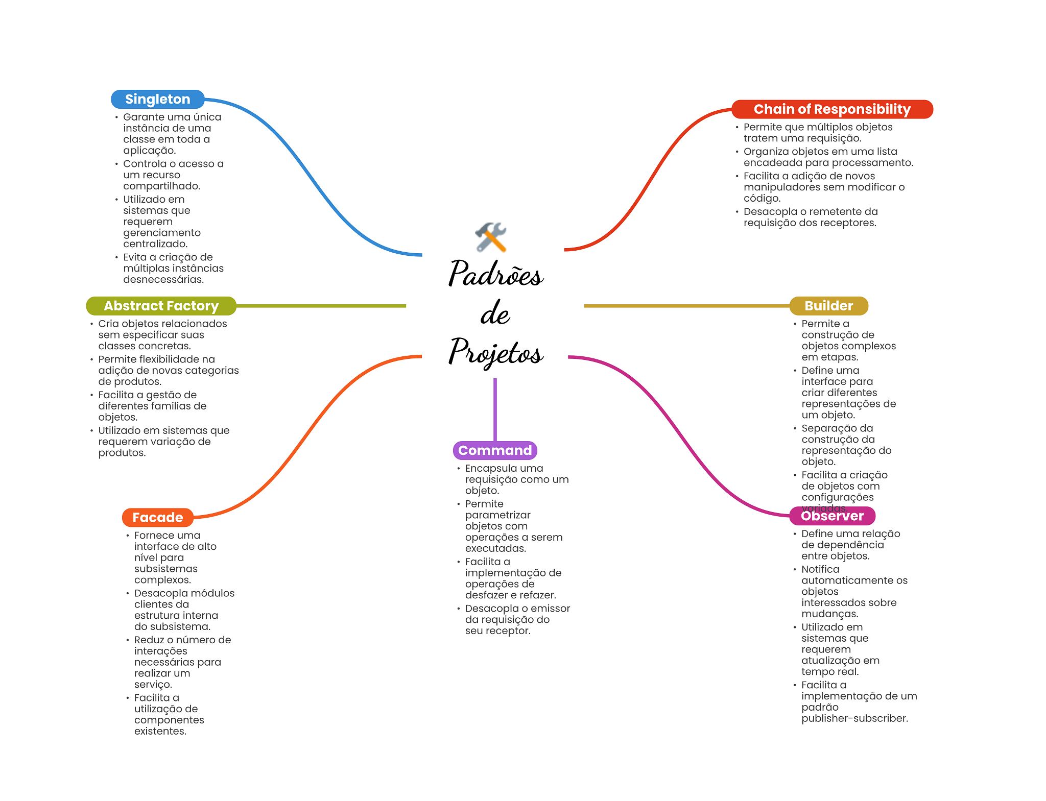 Singleton Garante uma única Chain of Responsibility instância de uma Permite que múltiplos objetos classe em toda a tratem uma requisição. aplicação. Organiza objetos em uma lista Controla acesso a encadeada para processamento. um recurso Facilita a adição de novos compartilhado. manipuladores sem modificar O Utilizado em código. sistemas que Desacopla O remetente da requerem requisição dos receptores. gerenciamento centralizado. Evita a criação de múltiplas instâncias desnecessárias. Padrões Abstract Factory de Builder Cria objetos relacionados Permite a sem especificar suas construção de classes concretas. Projetos objetos complexos Permite flexibilidade na em etapas. adição de novas categorias Define uma de produtos. interface para Facilita a gestão de criar diferentes diferentes famílias de representações de objetos. um objeto. Utilizado em sistemas que Separação da requerem variação de construção da produtos. Command representação do objeto. Encapsula uma requisição como um Facilita a criação objeto. de objetos com configurações Permite Facade parametrizar Observer objetos com Fornece uma operações a serem Define uma relação interface de alto executadas. de dependência nível para Facilita a entre objetos. subsistemas implementação de Notifica complexos. operações de automaticamente os Desacopla módulos desfazer e refazer. objetos clientes da interessados sobre Desacopla O emissor estrutura interna da requisição do mudanças. do subsistema. seu receptor. Utilizado em Reduz O número de sistemas que interações requerem necessárias para atualização em realizar um tempo real. serviço. Facilita a Facilita a implementação de um utilização de padrão componentes publisher-subscriber. existentes.