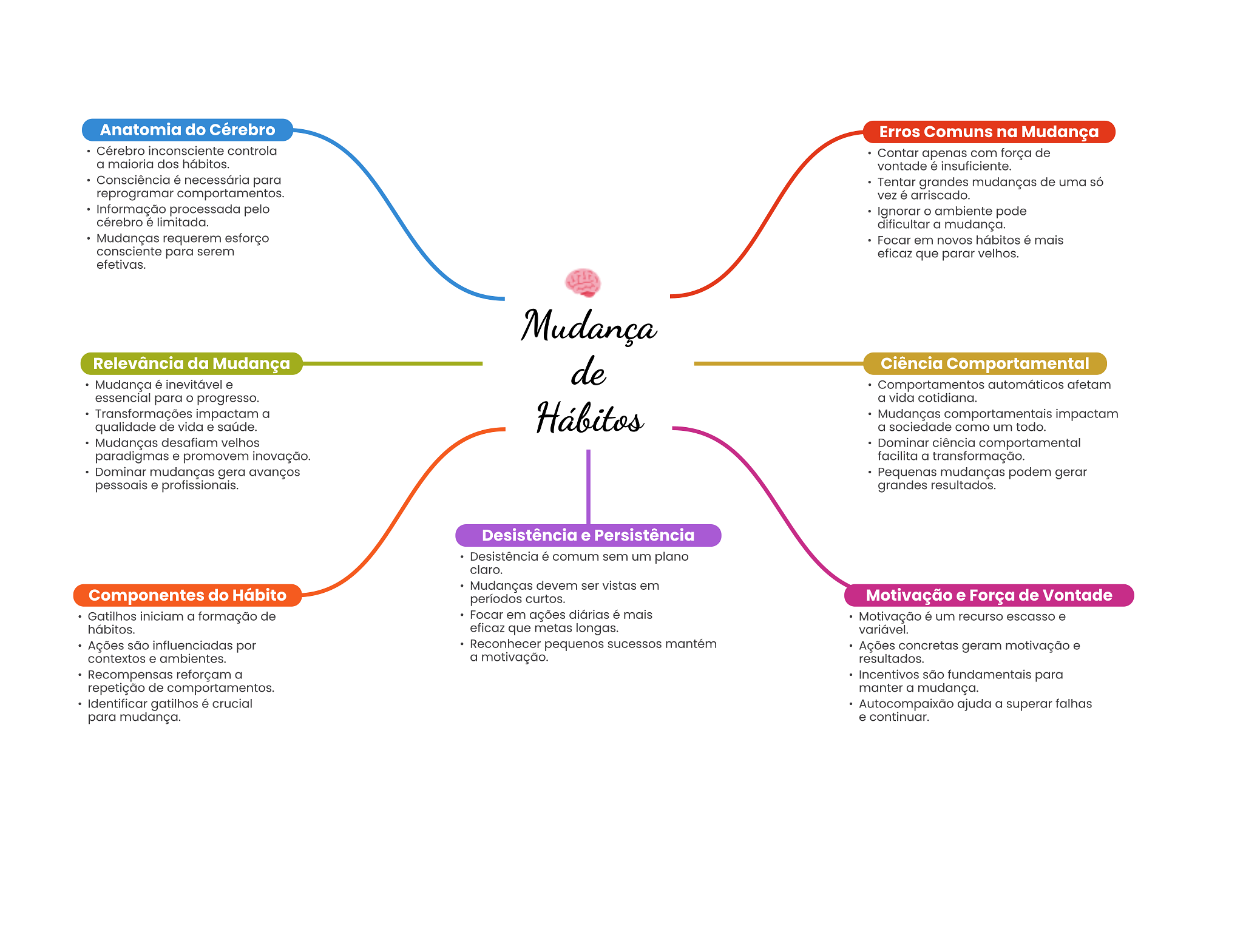 Anatomia do Cérebro Erros Comuns na Mudança Cérebro inconsciente controla Contar apenas com força de a maioria dos hábitos. vontade é insuficiente. Consciência é necessária para Tentar grandes mudanças de uma só reprogramar comportamentos. vez é arriscado. Informação processada pelo Ignorar ambiente pode cérebro é limitada. dificultar a mudança. Mudanças requerem esforço Focar em novos hábitos é mais consciente para serem eficaz que parar velhos. efetivas. Mudança Relevância da Mudança de Ciência Comportamental Mudança é inevitável e Comportamentos automáticos afetam essencial para progresso. a vida cotidiana. Transformações impactam a Hábitos Mudanças comportamentais impactam qualidade de vida e saúde. a sociedade como um todo. Mudanças desafiam velhos Dominar ciência comportamental paradigmas e promovem inovação. facilita a transformação. Dominar mudanças gera avanços Pequenas mudanças podem gerar pessoais e profissionais. grandes resultados. Desistência e Persistência Desistência é comum sem um plano claro. Mudanças devem ser vistas em Componentes do Hábito períodos curtos. Motivação e Força de Vontade Gatilhos iniciam a formação de Focar em ações diárias é mais Motivação é um recurso escasso e hábitos. eficaz que metas longas. variável. Ações são influenciadas por Reconhecer pequenos sucessos mantém Ações concretas geram motivação e contextos e ambientes. a motivação. resultados. Recompensas reforçam a Incentivos são fundamentais para repetição de comportamentos. manter a mudança. Identificar gatilhos é crucial Autocompaixão ajuda a superar falhas para mudança. e continuar.