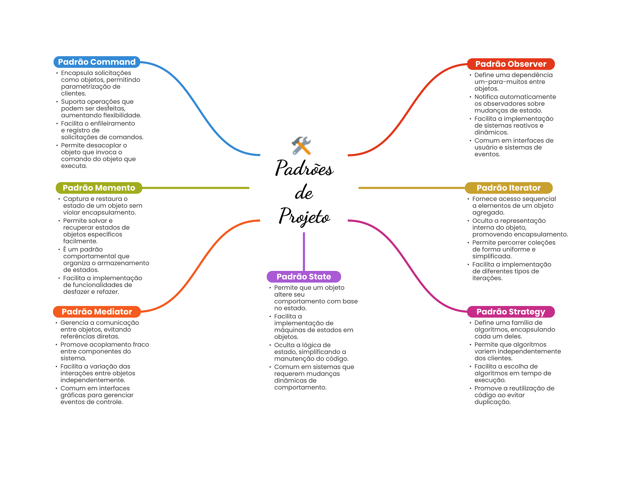Padrão Command Padrão Observer Encapsula solicitações Define uma dependência como objetos, permitindo um-para-muitos entre parametrização de objetos. clientes. Notifica automaticamente Suporta operações que observadores sobre podem ser desfeitas, mudanças de estado. aumentando flexibilidade. Facilita a implementação Facilita enfileiramento de sistemas reativos e e registro de dinâmicos. solicitações de comandos. Comum em interfaces de Permite desacoplar usuário e sistemas de objeto que invoca O eventos. comando do objeto que executa. Padrões Padrão Memento de Padrão Iterator Captura e restaura Fornece acesso sequencial estado de um objeto sem a elementos de um objeto violar encapsulamento. Permite salvar e Projeto agregado. Oculta a representação recuperar estados de interna do objeto, objetos específicos promovendo encapsulamento. facilmente. Permite percorrer coleções É um padrão de forma uniforme e comportamental que simplificada. organiza armazenamento Facilita a implementação de estados. de diferentes tipos de Facilita a implementação Padrão State iterações. de funcionalidades de Permite que um objeto desfazer e refazer. altere seu comportamento com base Padrão Mediator no estado. Facilita a Padrão Strategy Gerencia a comunicação implementação de Define uma família de entre objetos, evitando máquinas de estados em algoritmos, encapsulando referências diretas. objetos. cada um deles. Promove acoplamento fraco Oculta a lógica de Permite que algoritmos entre componentes do estado, simplificando a variem independentemente sistema. manutenção do código. dos clientes. Facilita a variação das Comum em sistemas que Facilita a escolha de interações entre objetos requerem mudanças algoritmos em tempo de independentemente. dinâmicas de execução. Comum em interfaces comportamento. Promove a reutilização de gráficas para gerenciar código ao evitar eventos de controle. duplicação.