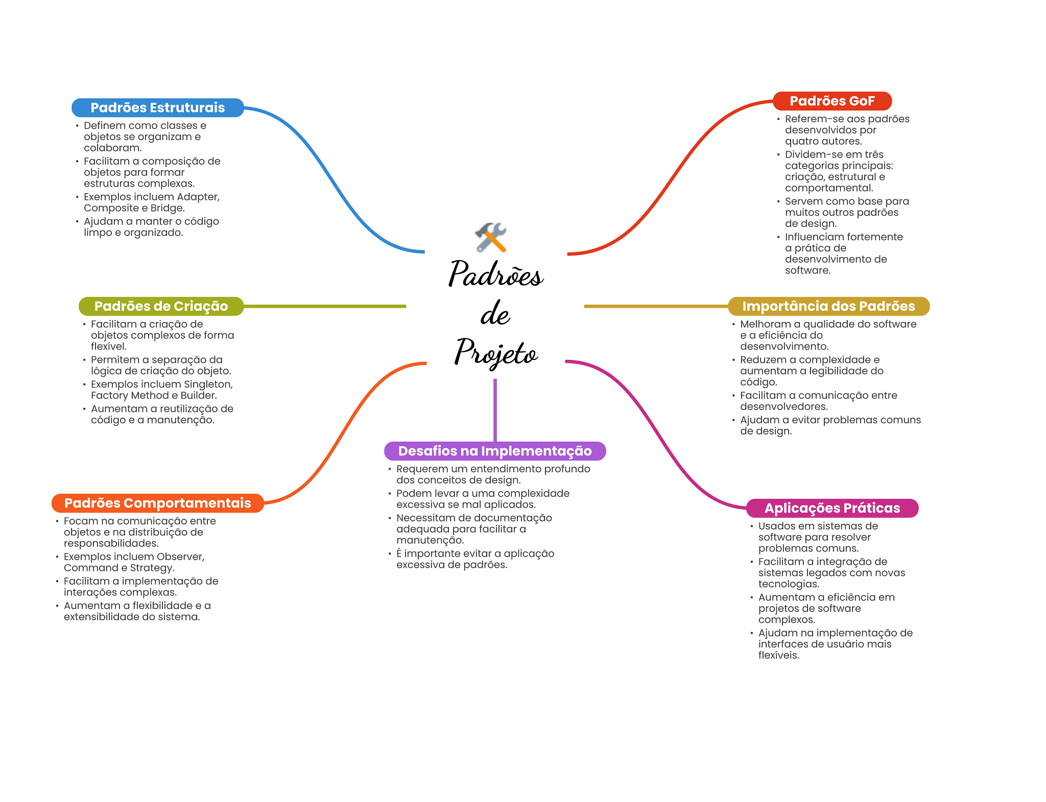 Padrões Estruturais Padrões GoF Referem-se aos padrões Definem como classes e desenvolvidos por objetos se organizam e quatro autores. colaboram. Dividem-se em três Facilitam a composição de categorias principais: objetos para formar criação, estrutural e estruturas complexas. comportamental. Exemplos incluem Adapter, Servem como base para Composite e Bridge. muitos outros padrões Ajudam a manter código de design. limpo e organizado. Influenciam fortemente a prática de desenvolvimento de Padrões software. Padrões de Criação de Importância dos Padrões Facilitam a criação de Melhoram a qualidade do software objetos complexos de forma e a eficiência do flexível. Permitem a separação da Projeto desenvolvimento. Reduzem a complexidade e lógica de criação do objeto. aumentam a legibilidade do Exemplos incluem Singleton, código. Factory Method e Builder. Facilitam a comunicação entre Aumentam a reutilização de desenvolvedores. código e a manutenção. Ajudam a evitar problemas comuns de design. Desafios na Implementação Requerem um entendimento profundo dos conceitos de design. Podem levar a uma complexidade Padrões Comportamentais excessiva se mal aplicados. Aplicações Práticas Focam na comunicação entre Necessitam de documentação objetos e na distribuição de adequada para facilitar a Usados em sistemas de responsabilidades. manutenção. software para resolver É importante evitar a aplicação problemas comuns. Exemplos incluem Observer, excessiva de padrões. Facilitam a integração de Command e Strategy. sistemas legados com novas Facilitam a implementação de tecnologias. interações complexas. Aumentam a eficiência em Aumentam a flexibilidade e a projetos de software extensibilidade do sistema. complexos. Ajudam na implementação de interfaces de usuário mais flexíveis.