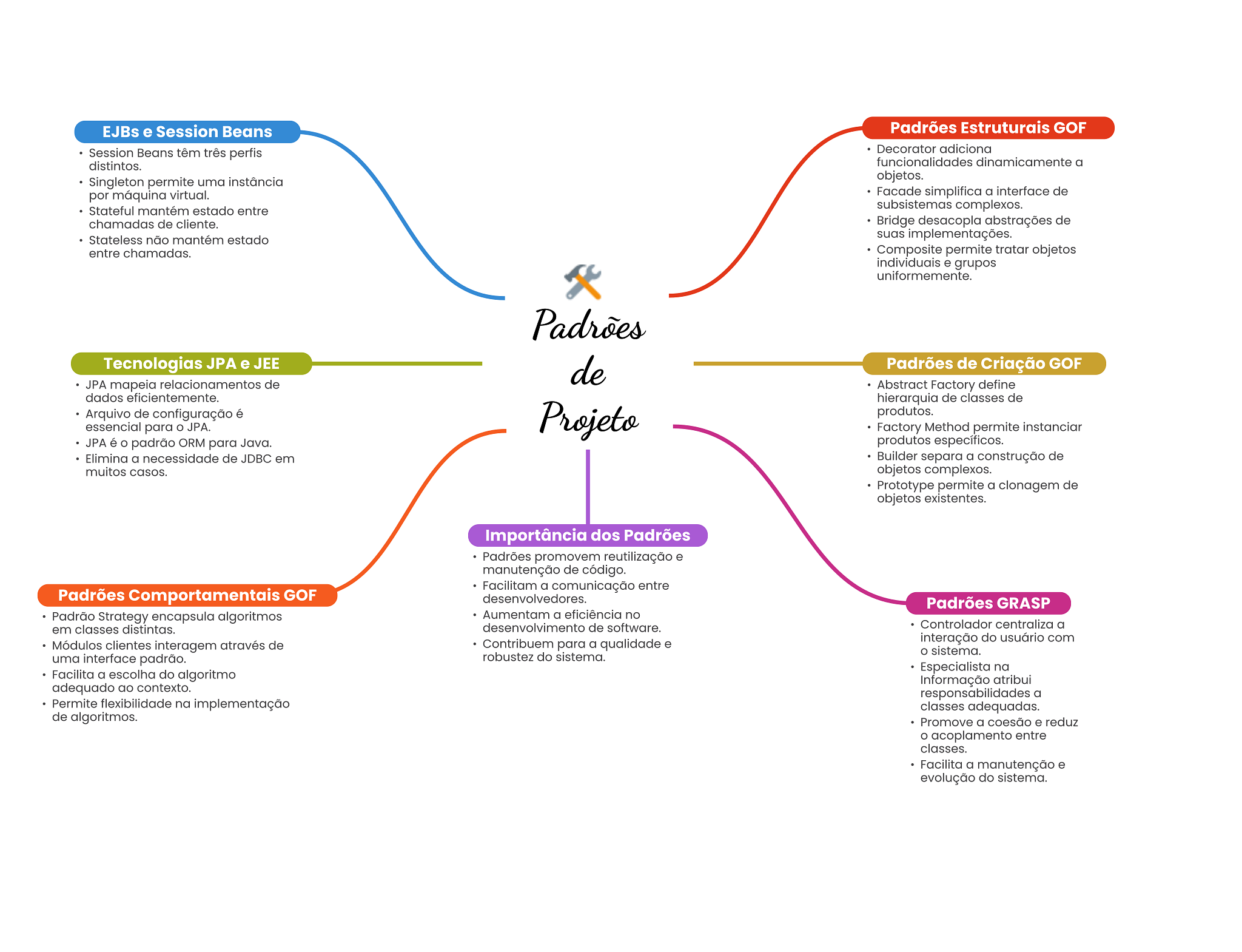 EJBs e Session Beans Padrões Estruturais GOF Session Beans têm três perfis Decorator adiciona distintos. funcionalidades dinamicamente a Singleton permite uma instância objetos. por máquina virtual. Facade simplifica a interface de Stateful mantém estado entre subsistemas complexos. chamadas de cliente. Bridge desacopla abstrações de Stateless não mantém estado suas implementações. entre chamadas. Composite permite tratar objetos individuais e grupos uniformemente. Padrões Tecnologias JPA e JEE de Padrões de Criação GOF JPA mapeia relacionamentos de Abstract Factory define dados eficientemente. hierarquia de classes de Arquivo de configuração é Projeto produtos. essencial para JPA. Factory Method permite instanciar JPA é padrão ORM para Java. produtos específicos. Elimina a necessidade de JDBC em Builder separa a construção de muitos casos. objetos complexos. Prototype permite a clonagem de objetos existentes. Importância dos Padrões Padrões promovem reutilização e manutenção de código. Facilitam a comunicação entre Padrões Comportamentais GOF desenvolvedores. Padrões GRASP Padrão Strategy encapsula algoritmos Aumentam a eficiência no em classes distintas. desenvolvimento de software. Controlador centraliza a Módulos clientes interagem através de Contribuem para a qualidade e interação do usuário com O sistema. uma interface padrão. robustez do sistema. Especialista na Facilita a escolha do algoritmo Informação atribui adequado ao contexto. responsabilidades a Permite flexibilidade na implementação classes adequadas. de algoritmos. Promove a coesão e reduz acoplamento entre classes. Facilita a manutenção e evolução do sistema.