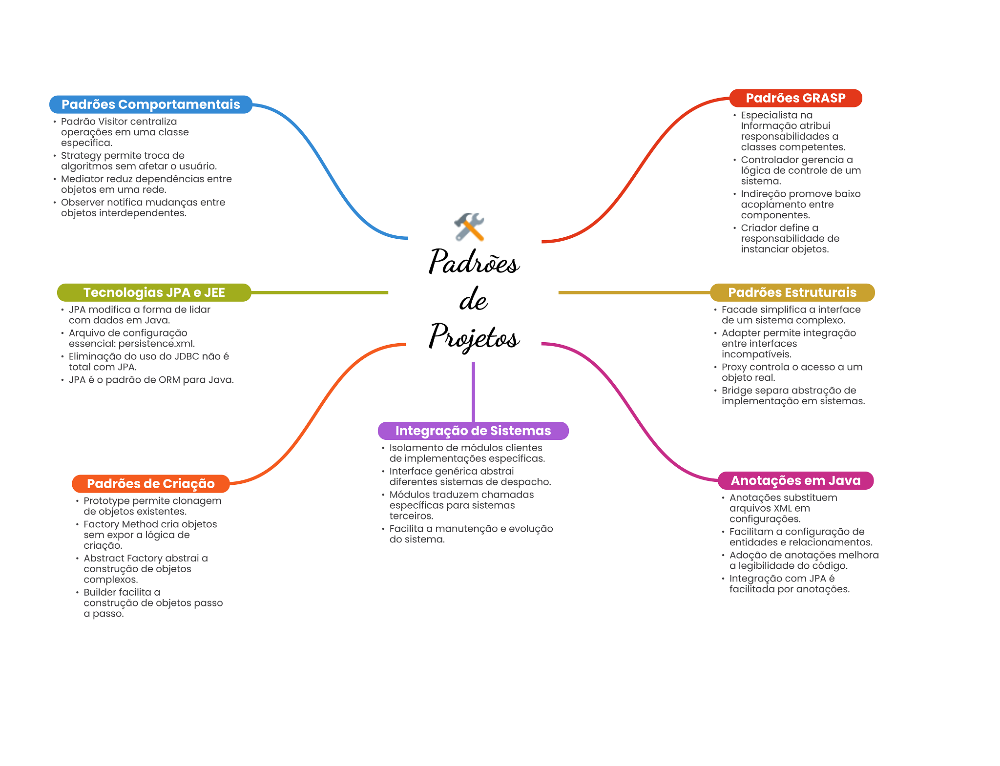 Padrões GRASP Padrões Comportamentais Especialista na Padrão Visitor centraliza Informação atribui operações em uma classe responsabilidades a específica. classes competentes. Strategy permite troca de Controlador gerencia a algoritmos sem afetar usuário. lógica de controle de um Mediator reduz dependências entre sistema. objetos em uma rede. Indireção promove baixo Observer notifica mudanças entre acoplamento entre objetos interdependentes. componentes. Criador define a responsabilidade de instanciar objetos. Padrões Tecnologias JPA e JEE de Padrões Estruturais JPA modifica a forma de lidar Facade simplifica a interface com dados em Java. de um sistema complexo. Arquivo de configuração Projetos Adapter permite integração essencial: persistence.xml. entre interfaces Eliminação do uso do JDBC não é incompatíveis. total com JPA. Proxy controla O acesso a um JPA é padrão de ORM para Java. objeto real. Bridge separa abstração de implementação em sistemas. Integração de Sistemas Isolamento de módulos clientes de implementações específicas. Interface genérica abstrai Padrões de Criação diferentes sistemas de despacho. Anotações em Java Módulos traduzem chamadas Prototype permite clonagem Anotações substituem específicas para sistemas de objetos existentes. arquivos XML em terceiros. Factory Method cria objetos configurações. Facilita a manutenção e evolução sem expor a lógica de Facilitam a configuração de do sistema. criação. entidades e relacionamentos. Abstract Factory abstrai a Adoção de anotações melhora construção de objetos a legibilidade do código. complexos. Integração com JPA é Builder facilita a facilitada por anotações. construção de objetos passo a passo.