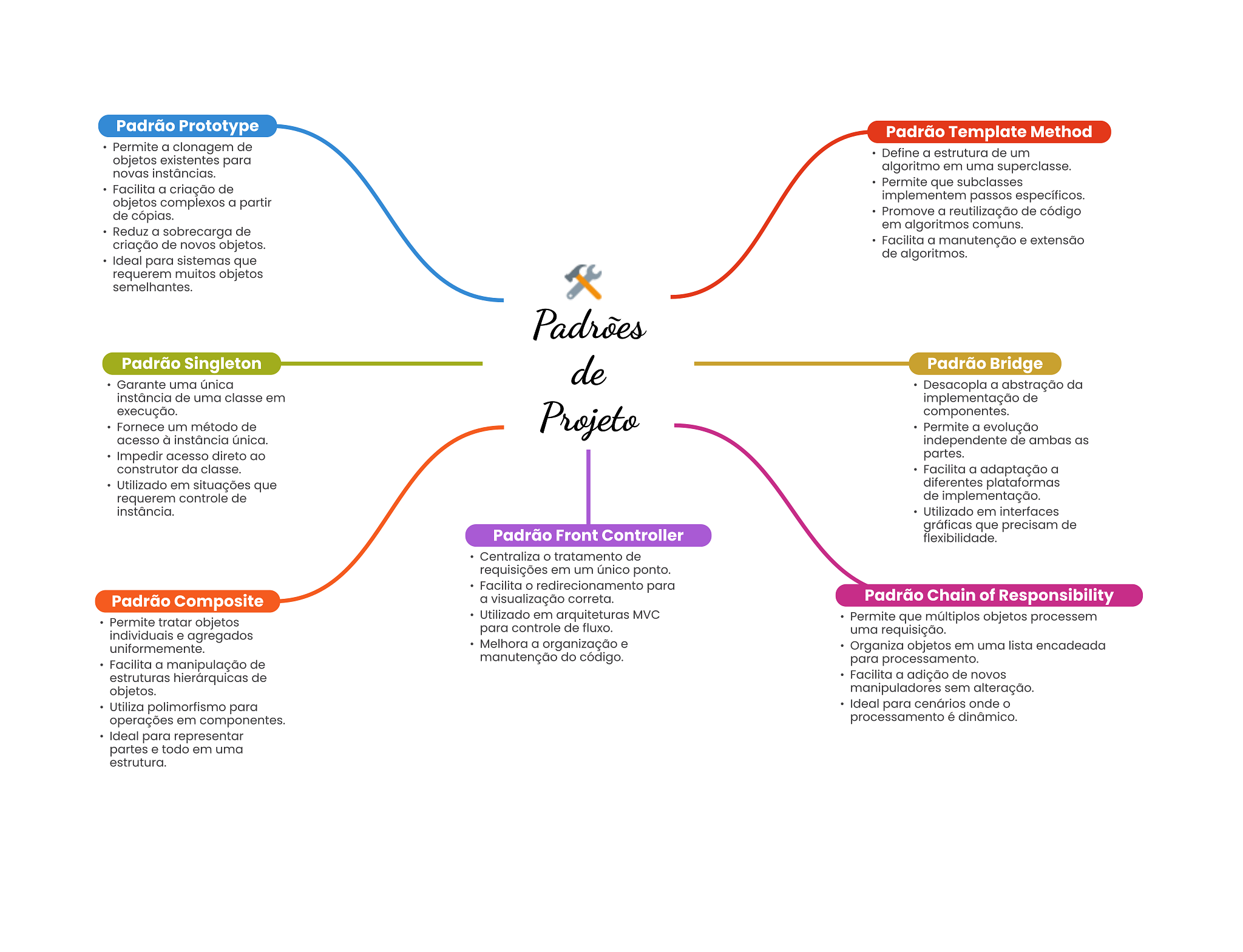 Padrão Prototype Padrão Template Method Permite a clonagem de Define a estrutura de um objetos existentes para novas instâncias. algoritmo em uma superclasse. Permite que subclasses Facilita a criação de implementem passos específicos. objetos complexos a partir de cópias. Promove a reutilização de código em algoritmos comuns. Reduz a sobrecarga de criação de novos objetos. Facilita a manutenção e extensão de algoritmos. Ideal para sistemas que requerem muitos objetos semelhantes. Padrões Padrão Singleton de Padrão Bridge Garante uma única Desacopla a abstração da instância de uma classe em implementação de execução. Fornece um método de Projeto componentes. Permite a evolução acesso à instância única. independente de ambas as Impedir acesso direto ao partes. construtor da classe. Facilita a adaptação a Utilizado em situações que diferentes plataformas requerem controle de de implementação. instância. Utilizado em interfaces gráficas que precisam de Padrão Front Controller flexibilidade. Centraliza O tratamento de requisições em um único ponto. Facilita para Padrão Composite a visualização correta. Padrão Chain of Responsibility Utilizado em arquiteturas MVC Permite tratar objetos Permite que múltiplos objetos processem para controle de fluxo. individuais e agregados uma requisição. uniformemente. Melhora a organização e Organiza objetos em uma lista encadeada manutenção do código. Facilita a manipulação de para processamento. estruturas hierárquicas de Facilita a adição de novos objetos. manipuladores sem alteração. Utiliza polimorfismo para Ideal para cenários onde O operações em componentes. processamento é dinâmico. Ideal para representar partes e todo em uma estrutura.