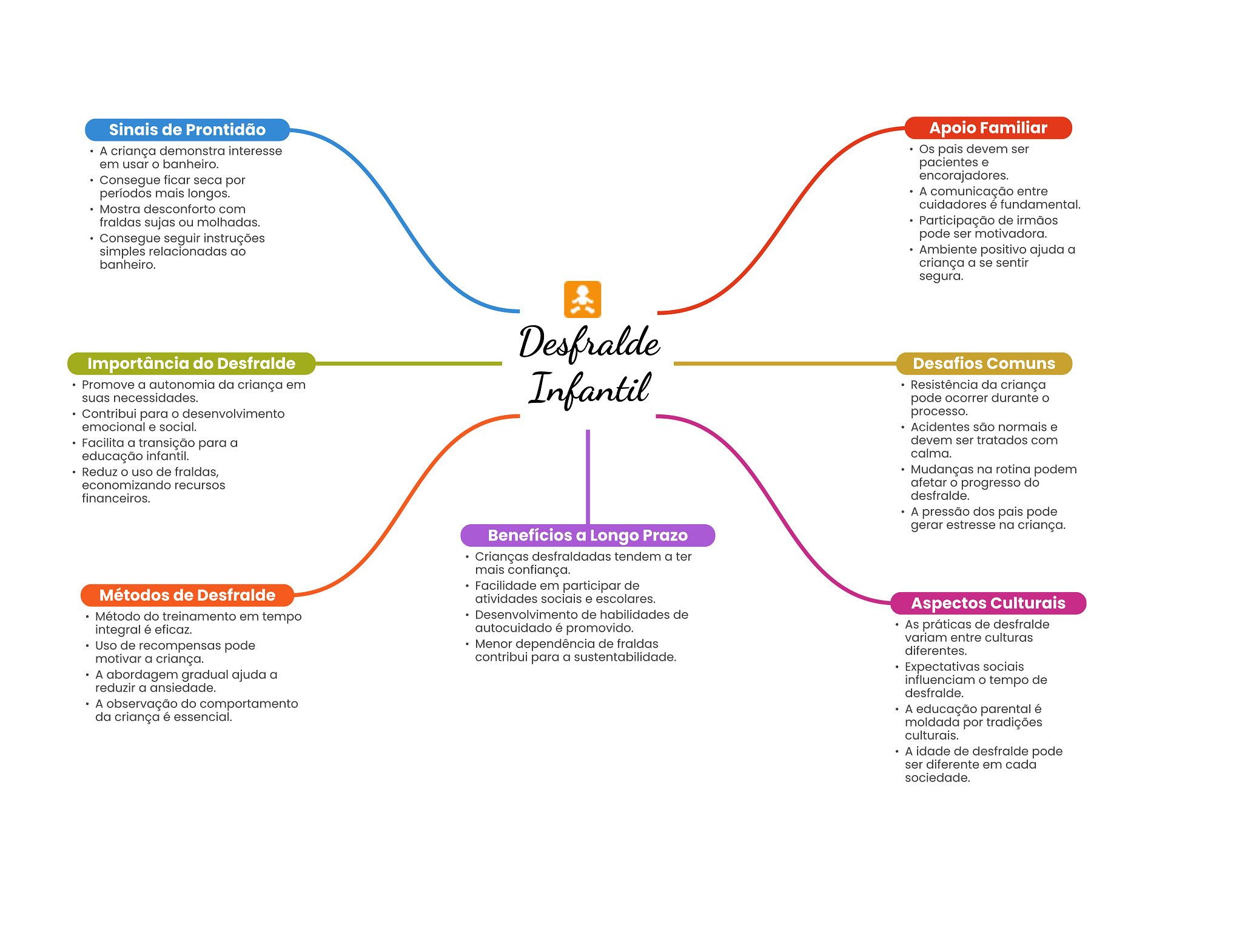 Sinais de Prontidão Apoio Familiar A criança demonstra interesse Os pais devem ser em usar banheiro. pacientes e Consegue ficar seca por encorajadores. períodos mais longos. A comunicação entre Mostra desconforto com cuidadores é fundamental. fraldas sujas ou molhadas. Participação de irmãos Consegue seguir instruções pode ser motivadora. simples relacionadas ao Ambiente positivo ajuda a banheiro. criança a se sentir segura. Desfralde Importância do Desfralde Desafios Comuns Promove a autonomia da criança em Infantil Resistência da criança suas necessidades. pode ocorrer durante Contribui para O desenvolvimento processo. emocional e social. Acidentes são normais e Facilita a transição para a devem ser tratados com educação infantil. calma. Reduz O uso de fraldas, Mudanças na rotina podem economizando recursos afetar progresso do financeiros. desfralde. A pressão dos pais pode gerar estresse na criança. Benefícios a Longo Prazo Crianças desfraldadas tendem a ter mais confiança. Facilidade em participar de Métodos de Desfralde atividades sociais e escolares. Aspectos Culturais Método do treinamento em tempo Desenvolvimento de habilidades de integral é eficaz. autocuidado é promovido. As práticas de desfralde variam entre culturas Uso de recompensas pode Menor dependência de fraldas diferentes. motivar a criança. contribui para a sustentabilidade. Expectativas sociais A abordagem gradual ajuda a influenciam O tempo de reduzir a ansiedade. desfralde. A observação do comportamento A educação parental é da criança é essencial. moldada por tradições culturais. A idade de desfralde pode ser diferente em cada sociedade.