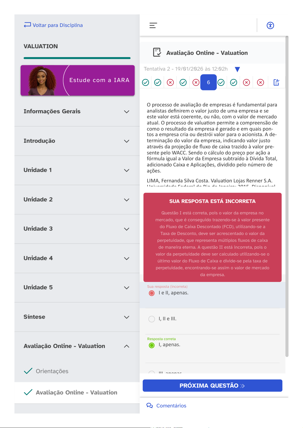 Avaliação Online - Valuation O processo de avaliação de empresas é fundamental para analistas definirem o valor justo de uma empresa e se este valor está coerente, ou não, com o valor de mercado atual. O processo de valuation permite a compreensão de como o resultado da empresa é gerado e em quais pon- tos a empresa cria ou destrói valor para o acionista. A de- terminação do valor da empresa, indicando valor justo através da projeção de fluxo de caixa trazido à valor pre- sente pelo WACC. Sendo o cálculo do preço por ação a fórmula igual a Valor da Empresa subtraído à Dívida Total, adicionado Caixa e Aplicações, dividido pelo número de ações. LIMA, Fernanda Silva Costa. Valuation Lojas Renner S.A. Universidade Federal do Rio de Janeiro: 2015 Disponível SUA RESPOSTA ESTÁ INCORRETA Questão I está correta, pois o valor da empresa no mercado, que é conseguido trazendo-se à valor presente do Fluxo de Caixa Descontado (FCD), utilizando-se a Taxa de Desconto, deve ser acrescentado o valor da perpetuidade, que representa múltiplos fluxos de caixa de maneira eterna. A questão II está incorreta, pois o valor da perpetuidade deve ser calculado utilizando-se o último valor do Fluxo de Caixa e divide-se pela taxa de perpetuidade, encontrando-se assim o valor de mercado da empresa. I e II, apenas. Sua resposta (incorreta) I, II e III. I, apenas. Resposta correta III, apenas. II III PRÓXIMA QUESTÃO ▼Tentativa 2 - 19/01/2026 às 12:02h 6 Comentários Voltar para Disciplina VALUATION Informações Gerais Introdução Unidade 1 Unidade 2 Unidade 3 Unidade 4 Unidade 5 Síntese Avaliação Online - Valuation Orientações Avaliação Online - Valuation Estude com a IARA 19/01/2026, 12:08 UNA DL https://student.ulife.com.br/ContentPlayer/Index?cd=8rRke%2fvMVu%2bvmjn83v5z3w%3d%3d&l=tNkKATnX96MB7WDezidQow%3d%3d&lc=9q… 1/1 https://student.ulife.com.br/Lesson/Index?cd=8rRke%2fvMVu%2bvmjn83v5z3w%3d%3d#pageIndex=1 https://student.ulife.com.br/ContentPlayer/Index?lc=9qJMJ6plgBJ1868iwygNcw%3d%3d&l=tNkKATnX96MB7WDezidQow%3d%3d&cd=8rRke%2fvMVu%2bvmjn83v5z3w%3d%3d&sl=wBN1%2fT2TpWK0fd%2f51VNIwQ%3d%3d&st=hulgLEiZ38R93fB27BzbHQ%3d%3d&oi=G%2bHs%2f%2f1fI8Fh5W6%2faeOVww%3d%3d