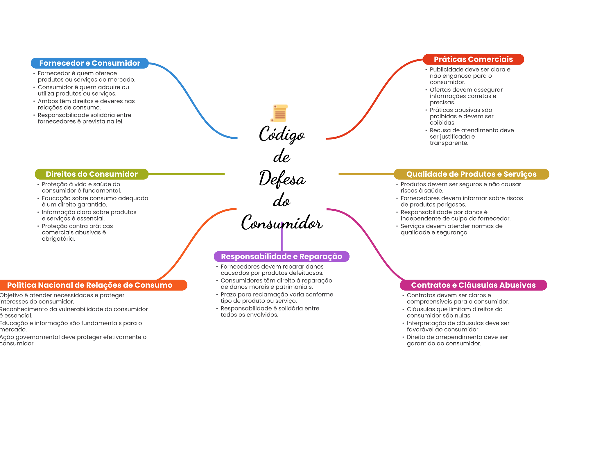 Práticas Comerciais Fornecedor e Consumidor Publicidade deve ser clara e Fornecedor é quem oferece não enganosa para produtos ou serviços ao mercado. consumidor. Consumidor é quem adquire ou Ofertas devem assegurar utiliza produtos ou serviços. informações corretas e Ambos têm direitos e deveres nas precisas. relações de consumo. Práticas abusivas são Responsabilidade solidária entre proibidas e devem ser fornecedores é prevista na lei. coibidas. Código Recusa de atendimento deve ser justificada e transparente. de Direitos do Consumidor Defesa Qualidade de Produtos e Serviços Proteção à vida e saúde do Produtos devem ser seguros e não causar consumidor é fundamental. riscos à saúde. Educação sobre consumo adequado é um direito garantido. do Fornecedores devem informar sobre riscos de produtos perigosos. Informação clara sobre produtos Responsabilidade por danos é e serviços é essencial. Proteção contra práticas Consumidor independente de culpa do fornecedor. Serviços devem atender normas de comerciais abusivas é qualidade e segurança. obrigatória. Responsabilidade e Reparação Fornecedores devem reparar danos causados por produtos defeituosos. Consumidores têm direito à reparação Política Nacional de Relações de Consumo de danos morais e patrimoniais. Contratos e Cláusulas Abusivas Objetivo é atender necessidades e proteger Prazo para reclamação varia conforme Contratos devem ser claros e interesses do consumidor. tipo de produto ou serviço. compreensíveis para consumidor. Reconhecimento da vulnerabilidade do consumidor Responsabilidade é solidária entre Cláusulas que limitam direitos do essencial. todos OS envolvidos. consumidor são nulas. Educação e informação são fundamentais para Interpretação de cláusulas deve ser mercado. favorável ao consumidor. Ação governamental deve proteger efetivamente Direito de arrependimento deve ser consumidor. garantido ao consumidor.