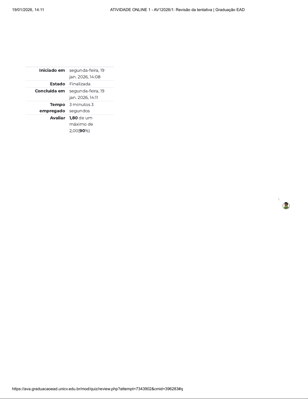 Iniciado em segunda-feira, 19 jan. 2026, 14:08 Estado Finalizada Concluída em segunda-feira, 19 jan. 2026, 14:11 Tempo empregado 3 minutos 3 segundos Avaliar 1,80 de um máximo de 2,00(90%) 1 19/01/2026, 14:11 ATIVIDADE ONLINE 1 - AV12026/1: Revisão da tentativa | Graduação EAD https://ava.graduacaoead.unicv.edu.br/mod/quiz/review.php?attempt=7343902&cmid=396283#question-7443142-1 1/13 Questão 1 Correto Atingiu 0,20 de 0,20 Ao iniciar a vida escolar as crianças Público-Alvo da Educação Especial se encontram em diferentes estágios de desenvolvimento e cabe ao professor identificar a real condição de cada criança para, a partir disso, traçar suas estratégias. A diferença no nível de desenvolvimento e aprendizagem pode sofrer influência de diversos fatores. Dentre os fatores que não influenciam no processo de desenvolvimento escolar, assinale a alternativa correta. Escolha uma opção: a. Estimulação que recebeu em casa e outros espaços fora da escola. b. Estimulação que não recebeu em casa e nem em outros espaços fora da escola. c. Estimulação que recebeu em casa, apenas. d. Características da deficiência e/ou transtorno do neurodesenvolvimento que possui. e. Características fenotípicas de grupos sociais específicos. ✓ 1 19/01/2026, 14:11 ATIVIDADE ONLINE 1 - AV12026/1: Revisão da tentativa | Graduação EAD https://ava.graduacaoead.unicv.edu.br/mod/quiz/review.php?attempt=7343902&cmid=396283#question-7443142-1 2/13 Questão 2 Correto Atingiu 0,20 de 0,20 A ludicidade é indispensável no processo de ensino aprendizagem de crianças Público-Alvo da Educação Especial (PAEE). Tais estratégias surtem efeito, pois as crianças conseguem interagir de uma forma mais ativa nas propostas desenvolvidas. Assinale a alternativa correta. Escolha uma opção: a. O uso de jogos e brincadeiras como ferramenta pedagógica se torna uma excelente maneira de ocupar o tempo as crianças PAEE, enquanto o professor desenvolve ações específicas com os demais estudantes. b. O uso de jogos na educação não deve ser cauteloso, uma vez que o estudante PAEE pode desenvolver bloqueios cognitivos ao se deparar com algumas regras necessárias. c. O uso de jogos na educação infantil, especificadamente deve ser extremamente cauteloso, uma vez que o estudante PAEE pode desenvolver bloqueios cognitivos ao se deparar com algumas regras necessárias. d. Os jogos e as brincadeiras são instrumentos pedagógicos importantes para o ✓ 1 19/01/2026, 14:11 ATIVIDADE ONLINE 1 - AV12026/1: Revisão da tentativa | Graduação EAD https://ava.graduacaoead.unicv.edu.br/mod/quiz/review.php?attempt=7343902&cmid=396283#question-7443142-1 3/13 desenvolvimento da criança, pois no jogar e no brincar elas desenvolvem habilidades necessárias para o seu processo de aquisição da linguagem escrita. e. O uso de jogos na educação deve ser cauteloso, uma vez que o estudante PAEE pode desenvolver bloqueios cognitivos ao se deparar com algumas regras necessárias. 1 19/01/2026, 14:11 ATIVIDADE ONLINE 1 - AV12026/1: Revisão da tentativa | Graduação EAD https://ava.graduacaoead.unicv.edu.br/mod/quiz/review.php?attempt=7343902&cmid=396283#question-7443142-1 4/13 Questão 3 Correto Atingiu 0,20 de 0,20 O uso de imagens no processo de ensino na língua escrita pode construir muito para o processo de assimilação da criança, uma vez que a criança consegue estabelecer relações das letras, sílabas e palavras com questões cotidianas. Sobre o uso de imagens neste processo, assinale a alternativa correta. Escolha uma opção: a. O uso de imagem é estratégia que faz uso da ludicidade, mas deve ser evitado para não se transformar em distração para criança. b. O uso de imagens com desenhos infantis dificulta a assimilação feita pela criança PAEE. c. O uso de imagens reais, sem estereótipos possibilitam a relação com o mundo real e com o contexto em que a criança PAEE está inserida. ✓ 1 19/01/2026, 14:11 ATIVIDADE ONLINE 1 - AV12026/1: Revisão da tentativa | Graduação EAD https://ava.graduacaoead.unicv.edu.br/mod/quiz/review.php?attempt=7343902&cmid=396283#question-7443142-1 5/13 Questão 4 Incorreto Atingiu 0,00 de 0,20 A alfabetização se dá de forma processual, sendo que diferentes autores apontam estágios da alfabetização, que as crianças vão adquirindo com o passar do tempo, a partir da mediação do professor. Sobre o processo de alfabetização, assinale a alternativa correta. Escolha uma opção: a. A habilidade de apreender sequencialmente o que é falado e transpor para o nível da escrita é o núcleo do domínio do código escrito. b. O processo de alfabetização de crianças deve iniciar no Ensino Fundamental, que é a segunda etapa da educação básica e se constitui como uma etapa preparatória para o ensino fundamental. c. O processo de alfabetização de crianças deve iniciar no Ensino Fundamental, que é a primeira etapa da educação básica e se constitui como uma etapa preparatória para o ensino fundamental. d. Ao iniciar a aprendizagem da leitura e da escrita, é imprescindível que a criança já possua noções básicas da estrutura letra-palavra-texto. e. O processo de alfabetização de crianças deve iniciar na Educação Infantil, que é a primeira etapa da educação × 1 19/01/2026, 14:11 ATIVIDADE ONLINE 1 - AV12026/1: Revisão da tentativa | Graduação EAD https://ava.graduacaoead.unicv.edu.br/mod/quiz/review.php?attempt=7343902&cmid=396283#question-7443142-1 6/13 Questão 5 Correto Atingiu 0,20 de 0,20 básica e se constitui como uma etapa preparatória para o ensino fundamental. Utilizando o jogo de construção de palavras como ferramenta para avaliação diagnóstica, o professor identificou que uma criança se encontra num nível inicial de conhecimento. Essa constatação pode ser feita quando a criança consegue indicar determinada condição adquirida. Assinale a alternativa correta. Escolha uma opção: a. Todas as sílabas da image