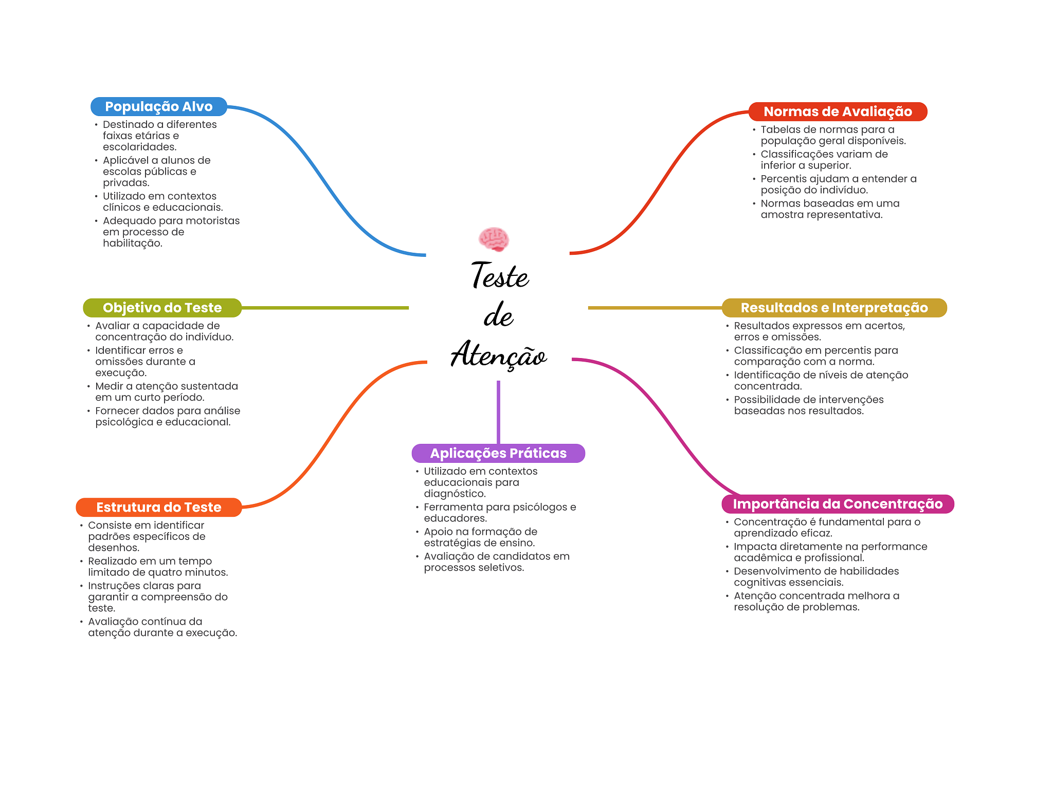 População Alvo Normas de Avaliação Destinado a diferentes faixas etárias e Tabelas de normas para a escolaridades. população geral disponíveis. Aplicável a alunos de Classificações variam de inferior a superior. escolas públicas e privadas. Percentis ajudam a entender a Utilizado em contextos posição do indivíduo. clínicos e educacionais. Normas baseadas em uma amostra representativa. Adequado para motoristas em processo de habilitação. Teste Objetivo do Teste de Resultados e Interpretação Avaliar a capacidade de Resultados expressos em acertos, concentração do indivíduo. erros e omissões. Identificar erros e omissões durante a Atenção Classificação em percentis para comparação com a norma. execução. Identificação de níveis de atenção Medir a atenção sustentada concentrada. em um curto período. Possibilidade de intervenções Fornecer dados para análise baseadas nos resultados. psicológica e educacional. Aplicações Práticas Utilizado em contextos educacionais para diagnóstico. Estrutura do Teste Ferramenta para psicólogos e Importância da Concentração educadores. Consiste em identificar Concentração é fundamental para padrões específicos de Apoio na formação de aprendizado eficaz. desenhos. estratégias de ensino. Impacta diretamente na performance Realizado em um tempo Avaliação de candidatos em acadêmica e profissional. limitado de quatro minutos. processos seletivos. Desenvolvimento de habilidades Instruções claras para cognitivas essenciais. garantir a compreensão do Atenção concentrada melhora a teste. resolução de problemas. Avaliação contínua da atenção durante a execução.