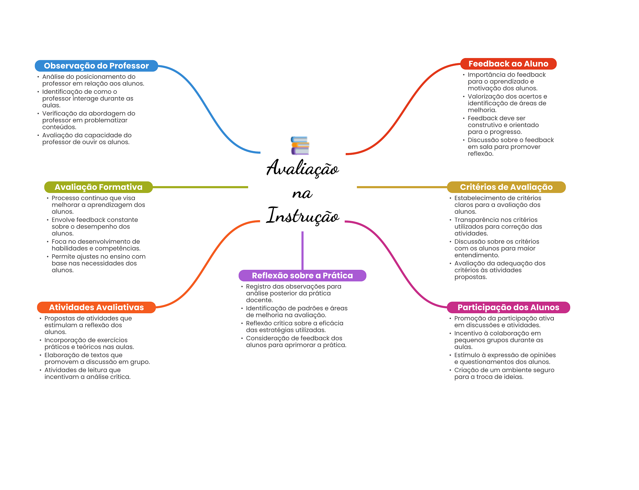 Observação do Professor Feedback ao Aluno Análise do posicionamento do Importância do feedback professor em relação aos alunos. para aprendizado e Identificação de como motivação dos alunos. professor interage durante as Valorização dos acertos e aulas. identificação de áreas de melhoria. Verificação da abordagem do professor em problematizar Feedback deve ser conteúdos. construtivo e orientado Avaliação da capacidade do para progresso. professor de ouvir OS alunos. Discussão sobre feedback em sala para promover reflexão. Avaliação Avaliação Formativa Critérios de Avaliação na Processo contínuo que visa Estabelecimento de critérios melhorar a aprendizagem dos claros para a avaliação dos alunos. Instrução alunos. Envolve feedback constante Transparência nos critérios sobre O desempenho dos utilizados para correção das alunos. atividades. Foca no desenvolvimento de Discussão sobre critérios habilidades e competências. com OS alunos para maior Permite ajustes no ensino com entendimento. base nas necessidades dos Avaliação da adequação dos alunos. critérios às atividades Reflexão sobre a Prática propostas. Registro das observações para análise posterior da prática docente. Atividades Avaliativas Identificação de padrões e áreas Participação dos Alunos Propostas de atividades que de melhoria na avaliação. Promoção da participação ativa estimulam a reflexão dos Reflexão crítica sobre a eficácia em discussões e atividades. alunos. das estratégias utilizadas. Incentivo à colaboração em Incorporação de exercícios Consideração de feedback dos pequenos grupos durante as práticos e teóricos nas aulas. alunos para aprimorar a prática. aulas. Elaboração de textos que Estímulo à expressão de opiniões promovem a discussão em grupo. e questionamentos dos alunos. Atividades de leitura que Criação de um ambiente seguro incentivam a análise crítica. para a troca de ideias.