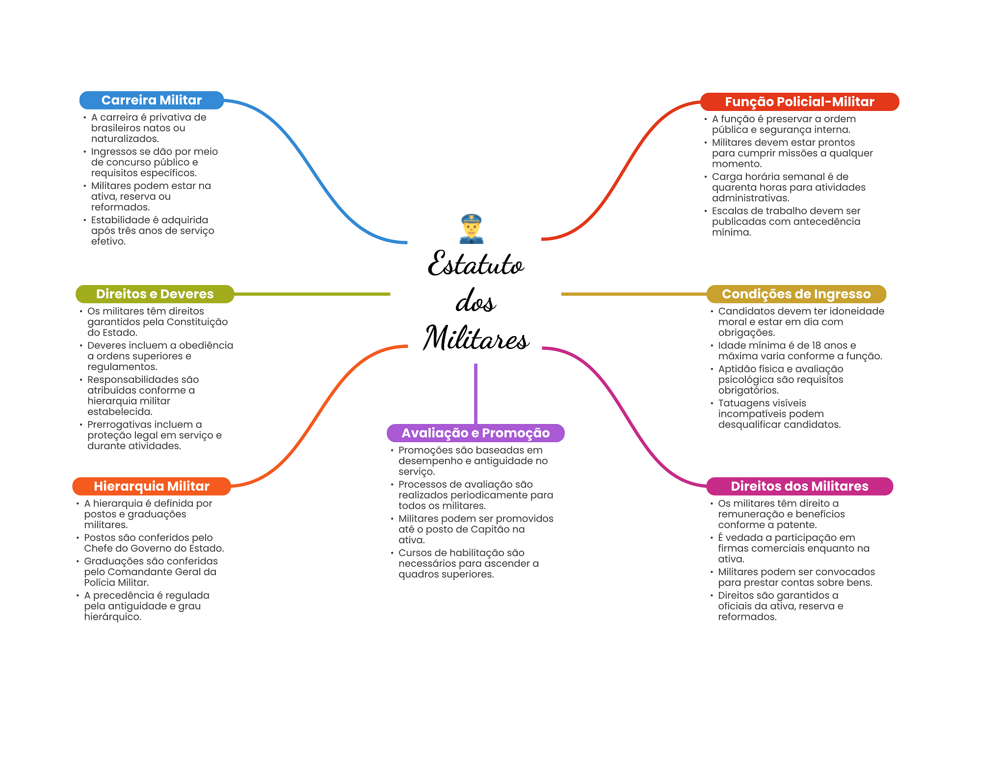 Carreira Militar Função Policial-Militar A carreira é privativa de A função é preservar a ordem brasileiros natos ou pública e segurança interna. naturalizados. Militares devem estar prontos Ingressos se dão por meio para cumprir missões a qualquer de concurso público e momento. requisitos específicos. Carga horária semanal é de Militares podem estar na quarenta horas para atividades ativa, reserva ou administrativas. reformados. Escalas de trabalho devem ser Estabilidade é adquirida publicadas com antecedência após três anos de serviço mínima. efetivo. Estatuto Direitos e Deveres dos Condições de Ingresso Os militares têm direitos Candidatos devem ter idoneidade garantidos pela Constituição moral e estar em dia com do Estado. Militares obrigações. Deveres incluem a obediência Idade mínima é de 18 anos e a ordens superiores e máxima varia conforme a função. regulamentos. Aptidão física e avaliação Responsabilidades são psicológica são requisitos atribuídas conforme a obrigatórios. hierarquia militar Tatuagens visíveis estabelecida. incompatíveis podem Prerrogativas incluem a desqualificar candidatos. proteção legal em serviço e Avaliação e Promoção durante atividades. Promoções são baseadas em desempenho e antiguidade no serviço. Hierarquia Militar Processos de avaliação são Direitos dos Militares realizados periodicamente para A hierarquia é definida por todos OS militares. Os militares têm direito a postos e graduações Militares podem ser promovidos remuneração e benefícios militares. até posto de Capitão na conforme a patente. Postos são conferidos pelo ativa. É vedada a participação em Chefe do Governo do Estado. Cursos de habilitação são firmas comerciais enquanto na Graduações são conferidas ativa. necessários para ascender a pelo Comandante Geral da quadros superiores. Militares podem ser convocados Polícia Militar. para prestar contas sobre bens. A precedência é regulada Direitos são garantidos a pela antiguidade e grau oficiais da ativa, reserva e hierárquico. reformados.