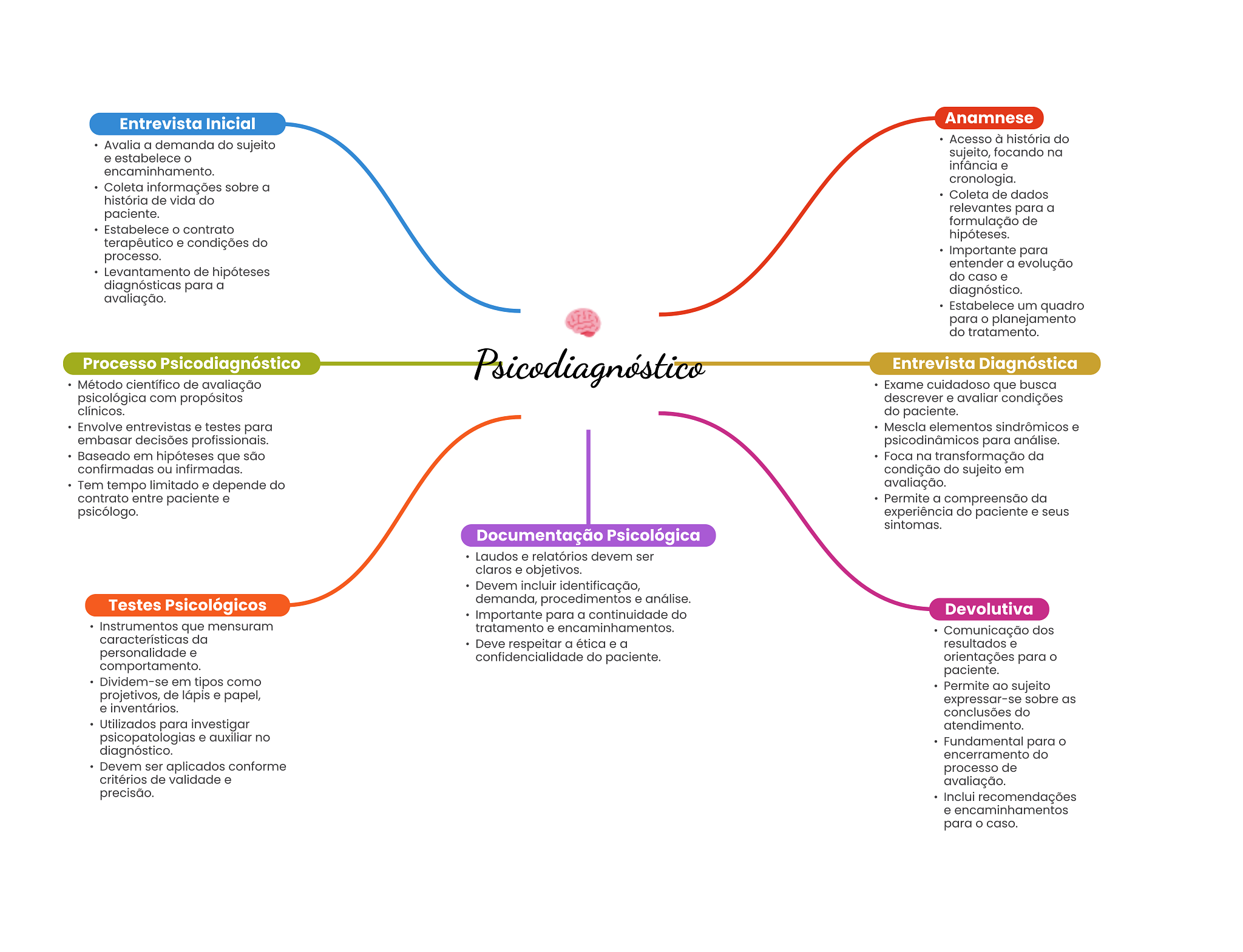 Entrevista Inicial Anamnese Acesso à história do Avalia a demanda do sujeito e estabelece sujeito, focando na infância e encaminhamento. cronologia. Coleta informações sobre a história de vida do Coleta de dados paciente. relevantes para a formulação de Estabelece contrato hipóteses. terapêutico e condições do Importante para processo. entender a evolução Levantamento de hipóteses do caso e diagnósticas para a diagnóstico. avaliação. Estabelece um quadro para planejamento do tratamento. Processo Psicodiagnóstico Psicodiagnóstico Entrevista Diagnóstica Método científico de avaliação Exame cuidadoso que busca psicológica com propósitos descrever e avaliar condições clínicos. do paciente. Envolve entrevistas e testes para Mescla elementos sindrômicos e embasar decisões profissionais. psicodinâmicos para análise. Baseado em hipóteses que são Foca na transformação da confirmadas ou infirmadas. condição do sujeito em Tem tempo limitado e depende do avaliação. contrato entre paciente e Permite a compreensão da psicólogo. experiência do paciente e seus sintomas. Documentação Psicológica Laudos e relatórios devem ser claros e objetivos. Devem incluir identificação, Testes Psicológicos demanda, procedimentos e análise. Importante para a continuidade do Devolutiva Instrumentos que mensuram tratamento e encaminhamentos. Comunicação dos características da Deve respeitar a ética e a resultados e personalidade e confidencialidade do paciente. orientações para O comportamento. paciente. Dividem-se em tipos como Permite ao sujeito projetivos, de lápis e papel, expressar-se sobre as e inventários. conclusões do Utilizados para investigar atendimento. psicopatologias e auxiliar no Fundamental para diagnóstico. encerramento do Devem ser aplicados conforme processo de critérios de validade e avaliação. precisão. Inclui recomendações e encaminhamentos para o caso.