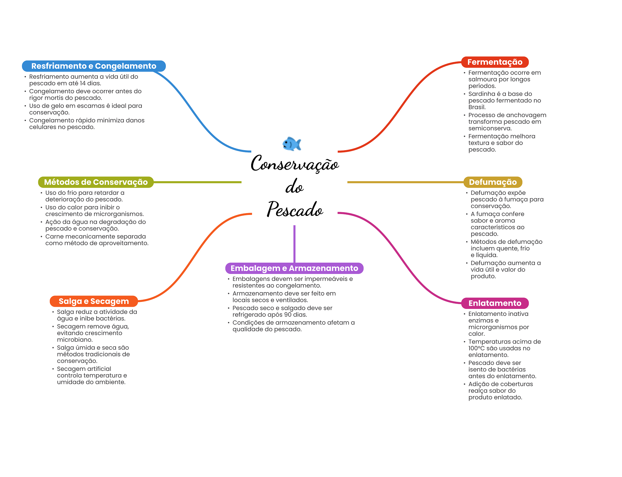 Resfriamento e Congelamento Fermentação Fermentação ocorre em Resfriamento aumenta a vida útil do salmoura por longos pescado em até 14 dias. períodos. Congelamento deve ocorrer antes do Sardinha é a base do rigor mortis do pescado. pescado fermentado no Uso de gelo em escamas é ideal para Brasil. conservação. Processo de anchovagem Congelamento rápido minimiza danos transforma pescado em celulares no pescado. semiconserva. Fermentação melhora textura e sabor do pescado. Conservação Métodos de Conservação do Defumação Uso do frio para retardar a Defumação expõe deterioração do pescado. pescado à fumaça para Uso do calor para inibir Pescado conservação. crescimento de microrganismos. A fumaça confere Ação da água na degradação do sabor e aroma pescado e conservação. característicos ao Carne mecanicamente separada pescado. como método de aproveitamento. Métodos de defumação incluem quente, frio e líquida. Defumação aumenta a Embalagem e Armazenamento vida útil e valor do Embalagens devem ser e produto. resistentes ao congelamento. Armazenamento deve ser feito em Salga e Secagem locais secos e ventilados. Enlatamento Pescado seco e salgado deve ser Salga reduz a atividade da refrigerado após 90 dias. Enlatamento inativa água e inibe bactérias. Condições de armazenamento afetam a enzimas e Secagem remove água, qualidade do pescado. microrganismos por evitando crescimento calor. microbiano. Temperaturas acima de Salga úmida e seca são 100°C são usadas no métodos tradicionais de enlatamento. conservação. Pescado deve ser Secagem artificial isento de bactérias controla temperatura e antes do enlatamento. umidade do ambiente. Adição de coberturas realça sabor do produto enlatado.
