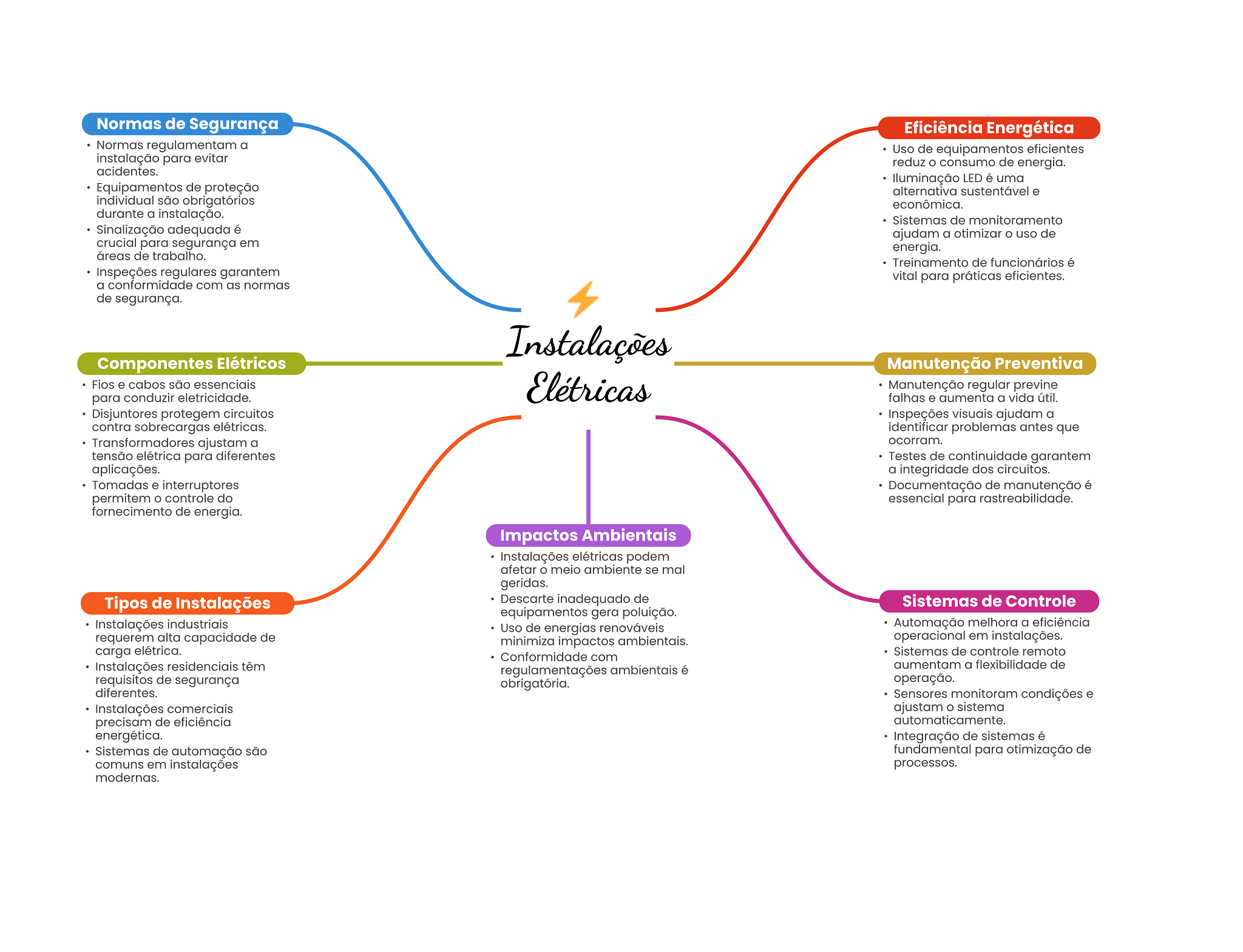 Normas de Segurança Eficiência Energética Normas regulamentam a Uso de equipamentos eficientes instalação para evitar reduz consumo de energia. acidentes. LED é uma Equipamentos de proteção alternativa sustentável e individual são obrigatórios econômica. durante a instalação. Sistemas de monitoramento Sinalização adequada é ajudam a otimizar uso de crucial para segurança em energia. áreas de trabalho. Treinamento de funcionários é Inspeções regulares garantem vital para práticas eficientes. a conformidade com as normas de segurança. Instalações Componentes Elétricos Manutenção Preventiva Fios e cabos são essenciais Elétricas Manutenção regular previne para conduzir eletricidade. falhas e aumenta a vida útil. Disjuntores protegem circuitos Inspeções visuais ajudam a contra sobrecargas elétricas. identificar problemas antes que Transformadores ajustam a ocorram. tensão elétrica para diferentes Testes de continuidade garantem aplicações. a integridade dos circuitos. Tomadas e interruptores Documentação de manutenção é permitem controle do essencial para rastreabilidade. fornecimento de energia. Impactos Ambientais Instalações elétricas podem afetar meio ambiente se mal geridas. Tipos de Instalações Descarte inadequado de Sistemas de Controle equipamentos gera poluição. Instalações industriais Uso de energias renováveis Automação melhora a eficiência requerem alta capacidade de minimiza impactos ambientais. operacional em instalações. carga elétrica. Conformidade com Sistemas de controle remoto Instalações residenciais têm aumentam a flexibilidade de regulamentações ambientais é requisitos de segurança obrigatória. operação. diferentes. Sensores monitoram condições e Instalações comerciais ajustam O sistema precisam de eficiência automaticamente. energética. Integração de sistemas é Sistemas de automação são fundamental para otimização de comuns em instalações processos. modernas.