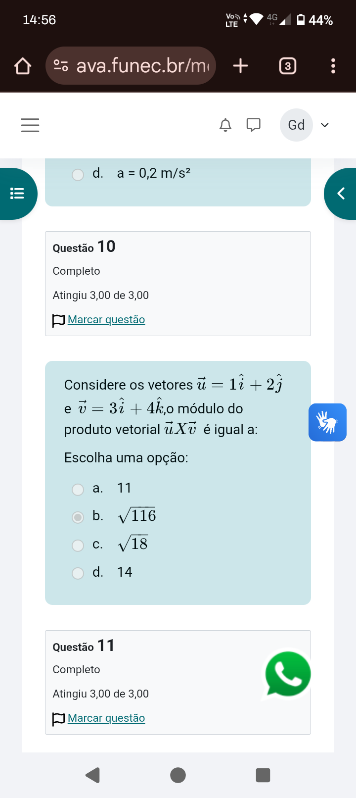 14:56 4G LTE ++ 44% ava.funec.br/m + 3 Gd > d. a = 0,2 Questão 10 Completo Atingiu 3,00 de 3,00 Marcar questão Considere os vetores = + 2ⱼ e = 3i + módulo do produto vetorial é igual a: Escolha uma opção: a. 11 b. d. 14 Questão 11 Completo Atingiu 3,00 de 3,00 Marcar questão