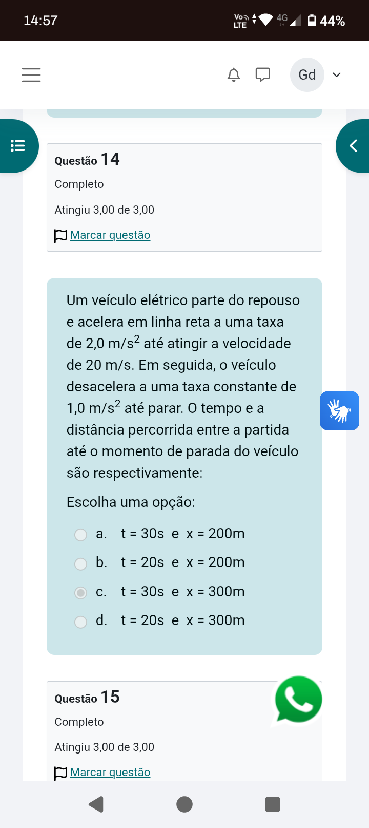 14:57 4G LTE 44% Gd Questão 14 Completo Atingiu 3,00 de 3,00 Marcar questão Um veículo elétrico parte do repouso e acelera em linha reta a uma taxa de 2,0 até atingir a velocidade de 20 m/s. Em seguida, veículo desacelera a uma taxa constante de 1,0 m/s² até parar. 0 tempo e a distância percorrida entre a partida até o momento de parada do veículo são respectivamente: Escolha uma opção: a. t = 30s e X = 200m b. t = 20s e X = 200m t = 30s e X = 300m Questão 15 Completo Atingiu 3,00 de 3,00 Marcar questão