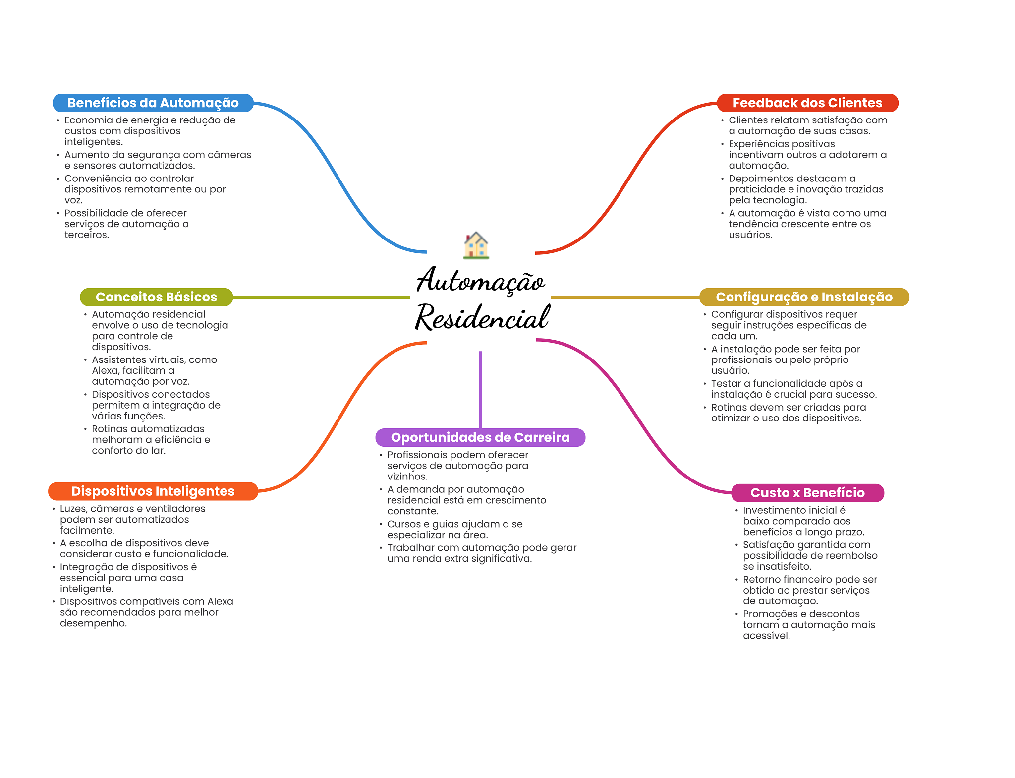 Benefícios da Automação Feedback dos Clientes Economia de energia e redução de Clientes relatam satisfação com custos com dispositivos a automação de suas casas. inteligentes. Experiências positivas Aumento da segurança com câmeras incentivam outros a adotarem a e sensores automatizados. automação. Conveniência ao controlar Depoimentos destacam a dispositivos remotamente ou por praticidade e inovação trazidas voz. pela tecnologia. Possibilidade de oferecer A automação é vista como uma serviços de automação a tendência crescente entre terceiros. usuários. Automação Conceitos Básicos Configuração e Instalação Automação residencial Residencial Configurar dispositivos requer envolve uso de tecnologia seguir instruções específicas de para controle de cada um. dispositivos. A instalação pode ser feita por Assistentes virtuais, como profissionais ou pelo próprio Alexa, facilitam a usuário. automação por Testar a funcionalidade após a Dispositivos conectados instalação é crucial para sucesso. permitem a integração de Rotinas devem ser criadas para várias funções. otimizar uso dos dispositivos. Rotinas automatizadas melhoram a eficiência e Oportunidades de Carreira conforto do lar. Profissionais podem oferecer serviços de automação para vizinhos. Dispositivos Inteligentes A demanda por automação Custo Benefício residencial está em crescimento Luzes, câmeras e ventiladores constante. Investimento inicial é podem ser automatizados facilmente. Cursos e guias ajudam a se baixo comparado aos especializar na área. benefícios a longo prazo. A escolha de dispositivos deve Trabalhar com automação pode gerar Satisfação garantida com considerar custo e funcionalidade. uma renda extra significativa. possibilidade de reembolso Integração de dispositivos é se insatisfeito. essencial para uma casa Retorno financeiro pode ser inteligente. obtido ao prestar serviços Dispositivos compatíveis com Alexa de automação. são recomendados para melhor Promoções e descontos desempenho. tornam a automação mais acessível.