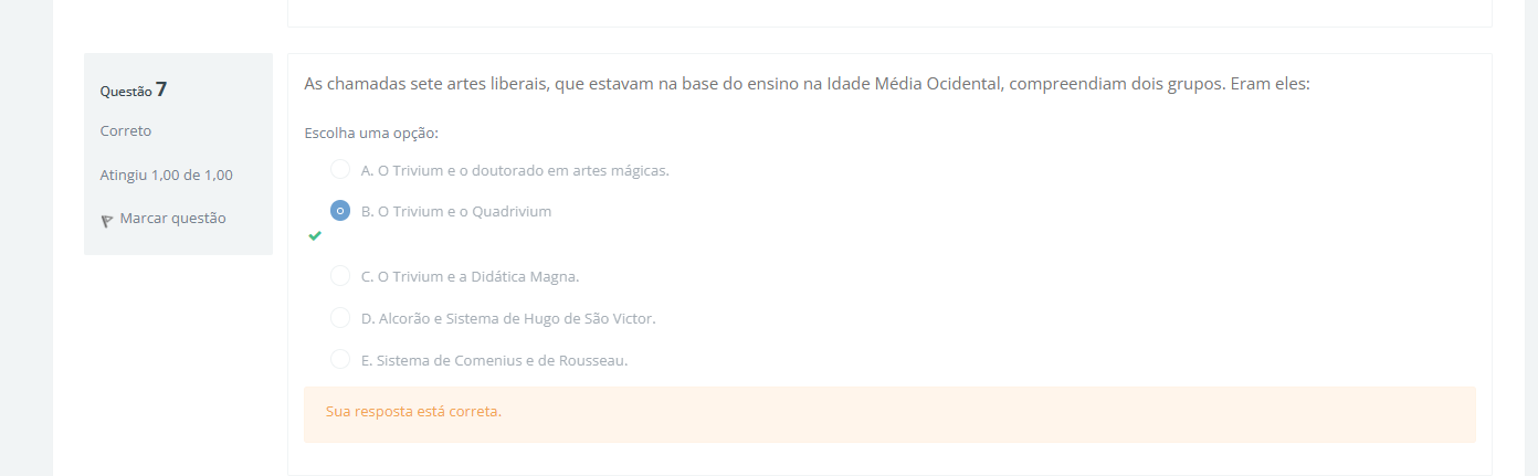 Questão 7 As chamadas sete artes liberais, que estavam na base do ensino na Idade Média Ocidental, compreendiam dois grupos. Eram eles: Correto Escolha uma opção: Atingiu 1,00 de 1,00 A. O Trivium e doutorado em artes mágicas. Marcar questão B. O Trivium e Quadrivium C. O Trivium e a Didática Magna. D. Alcorão e Sistema de Hugo de São Victor. E. Sistema de Comenius e de Rousseau. Sua resposta está correta.
