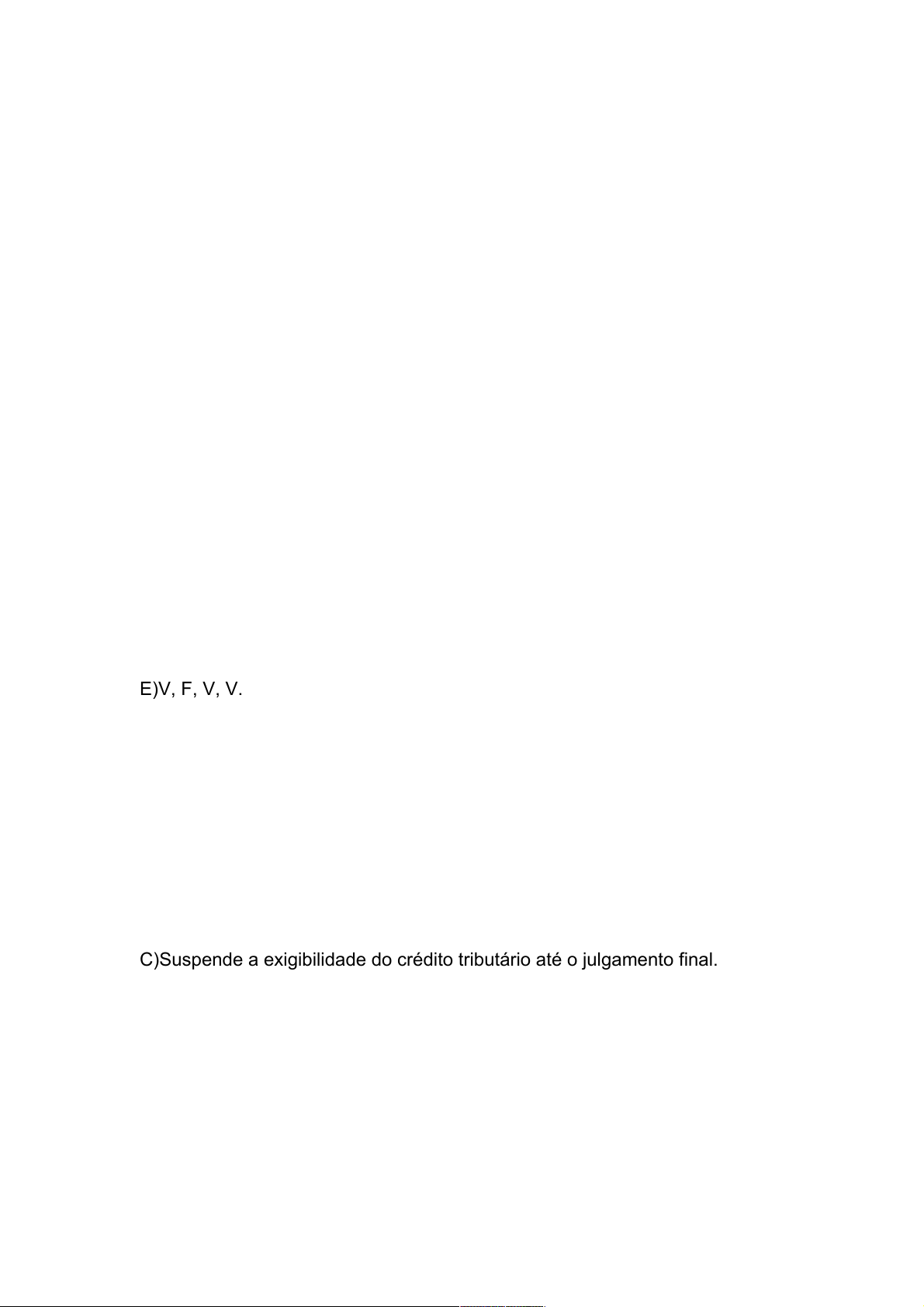 1 1 QUESTÕES DIREITO TRIBUTÁRIO – PROCESSO TRIBUTÁRIO 1) O Processo Administrativo Tributário regula a atividade voltada à resolução de conflitos existentes entre os sujeitos da relação jurídico-tributária no âmbito administrativo. Analise as afirmativas abaixo sobre o Processo Administrativo Tributário e marque (V) para verdadeiro ou (F) para falso. (__)O Processo Administrativo Tributário tem como objetivo resolver litígios entre a Administração Tributária e os contribuintes de forma administrativa, evitando a judicialização. (__)No Processo Administrativo Tributário, o contribuinte não possui o direito de apresentar provas ou documentos que sustentem sua defesa. (__)A decisão final do Processo Administrativo Tributário pode ser revista no Judiciário, se o contribuinte não concordar com o resultado. (__)O Processo Administrativo Tributário deve seguir os princípios da ampla defesa e do contraditório, garantindo que o contribuinte tenha a oportunidade de se manifestar. A seguir assinale a alternativa com a ordem correta de cima para baixo: Alternativas A)V, F, V, F. B)F, V, V, F. C)F, F, V, V. D)V, V, F, F. E)V, F, V, V. Justifique a sua resposta ______________________________________________________________ ______________________________________________________________ 2) No âmbito do processo administrativo tributário, o julgamento de impugnações à exigência do crédito tributário em primeira instância administrativa: Alternativas A)Pode ser feito exclusivamente pelo Ministro da Fazenda. B)É de competência exclusiva dos tribunais administrativos superiores. C)Suspende a exigibilidade do crédito tributário até o julgamento final. D)Não pode modificar o lançamento fiscal efetuado pela autoridade tributária. E)Requer, necessariamente, a apresentação de garantia pelo contribuinte. Justifique a sua resposta ______________________________________________________________ ______________________________________________________________ Rebeca Aguiar Realce Rebeca Aguiar Realce 2 2 3) Referente ao processo administrativo tributário, podemos afirmar que: Alternativas A)A primeira instância é representada pelo Prefeito Municipal. B)A Segunda instância é representada pelo Secretário de Finanças. C)A primeira instância é representada pelo Fiscal Tributário. D)A primeira instância é representada pelo Secretário de Finanças. Justifique a sua resposta ______________________________________________________________ ______________________________________________________________ 4) O Auto de Infração é um documento, realizado pela autoridade da Administração Tributária, que instaura o Processo Administrativo Fiscal (PAF) quando há a constatação, por um de seus agentes, de infração à legislação tributária pelo contribuinte. A impugnação da exigência instaura a fase litigiosa do procedimento. Em relação ao que deverá ser mencionado na impugnação, marque V para as afirmativas verdadeiras e F para as falsas. ( ) A autoridade julgadora a quem é dirigida. ( ) A qualificação do impugnante. ( ) Os motivos de fato e de direito em que se fundamenta, os pontos de discordância e as razões e provas que possui. ( ) As diligências, ou perícias que o impugnante pretenda que sejam efetuadas, expostos os motivos que as justifiquem, com a formulação dos quesitos referentes aos exames desejados, assim como, no caso de perícia, o nome, o endereço e a qualificação profissional do seu perito. ( ) Se a matéria impugnada foi submetida à apreciação judicial, devendo ser juntada cópia da petição. A sequência está correta em Alternativas A)V, V, V, V, V. B)V, V, F, F, F. C)V, F, V, V, F. D)F, V, F, F, Justifique a sua resposta ______________________________________________________________ ______________________________________________________________ Rebeca Aguiar Realce Rebeca Aguiar Realce 3 3 5) Segundo a lei nº 9.784/99 quais são os direitos dos administrados? E os deveres? ______________________________________________________________ ______________________________________________________________ 6) A empresa XYZ S/A, ao ser informada sobre a cobrança administrativa do imposto municipal sobre serviços (ISS) referente a valores que considera serem provenientes de licenciamento de sua propriedade intelectual, decide contestar o lançamento tributário. Para isso, ela resolve ajuizar uma ação com o intuito de desconstituir o lançamento e se utilizar de todas as provas permitidas por lei. Nesse contexto, assinale a alternativa que contenha corretamente a ação judicial mais adequada para a empresa: Alternativas A)Ação de cobrança. B)Mandado de segurança. C)Ação Anulatória de Lançamento Tributário. D)Ação Declaratória de Inexistência de Relação Jurídico-Tributária. E)Embargos à execução fiscal. Justifique a sua resposta ______________________________________________________________ ______________________________________________________________ 7) O processo judicial tributário é uma forma de fiscalização do Poder Judiciário para verificar se a Administração Pública está agindo de acordo com a lei na cobrança de tributos. Assinale a alternativa correspondente a ação judicial tributária caracterizada por ser uma ação antiexacional* por ser manejada pelo contribuinte na condição de autor com a finalidade de obter o controle judicial da atividade fiscal do Estado. Alternativas A)Ação de substituição. B)Ação anulatória. C)Ação declaratória. D)Ação eletiva. *Uma ação antiexacional é um tipo de ação judicial utilizada pelo contribuinte com o objetivo de impedir ou limitar a cobrança de tributos por parte da Administração Pública. Justifique a sua resposta ______________________________________________________________ ______________________________________________________________ Rebeca Aguiar Realce Rebeca Aguiar Realce 4 4 8) O processo judicial tributário é um mecan