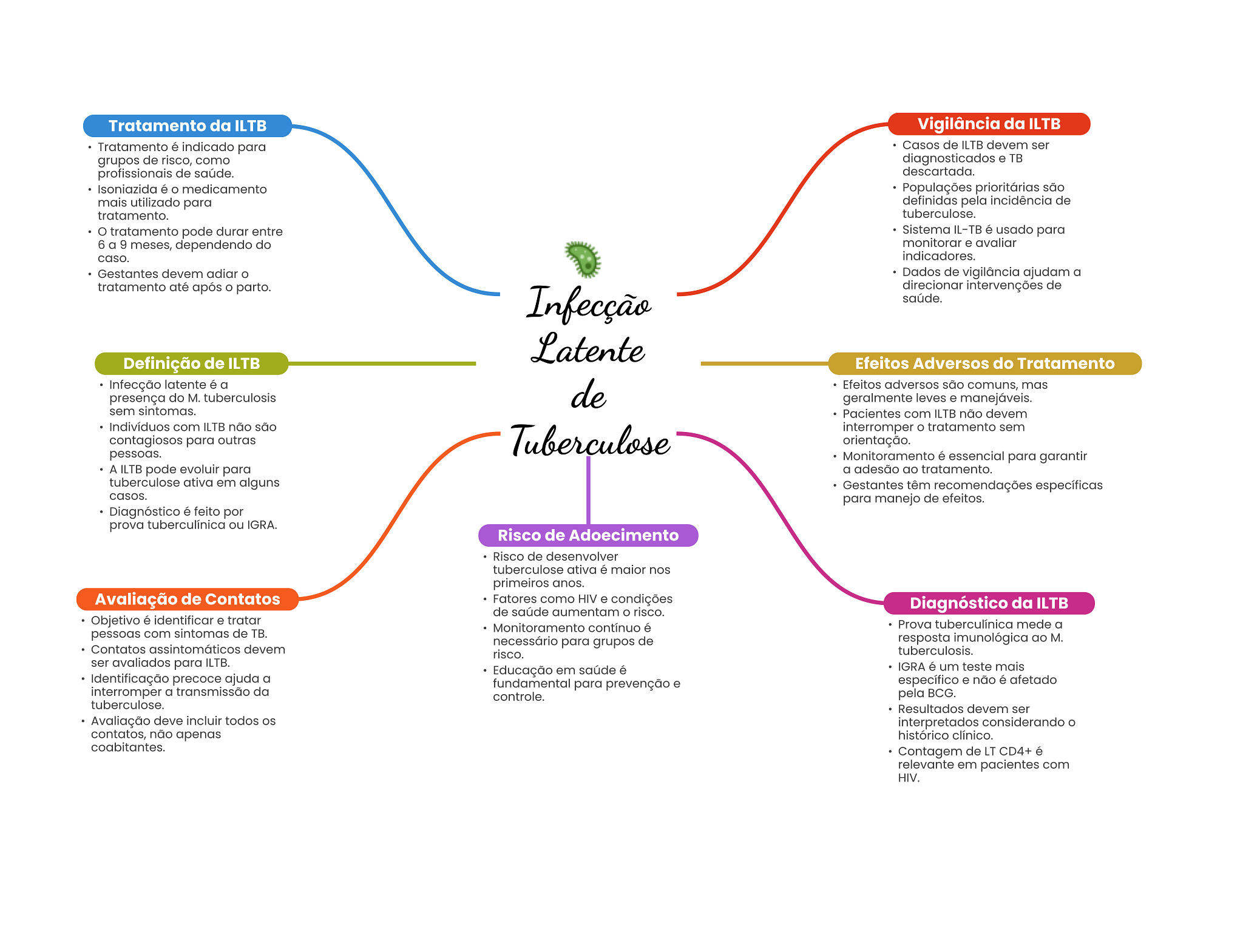 Tratamento da ILTB Vigilância da ILTB Tratamento é indicado para Casos de ILTB devem ser grupos de risco, como diagnosticados e TB profissionais de saúde. descartada. Isoniazida é medicamento Populações prioritárias são mais utilizado para definidas pela incidência de tratamento. tuberculose. tratamento pode durar entre Sistema IL-TB é usado para 6 a 9 meses, dependendo do monitorar e avaliar caso. indicadores. Gestantes devem adiar Dados de vigilância ajudam a tratamento até após parto. direcionar intervenções de saúde. Latente Definição de ILTB Efeitos Adversos do Tratamento Infecção latente é a presença do M. tuberculosis de Efeitos adversos são comuns, mas geralmente leves e manejáveis. sem sintomas. Pacientes com ILTB não devem Indivíduos com ILTB não são contagiosos para outras Tuberculose interromper tratamento sem orientação. pessoas. Monitoramento é essencial para garantir A ILTB pode evoluir para a adesão ao tratamento. tuberculose ativa em alguns Gestantes têm recomendações específicas casos. para manejo de efeitos. Diagnóstico é feito por prova tuberculínica ou IGRA. Risco de Adoecimento Risco de desenvolver tuberculose ativa é maior nos primeiros anos. Avaliação de Contatos Fatores como HIV e condições de saúde aumentam risco. Diagnóstico da ILTB Objetivo é identificar e tratar Monitoramento contínuo é Prova tuberculínica mede a pessoas com sintomas de necessário para grupos de resposta imunológica ao M. Contatos assintomáticos devem risco. tuberculosis. ser avaliados para ILTB. Educação em saúde é IGRA é um teste mais Identificação precoce ajuda a fundamental para prevenção e específico e não é afetado interromper a transmissão da controle. pela BCG. tuberculose. Resultados devem ser Avaliação deve incluir todos interpretados considerando contatos, não apenas histórico clínico. coabitantes. Contagem de LT CD4+ é relevante em pacientes com HIV.