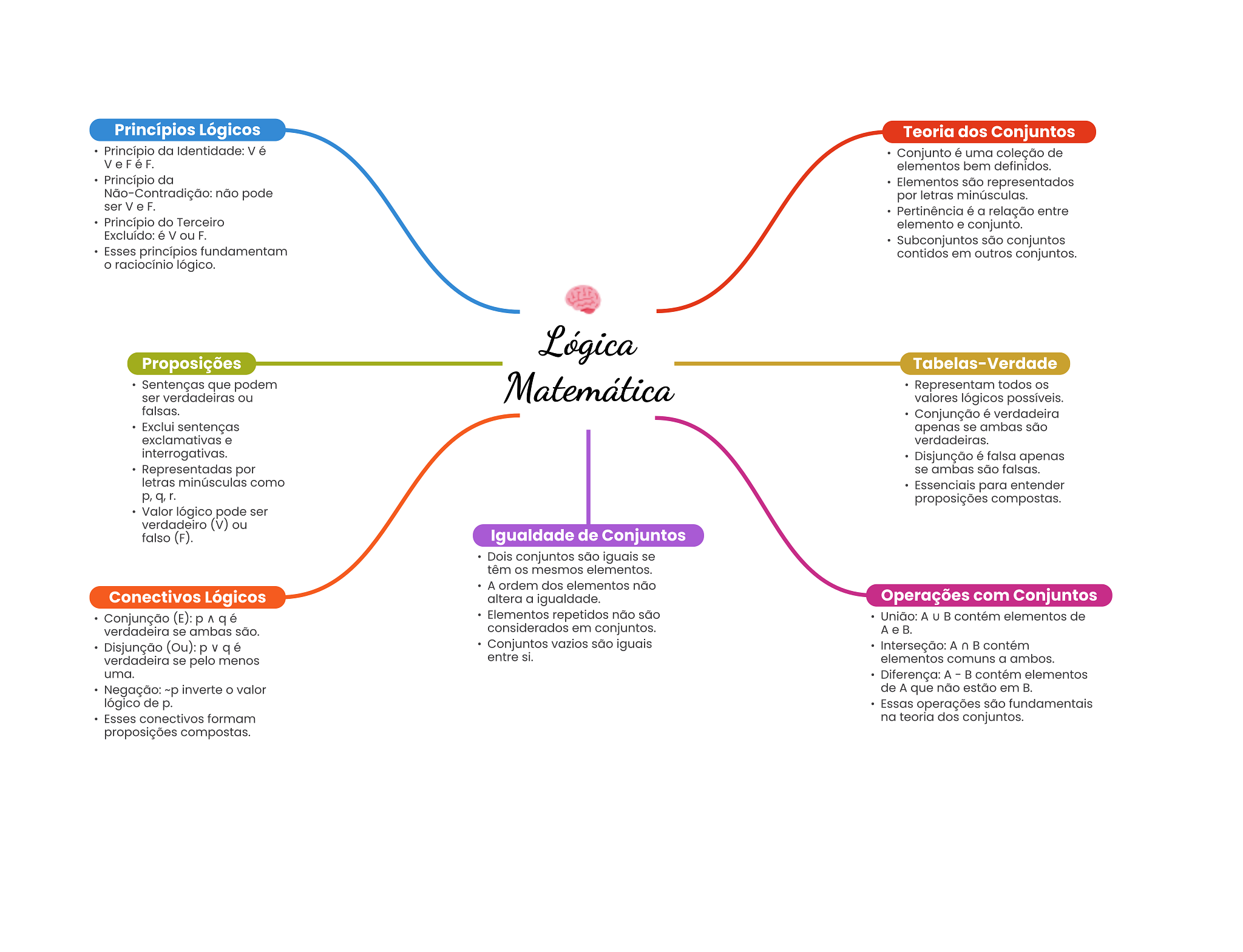Princípios Lógicos Teoria dos Conjuntos Princípio da Identidade: Conjunto é uma coleção de elementos bem definidos. Princípio da Elementos são representados Não-Contradição: não pode por letras minúsculas. ser Pertinência é a relação entre Princípio do Terceiro elemento e conjunto. Excluído: é V ou F. Subconjuntos são conjuntos Esses princípios fundamentam contidos em outros conjuntos. raciocínio lógico. Lógica Proposições Tabelas-Verdade Sentenças que podem ser verdadeiras ou Matemática Representam todos os valores lógicos possíveis. falsas. Conjunção é verdadeira Exclui sentenças apenas se ambas são exclamativas e verdadeiras. interrogativas. Disjunção é falsa apenas Representadas por se ambas são falsas. letras minúsculas como Essenciais para entender p,q,r. proposições compostas. Valor lógico pode ser verdadeiro (v) ou falso (F). Igualdade de Conjuntos Dois conjuntos são iguais se têm OS mesmos elementos. A ordem dos elementos não Conectivos Lógicos altera a igualdade. Operações com Conjuntos Conjunção (E): p Elementos repetidos não são União: A U B contém elementos de verdadeira se ambas são. considerados em conjuntos. A e B. Disjunção pvqé Conjuntos vazios são iguais Interseção: A n B contém verdadeira se pelo menos entre si. elementos comuns a ambos. uma. Diferença: A B contém elementos Negação: ~p inverte valor de A que não estão em B. lógico de Essas operações são fundamentais Esses conectivos formam na teoria dos conjuntos. proposições compostas.