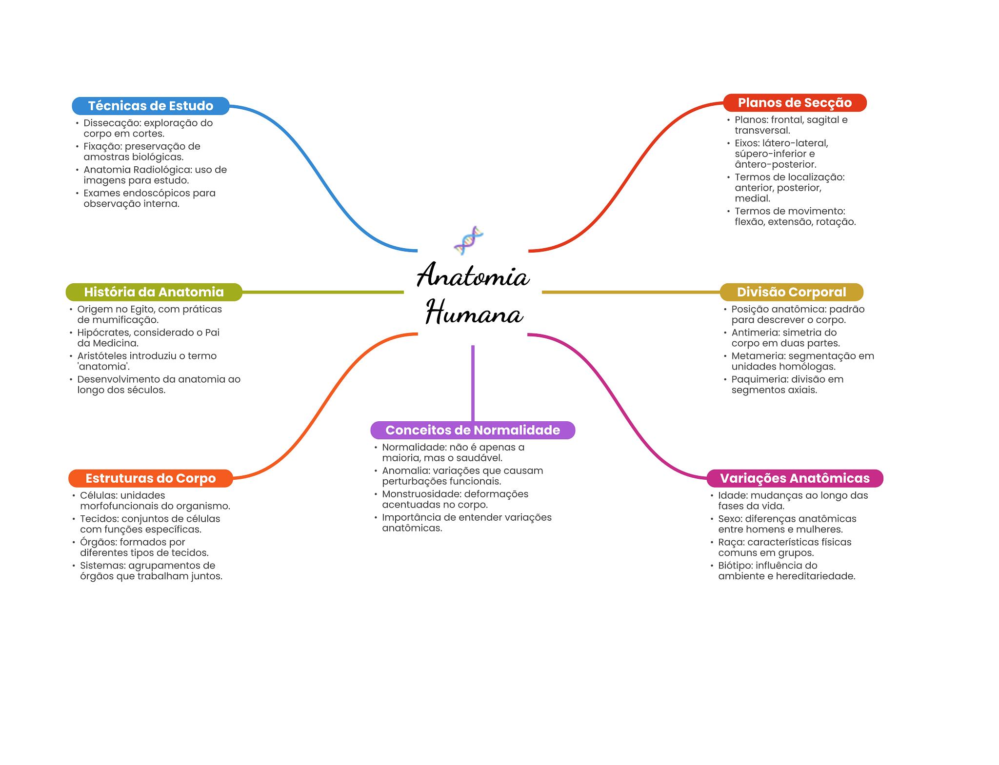 Técnicas de Estudo Planos de Secção Dissecação: exploração do Planos: frontal, sagital e corpo em cortes. transversal. Fixação: preservação de Eixos: látero-lateral, amostras biológicas. súpero-inferior e Anatomia Radiológica: uso de ântero-posterior. imagens para estudo. Termos de localização: Exames endoscópicos para anterior, posterior, medial. observação interna. Termos de movimento: flexão, extensão, rotação. Anatomia História da Anatomia Divisão Corporal Origem no Egito, com práticas Humana Posição anatômica: padrão de mumificação. para descrever O corpo. Hipócrates, considerado Pai Antimeria: simetria do da Medicina. corpo em duas partes. Aristóteles introduziu termo Metameria: segmentação em anatomia'. unidades homólogas. Desenvolvimento da anatomia ao Paquimeria: divisão em longo dos séculos. segmentos axiais. Conceitos de Normalidade Normalidade: não é apenas a maioria, mas saudável. Anomalia: variações que causam Estruturas do Corpo perturbações funcionais. Variações Anatômicas Células: unidades Monstruosidade: deformações Idade: mudanças ao longo das morfofuncionais do organismo. acentuadas no corpo. fases da vida. Tecidos: conjuntos de células Importância de entender variações Sexo: diferenças anatômicas com funções específicas. anatômicas. entre homens e mulheres. Órgãos: formados por Raça: características físicas diferentes tipos de tecidos. comuns em grupos. Sistemas: agrupamentos de Biótipo: influência do órgãos que trabalham juntos. ambiente e hereditariedade.