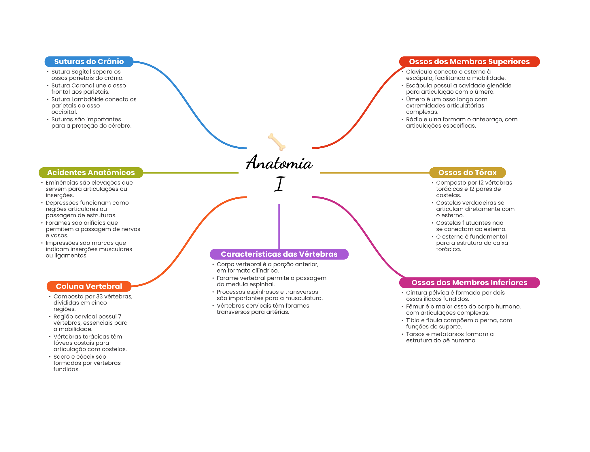 Suturas do Crânio Ossos dos Membros Superiores Sutura Sagital separa OS Clavícula conecta o esterno à OSSOS parietais do crânio. escápula, facilitando a mobilidade. Sutura Coronal une O OSSO Escápula possui a cavidade glenóide frontal aos parietais. para articulação com úmero. Sutura Lambdóide conecta OS Úmero é um longo com parietais ao extremidades articulatórias occipital. complexas. Suturas são importantes Rádio e ulna formam O antebraço, com para a proteção do cérebro. articulações específicas. Anatomia Acidentes Anatômicos Ossos do Tórax Eminências são elevações que I Composto por 12 vértebras servem para articulações ou torácicas e 12 pares de inserções. costelas. Depressões funcionam como Costelas verdadeiras se regiões articulares ou articulam diretamente com passagem de estruturas. esterno. Forames são orifícios que Costelas flutuantes não permitem a passagem de nervos se conectam ao esterno. e vasos. esterno é fundamental Impressões são marcas que para a estrutura da caixa indicam inserções musculares torácica. ou ligamentos. Características das Vértebras Corpo vertebral é a porção anterior, em formato cilíndrico. Forame vertebral permite a passagem da medula espinhal. Ossos dos Membros Inferiores Coluna Vertebral Processos espinhosos e transversos Cintura pélvica é formada por dois Composta por 33 vértebras, são importantes para a musculatura. OSSOS ilíacos fundidos. divididas em cinco Vértebras cervicais têm forames regiões. Fêmur é maior do corpo humano, transversos para artérias. com articulações complexas. Região cervical possui 7 vértebras, essenciais para Tíbia e fíbula compõem a perna, com a mobilidade. funções de suporte. Vértebras torácicas têm Tarsos e metatarsos formam a fóveas costais para estrutura do pé humano. articulação com costelas. Sacro e cóccix são formados por vértebras fundidas.